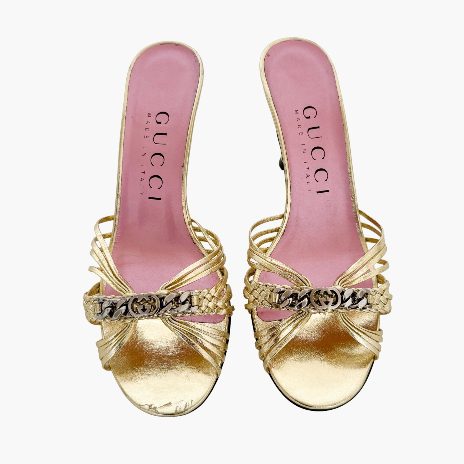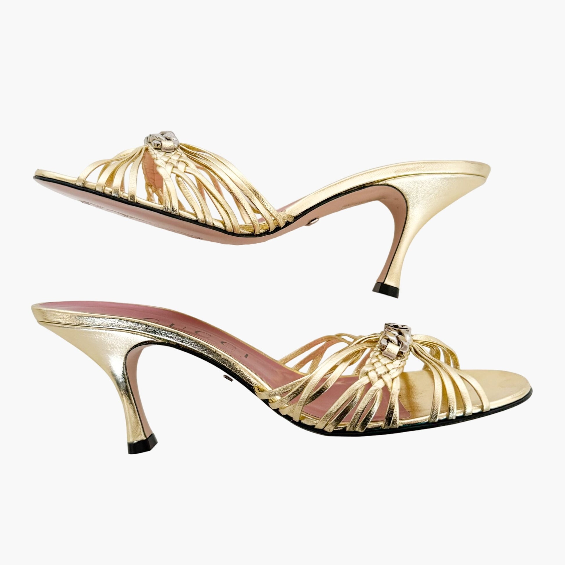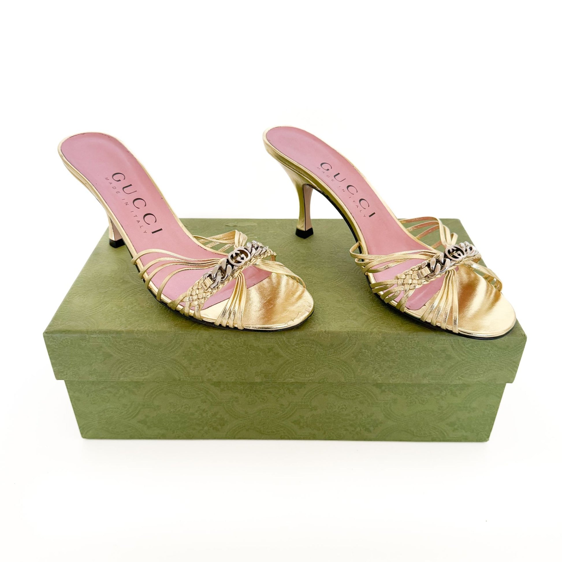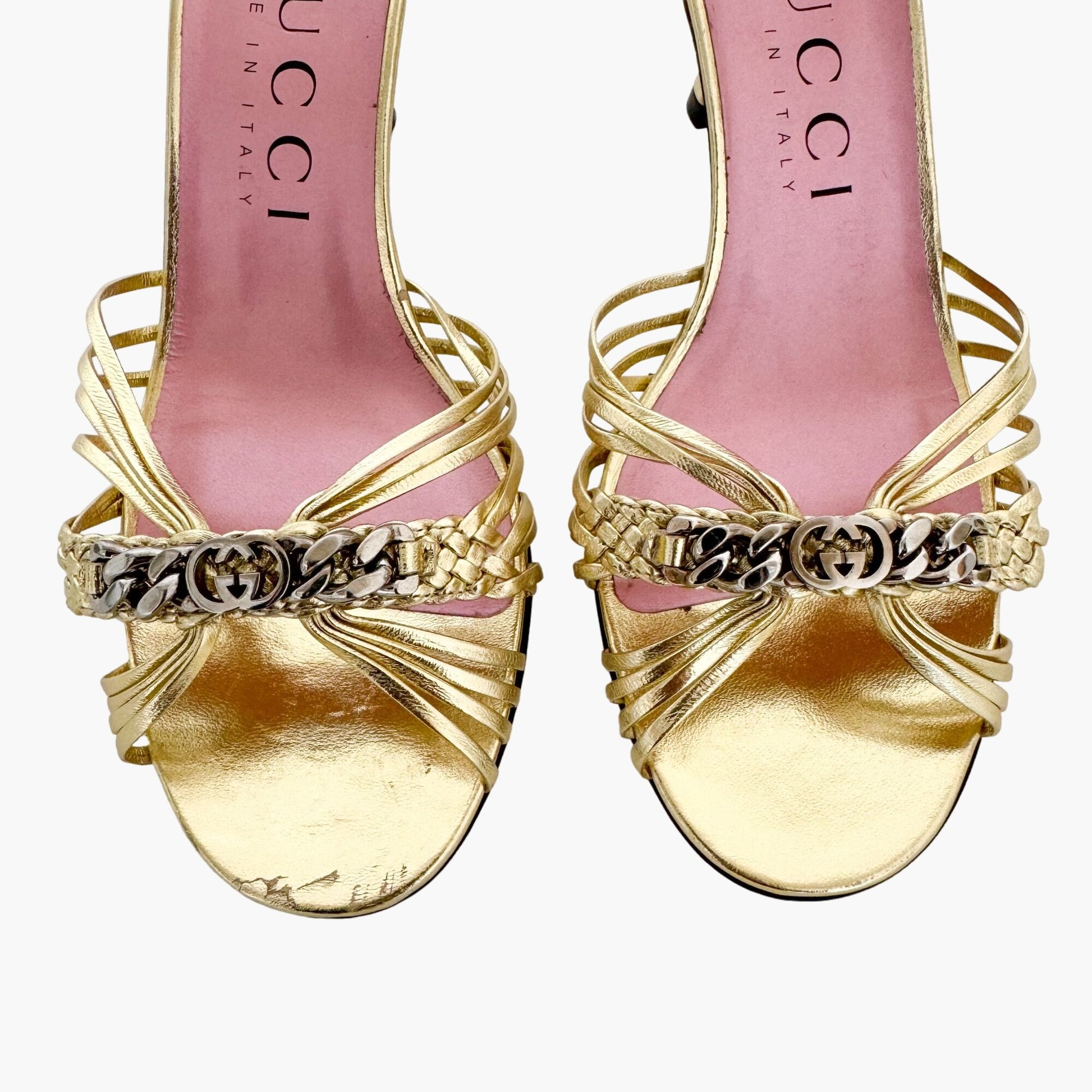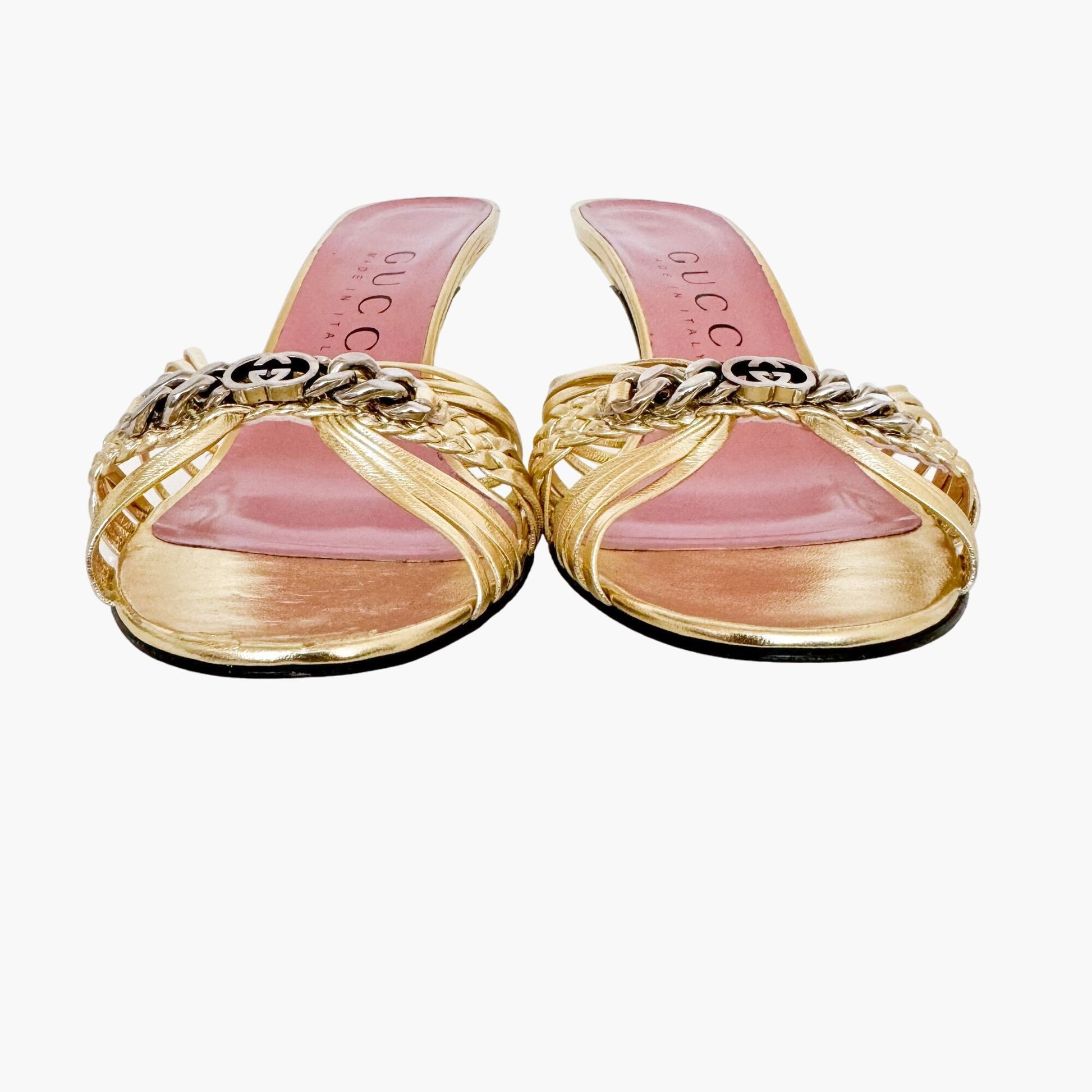 Gucci Interlocking G Braided Mules EU 38 US 8 Metallic Gold Mid High Heel Sandal