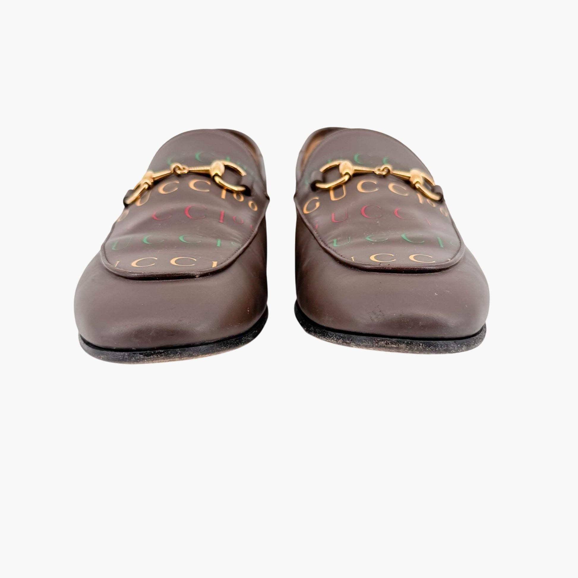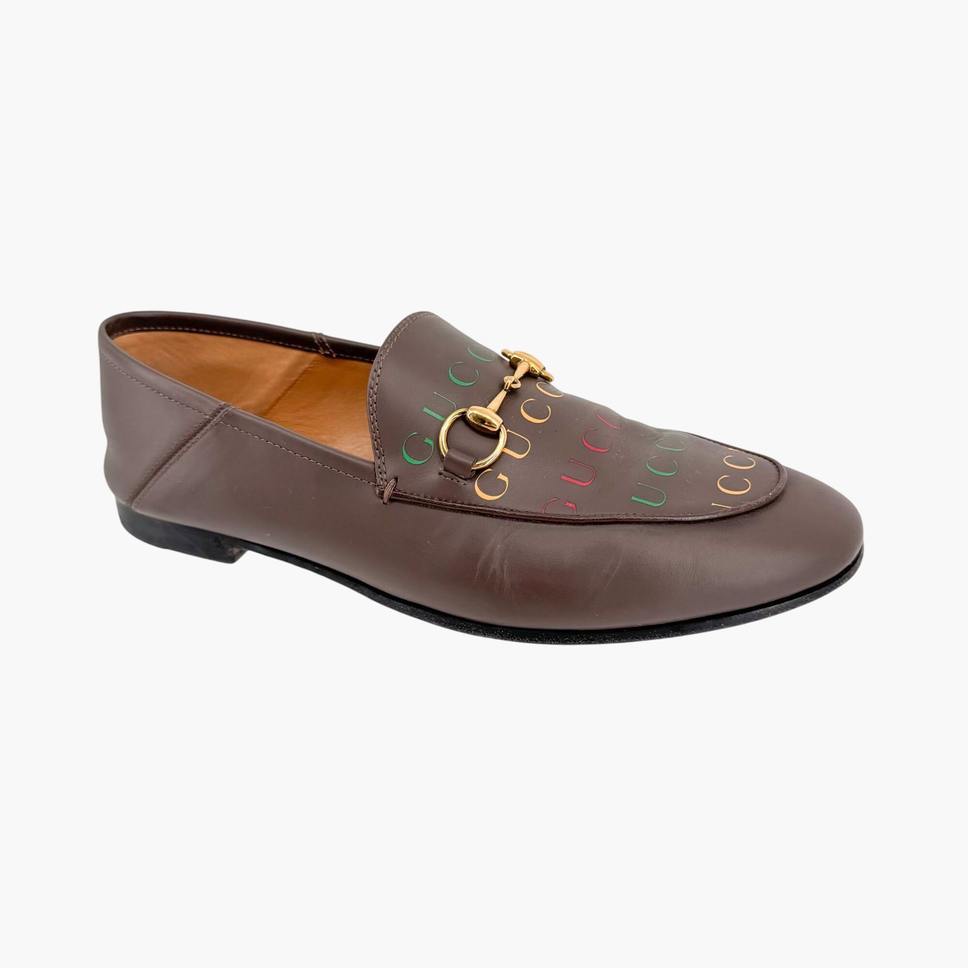 These Gucci Brixton loafers feature brown leather uppers with multicolor logo print, a rounded almond toe, and signature gold-tone Horsebit hardware. Designed with a collapsible heel, they can be worn as either loafers or mules. Finished with a leather lining and outsole, they offer polished ease and versatility.