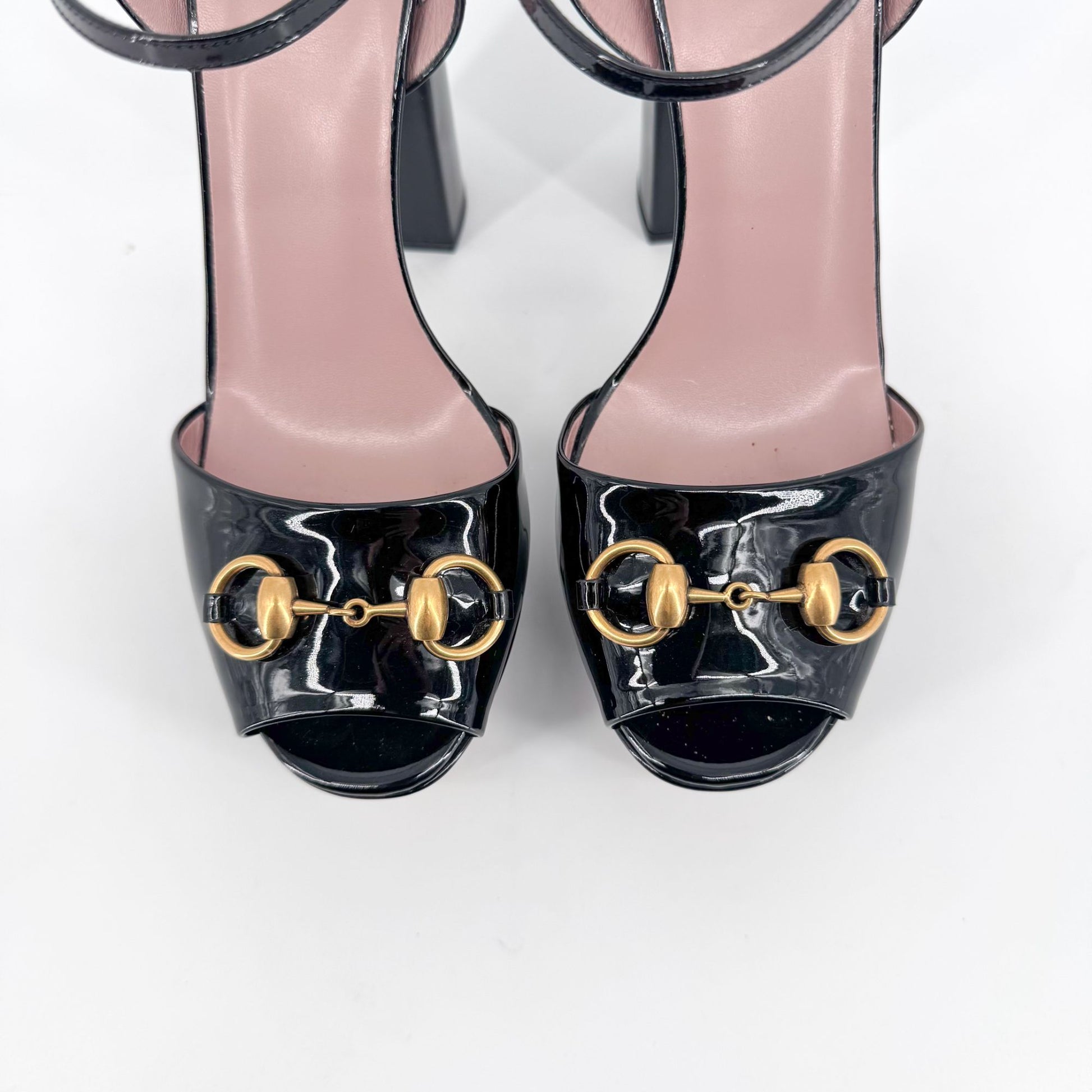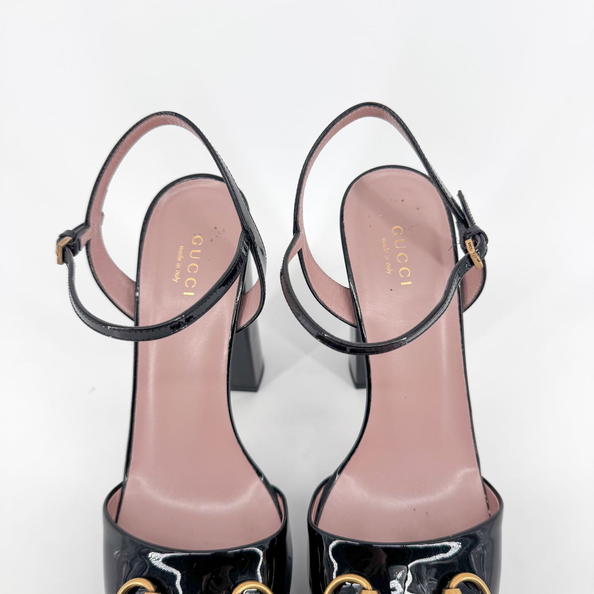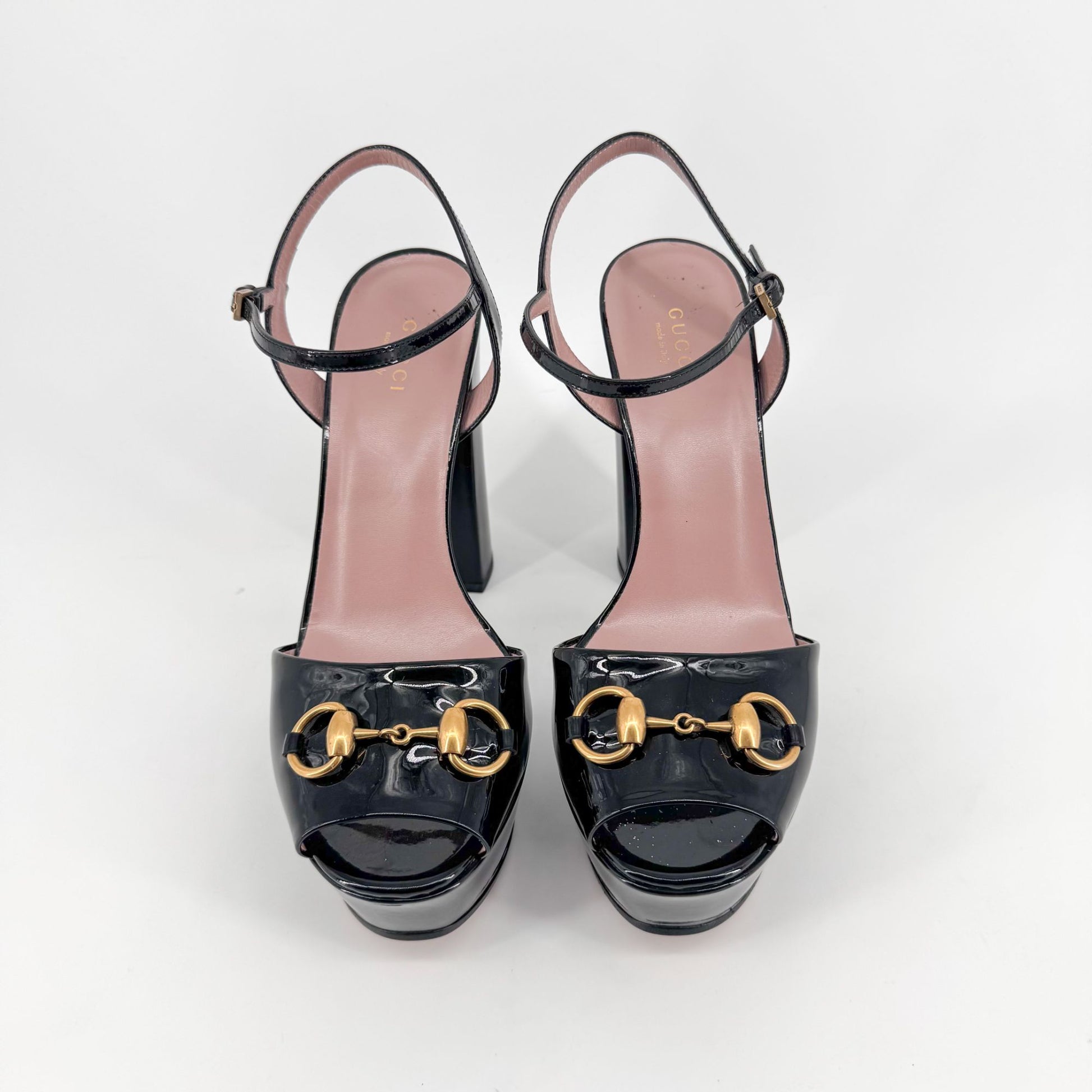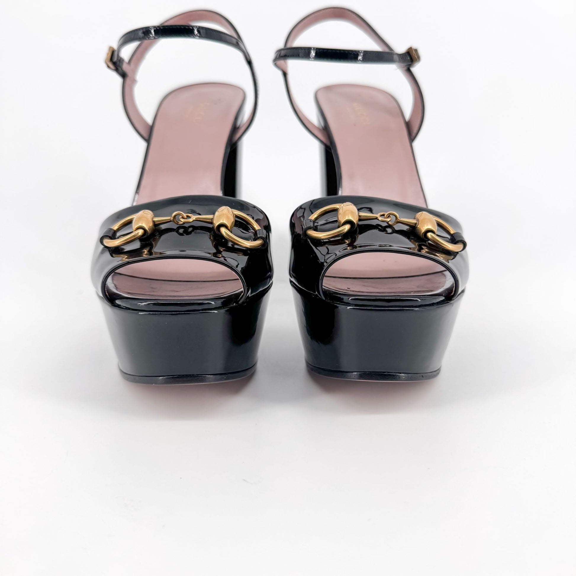 Gucci Claudie Horsebit Platform Heels in Black Patent Leather – Size 38