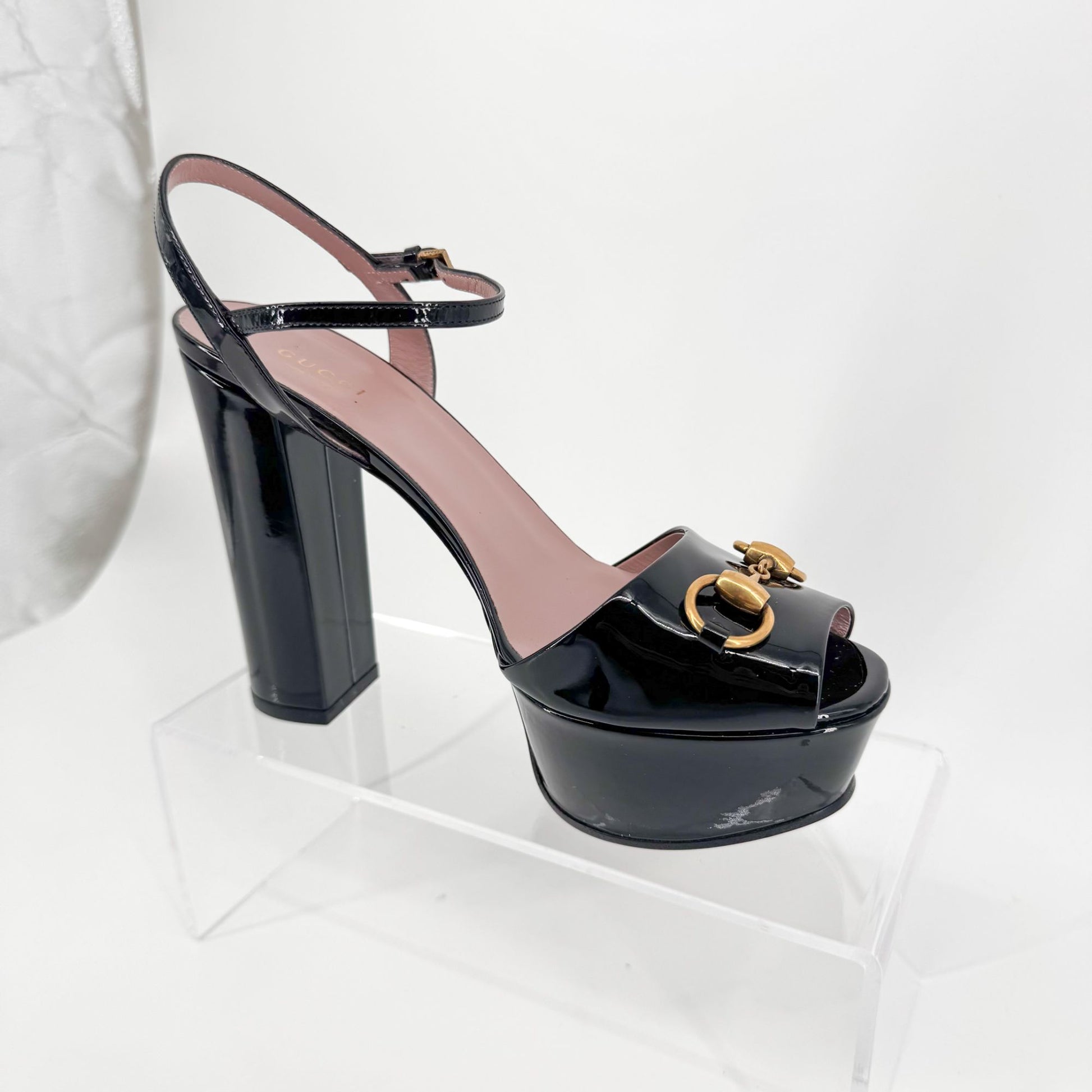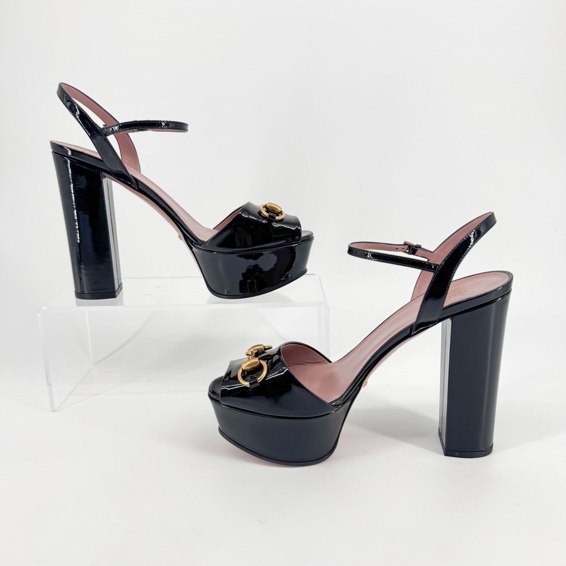 These Gucci Claudie heels feature a glossy black patent leather upper with gold Horsebit hardware across the toe and a round peep-toe silhouette. The towering 5-inch heel is balanced by a substantial 1.7-inch platform, creating bold height without compromising on stability—ideal for evening events or dramatic styling.