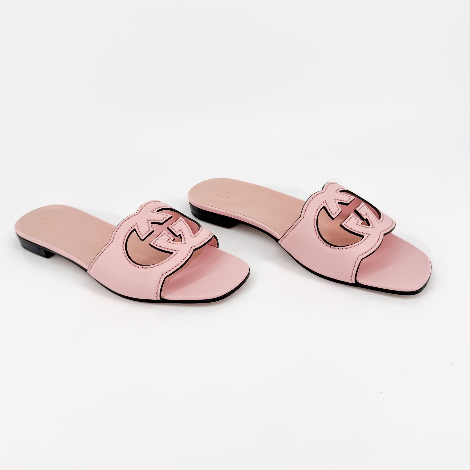 Gucci Cosmos GG Cutout Slide Sandals Size 40 US 10 Pink Leather Flat Interlock