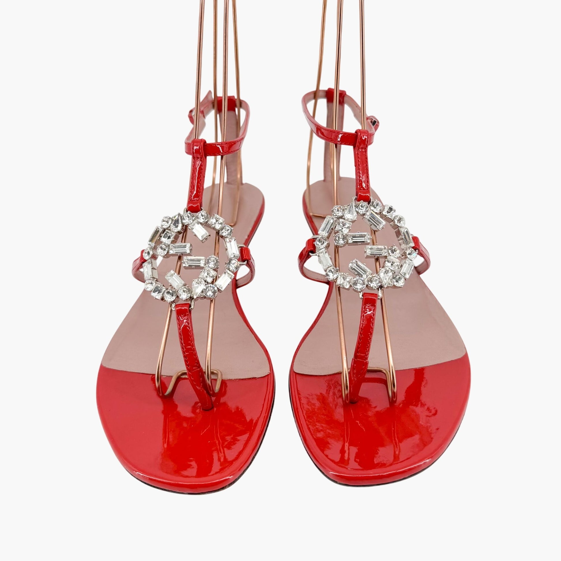 Gucci Crystal-Embellished Interlocking GG T-Strap Flat Sandals in Red Patent Leather Size 37