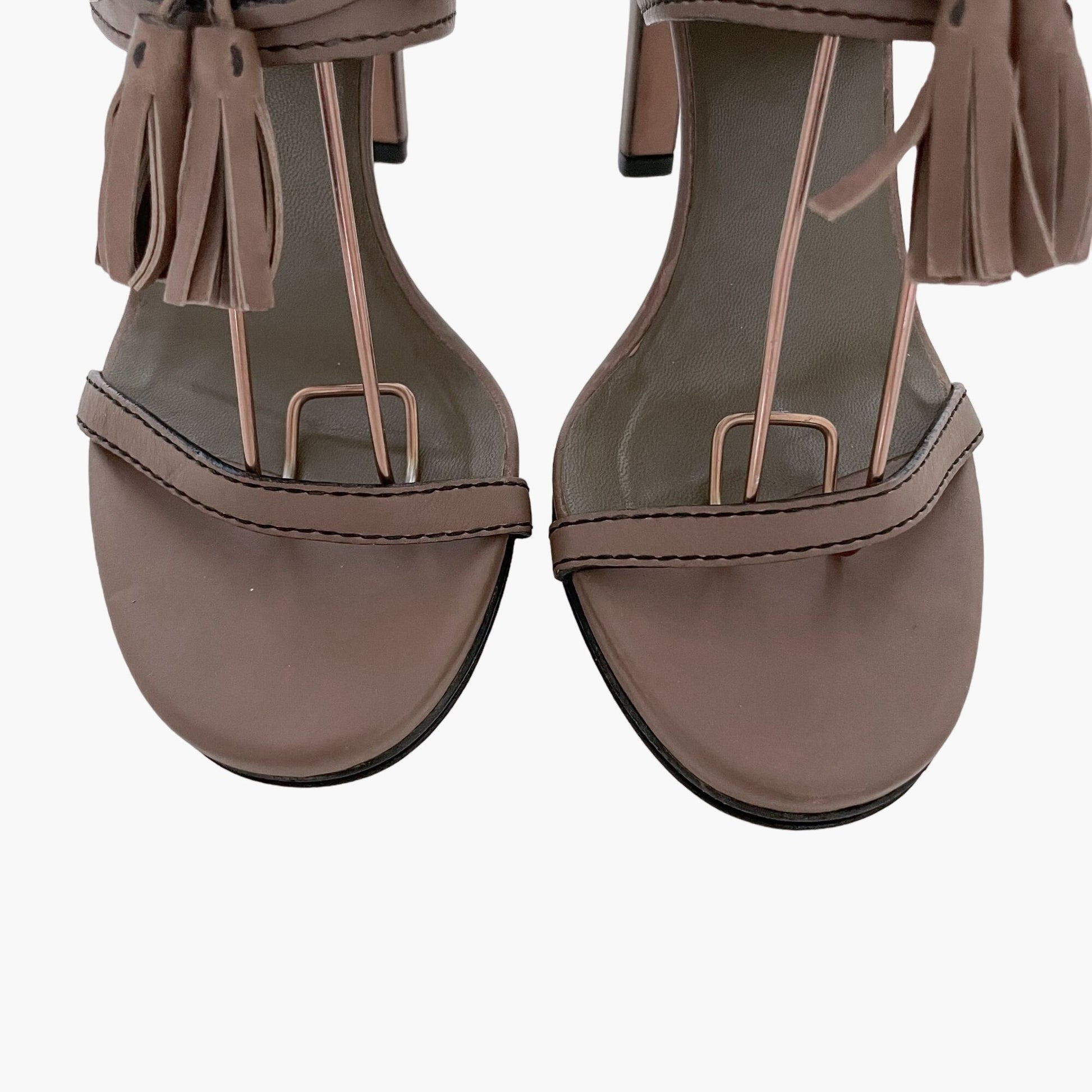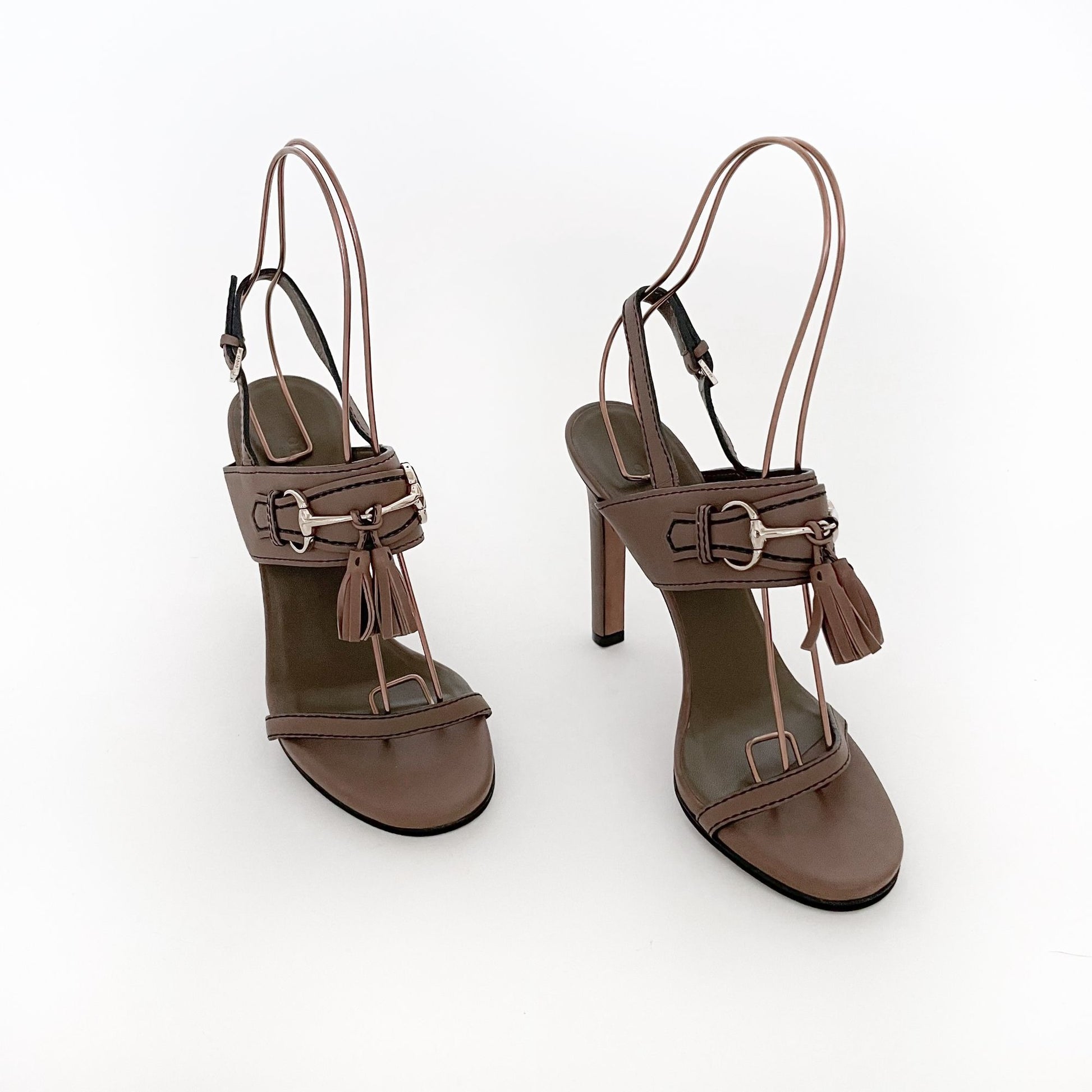 Gucci Emily Horsebit Tassel Sandals EU 37.5 US 7.5 Brown High Heel Buckle Fringe