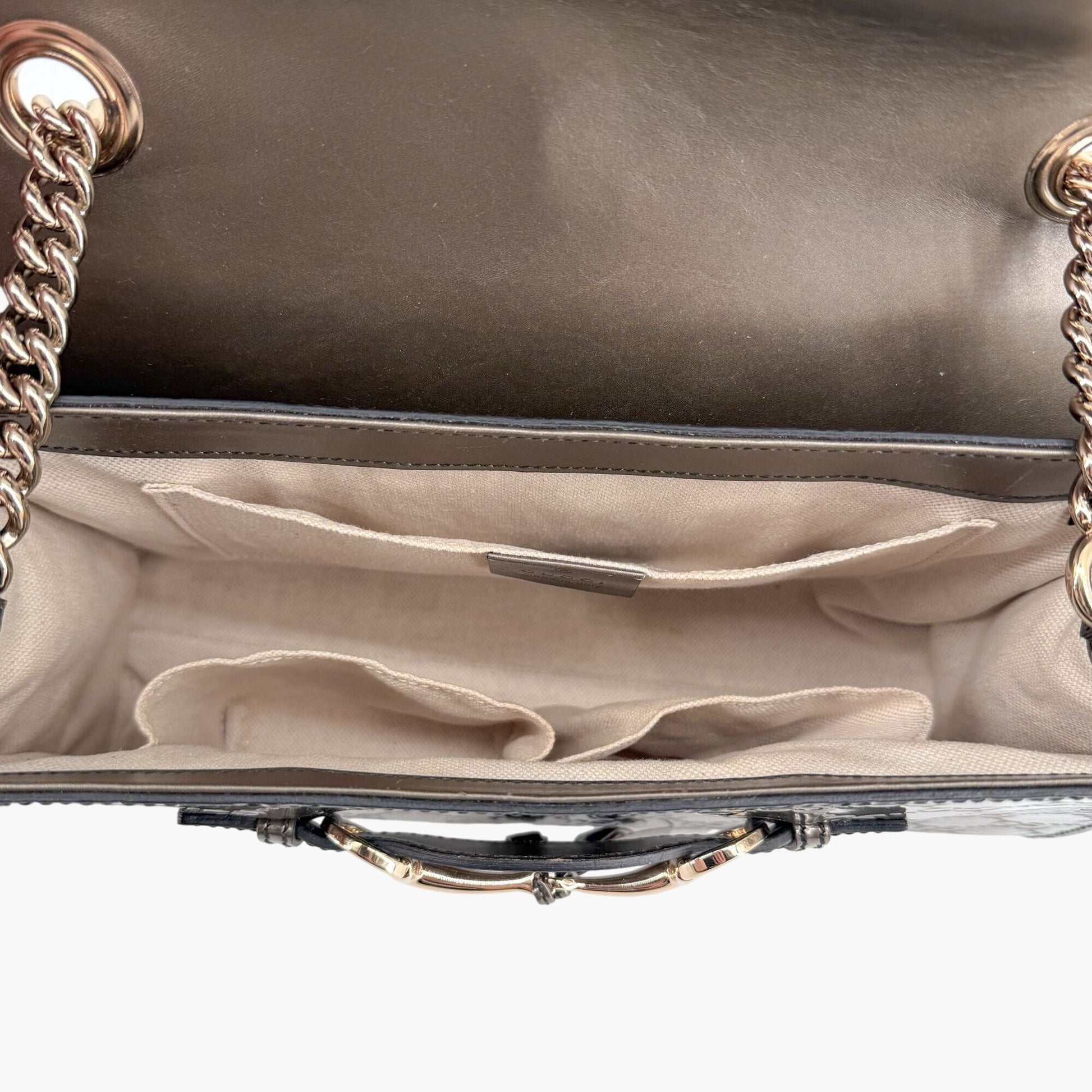 This Gucci Emily Medium Chain Shine Guccissima shoulder bag features metallic Sasso gunmetal gray patent leather embossed with the GG monogram and finished with silver-tone hardware. A signature Horsebit and tassel accent adds a classic touch, while the chain shoulder strap with a patent handle lends versatility for day-to-night styling. Includes dust bag.