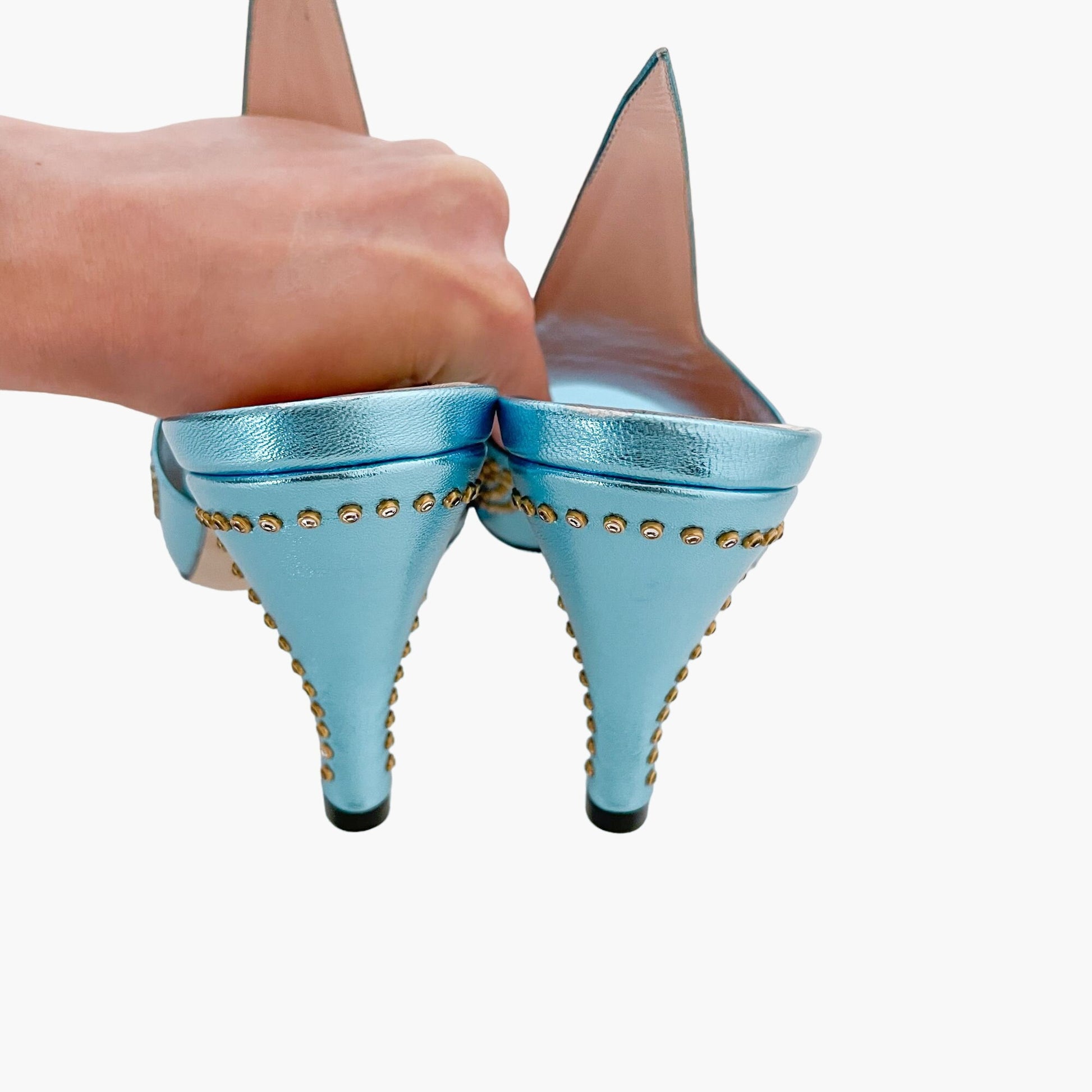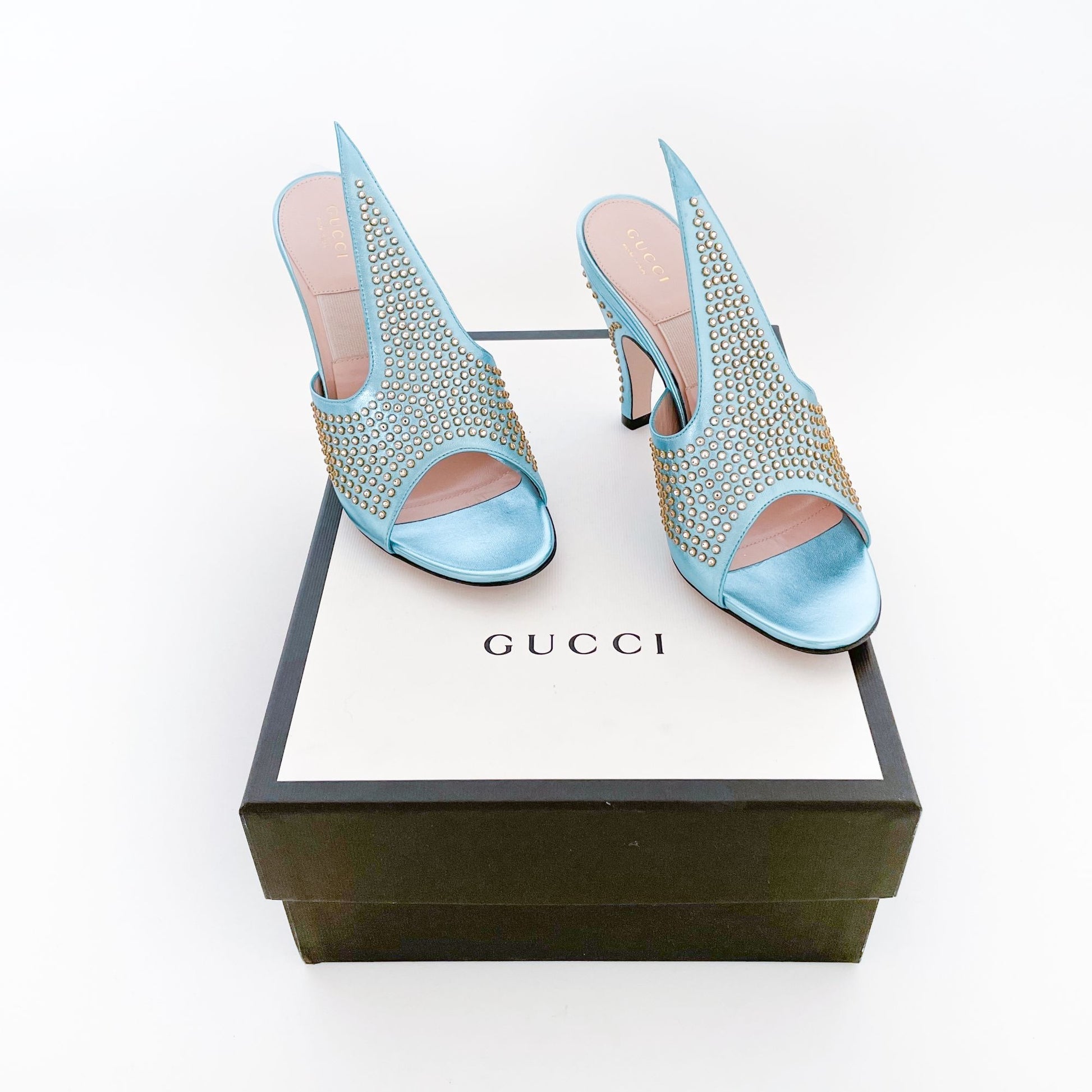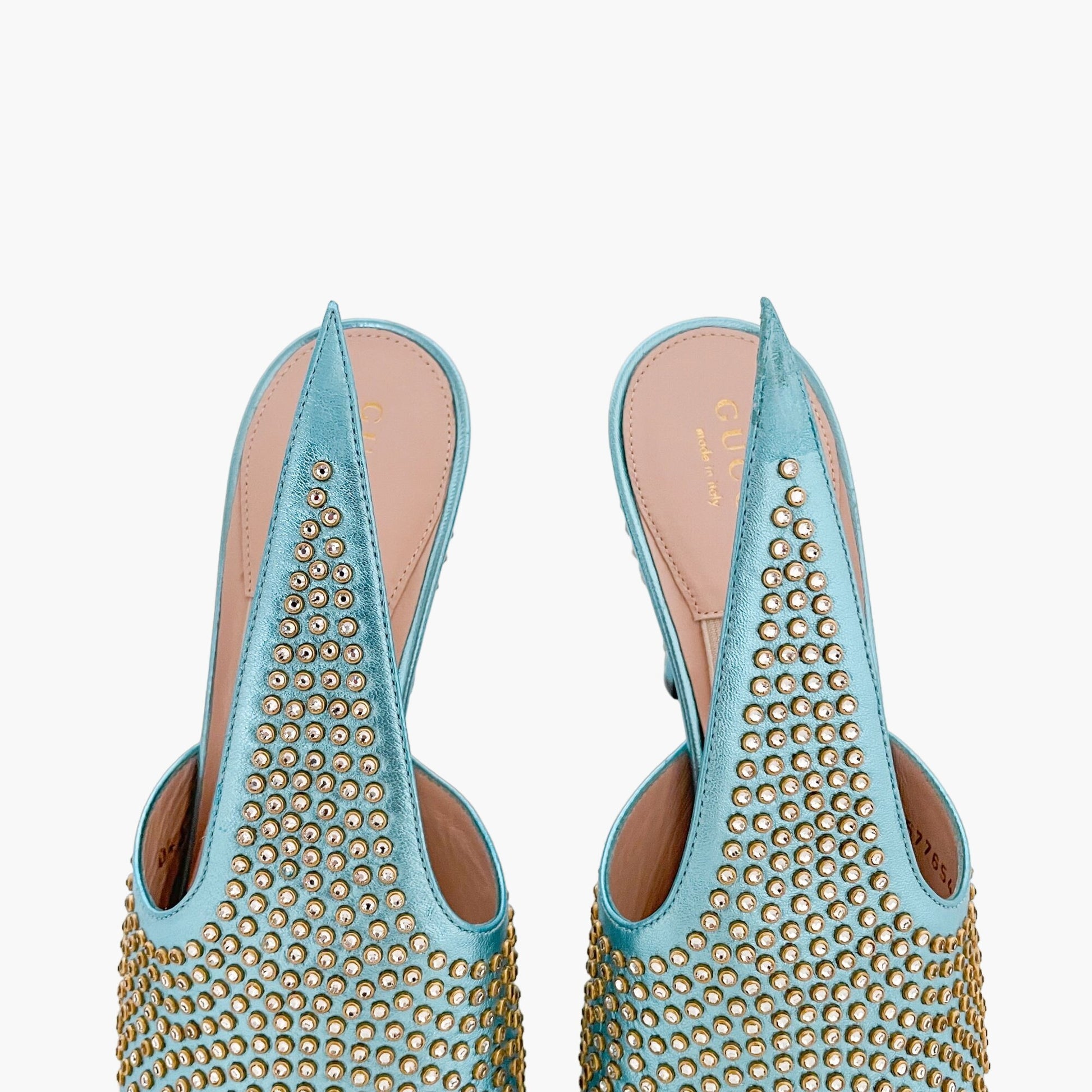 Gucci Fedra Crystal-Embellished Mules in Cielo (Metallic Blue) Size 37