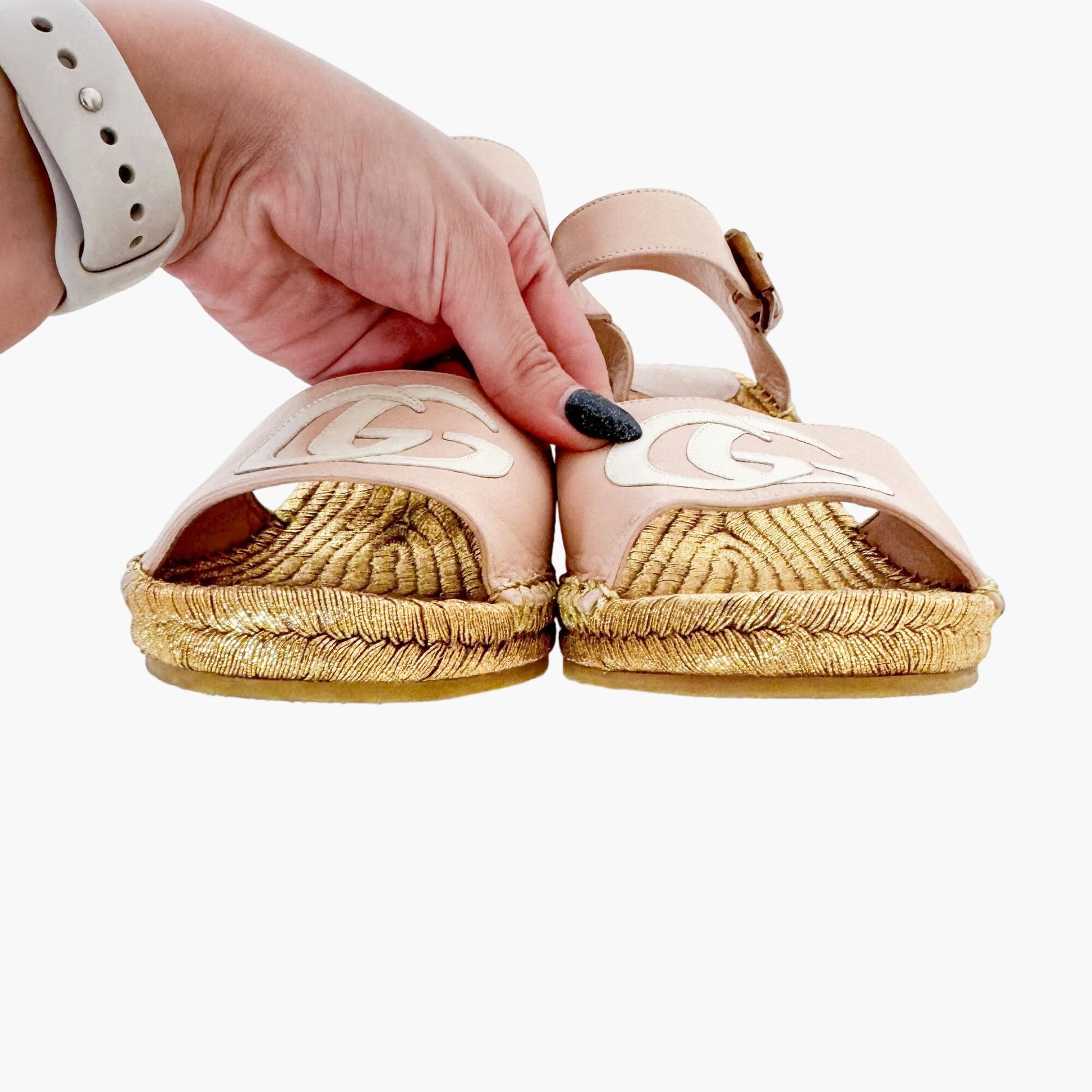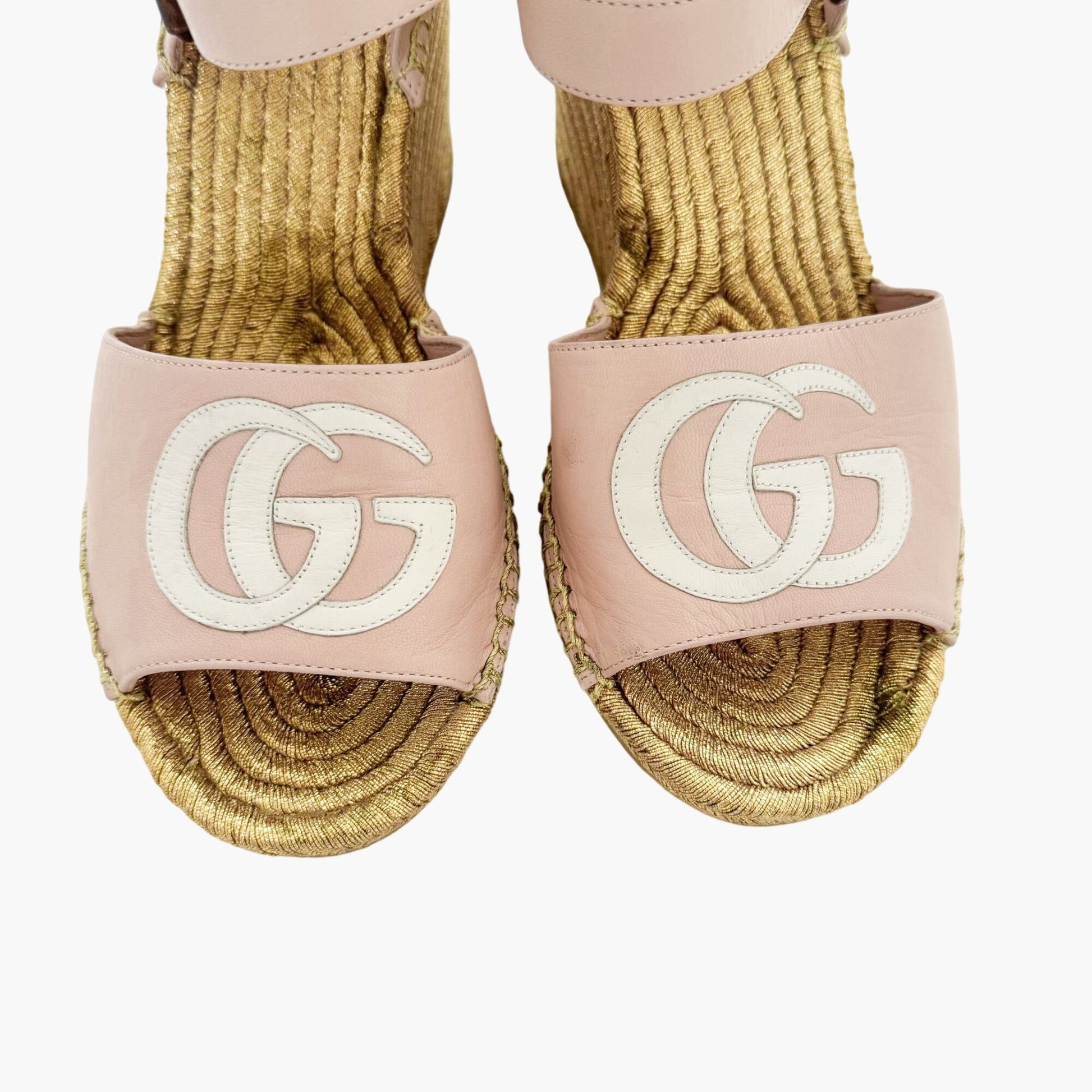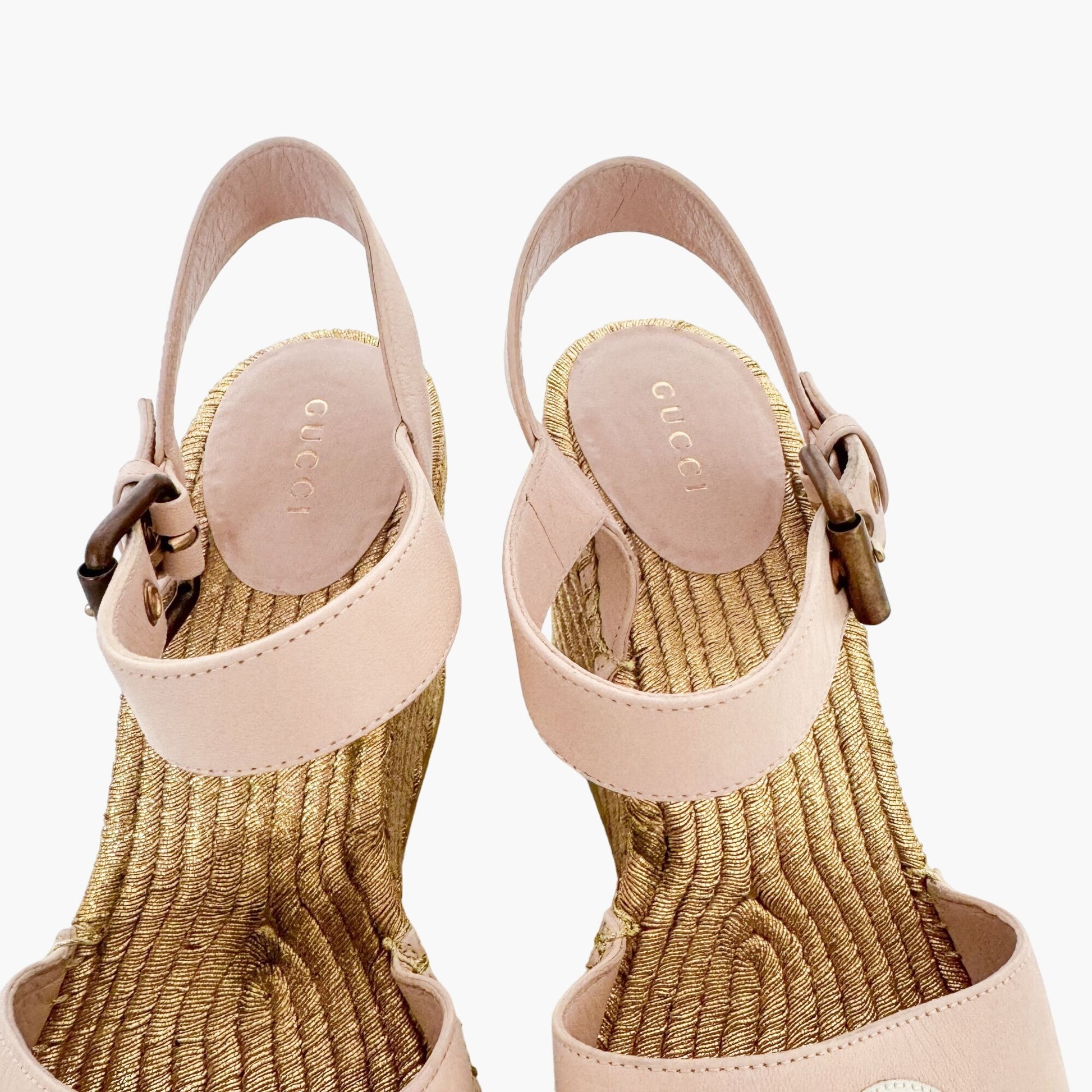 Gucci Flor GG Espadrille Wedge Sandals EU 39.5 US 9.5 Pink Gold Platform Heel