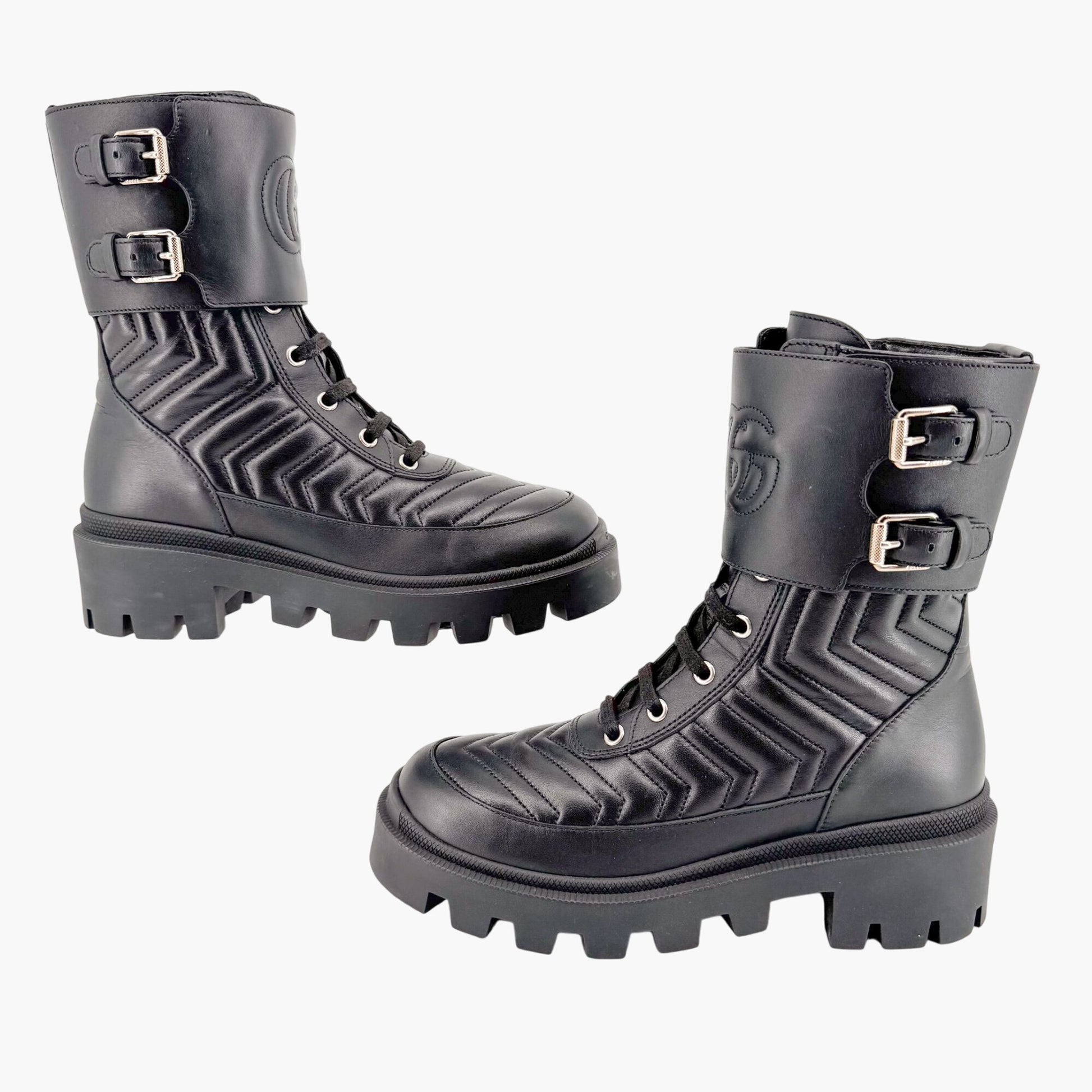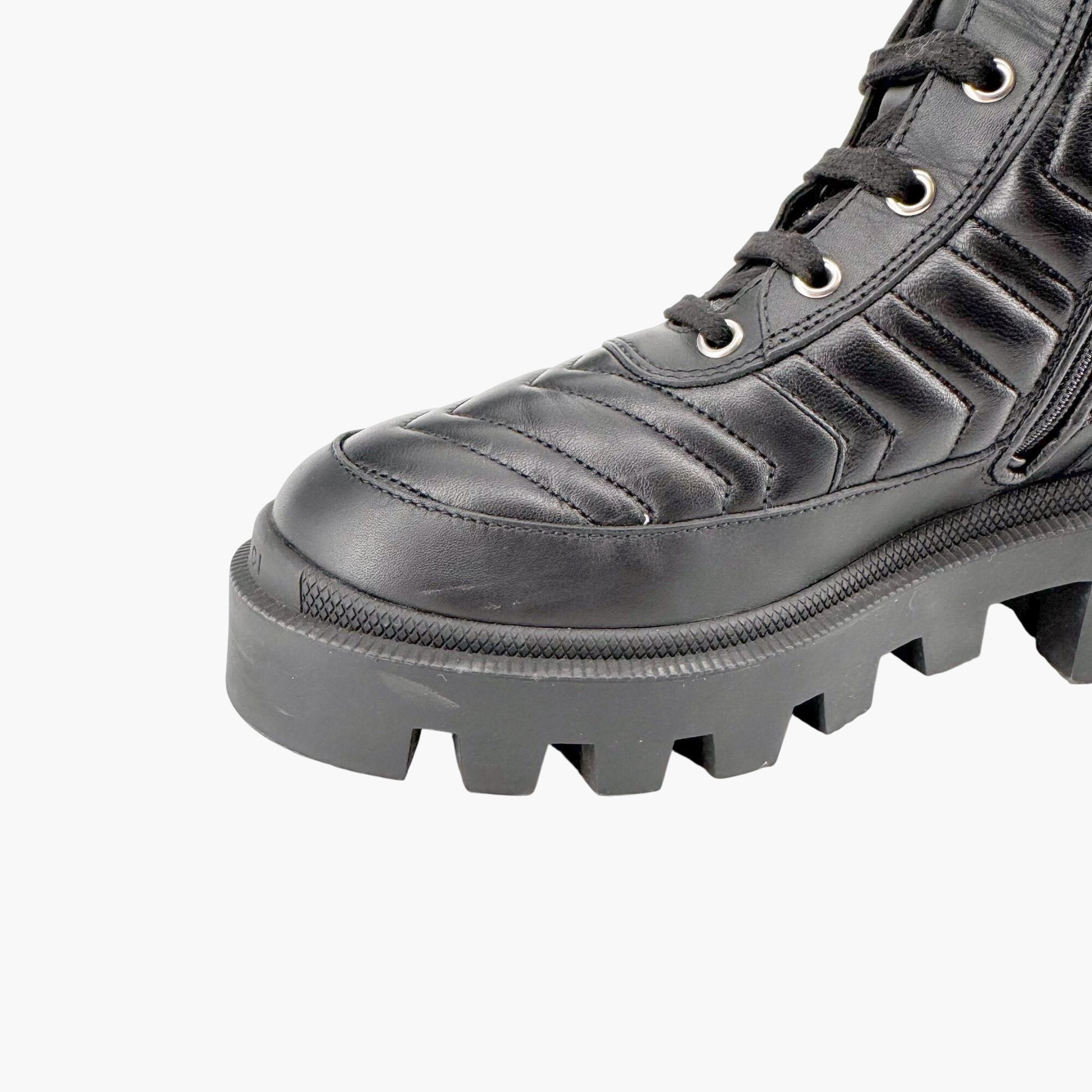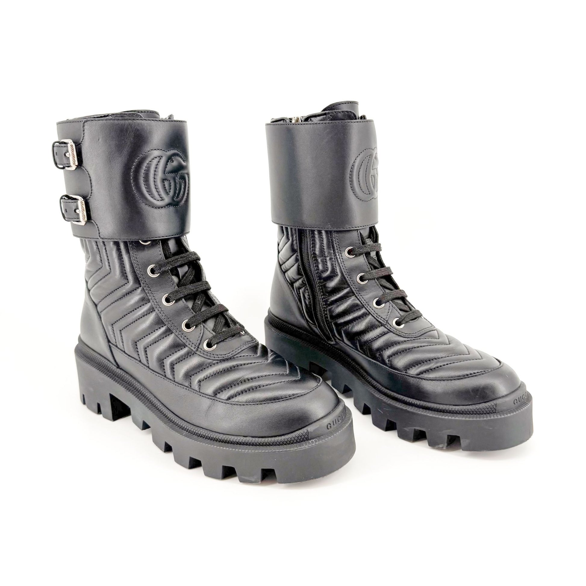 Gucci Frances GG Lug Combat Boots EU 36 US 6 Black Matelasse Quilted Leather