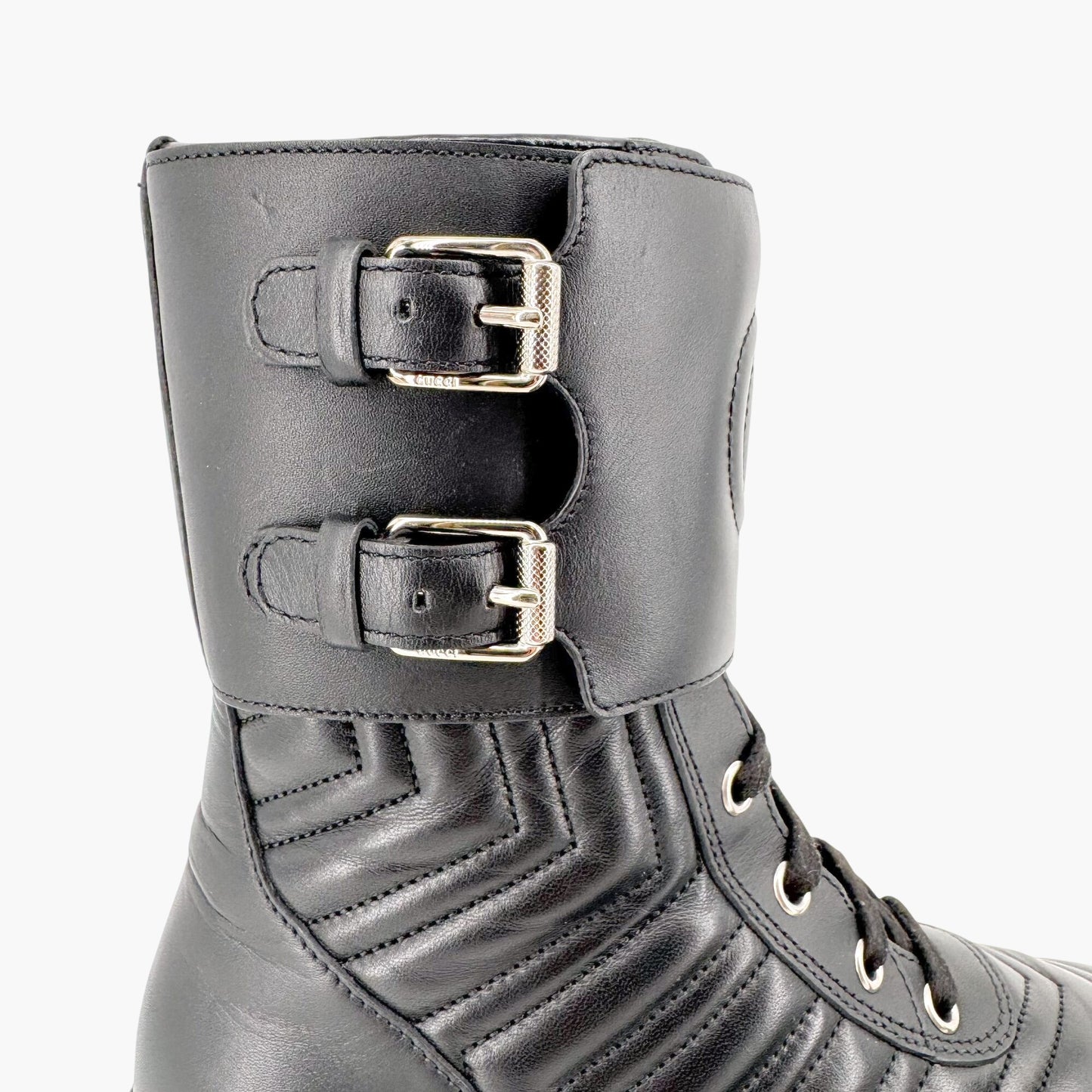 Gucci Frances GG Combat Boot in Black Matelasse Leather Size 36