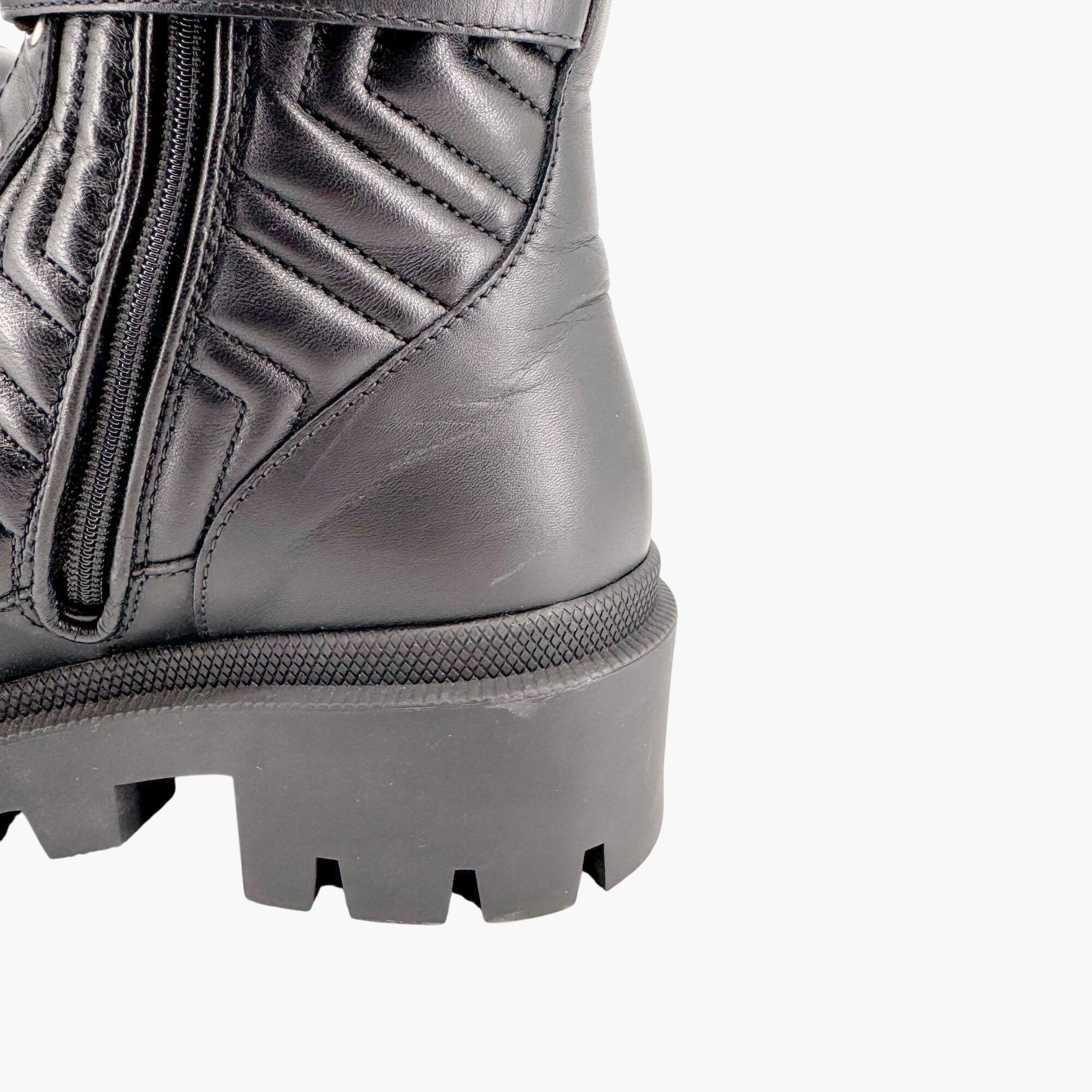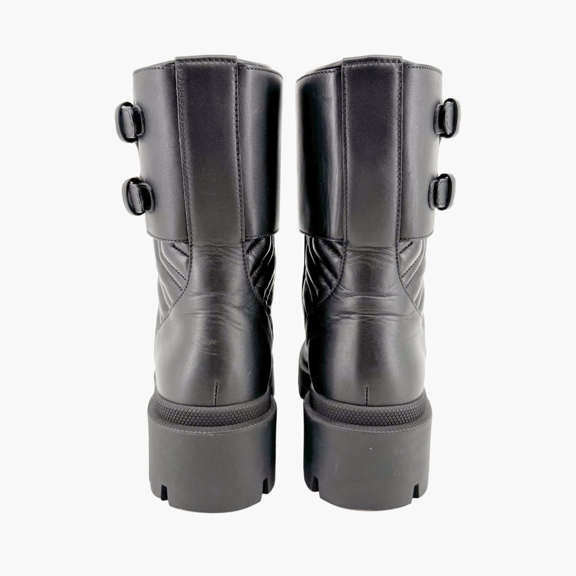 Elevate your style with the Gucci Frances GG Combat Boots, crafted in black chevron-quilted leather for a bold, timeless look. These pre-owned and authentic boots feature a lace-up military-style design with an ankle-height shaft and side zip closure for easy wear. Details include a double G harness strap with buckle accent, round toe, and a leather footbed and lining for premium comfort. The low block heel and rubber lug sole provide grip and durability, perfect for everyday wear. Ideal for pairing with denim, edgy streetwear, or chic outerwear, these boots bring signature Gucci sophistication to any look. Sized at EU 36, they’re a versatile choice for the fashion-forward.