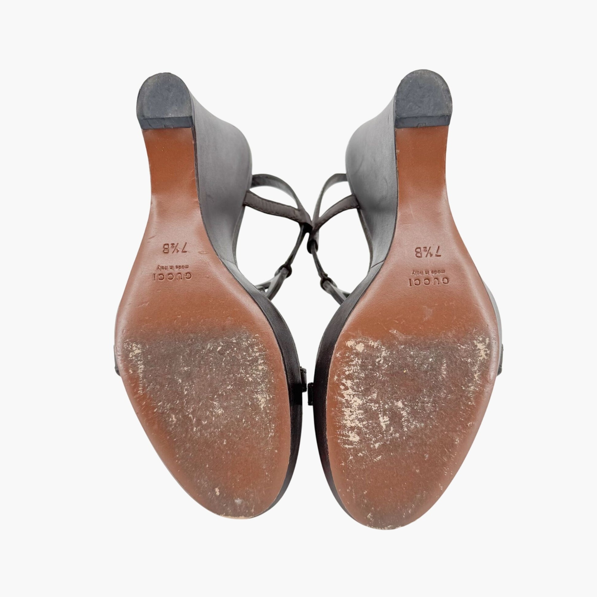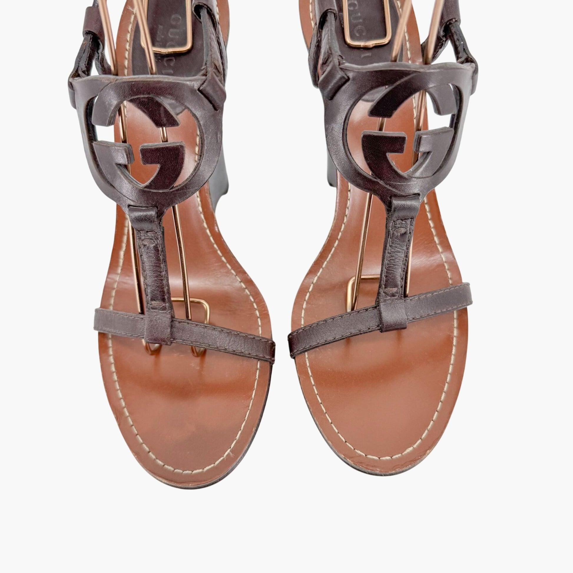 Gucci GG Interlock Cutout T-Strap Wedge Sandals in Brown Leather Size 7.5