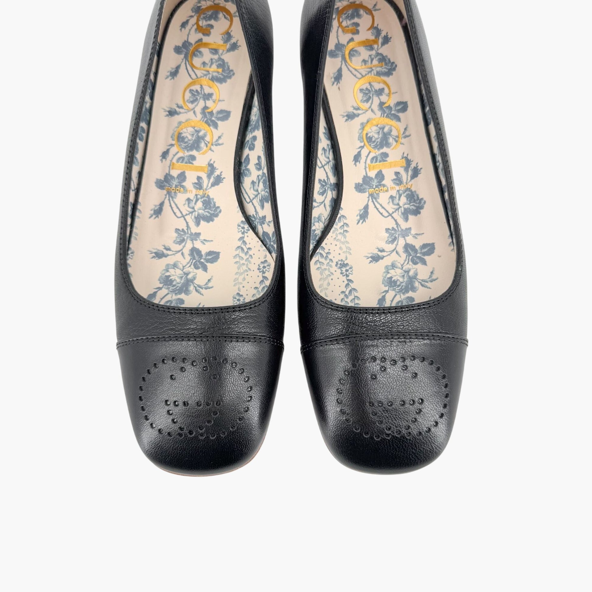 These Gucci Hills GG ballet flats feature black leather uppers with square cap toes detailed by perforated interlocking G logos. Designed in a slip-on silhouette with leather footbeds, leather lining, and flat heels, they bring timeless refinement to everyday wear.