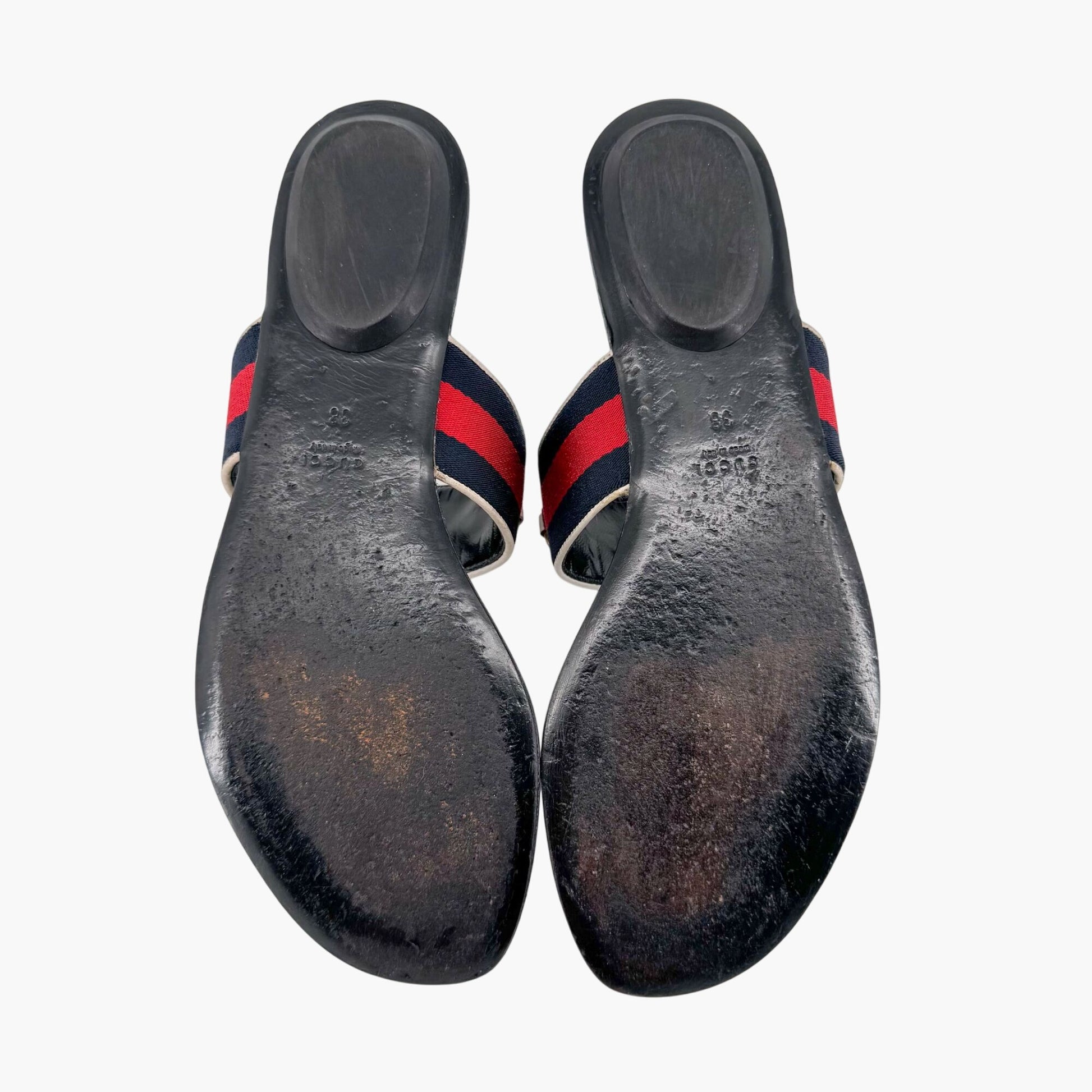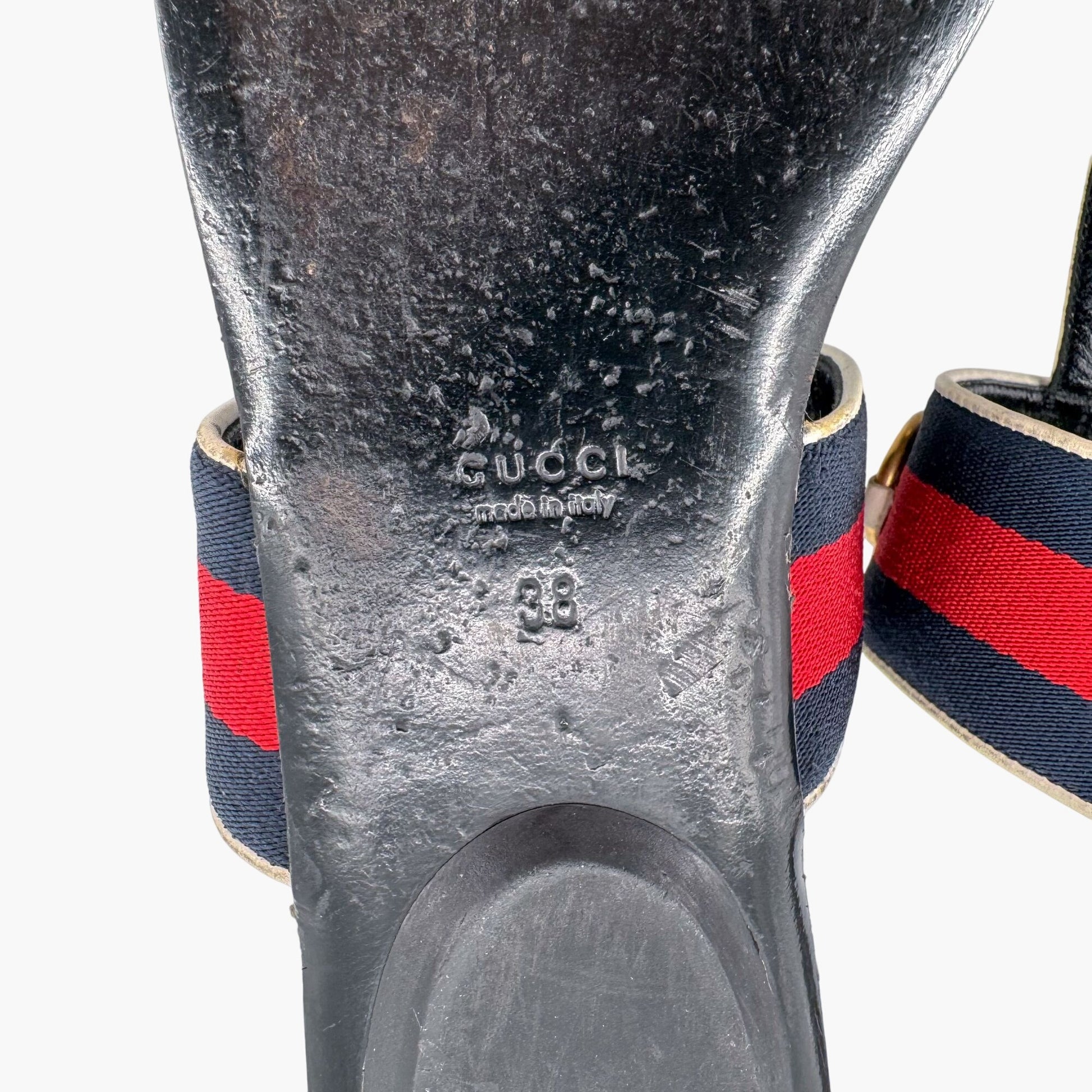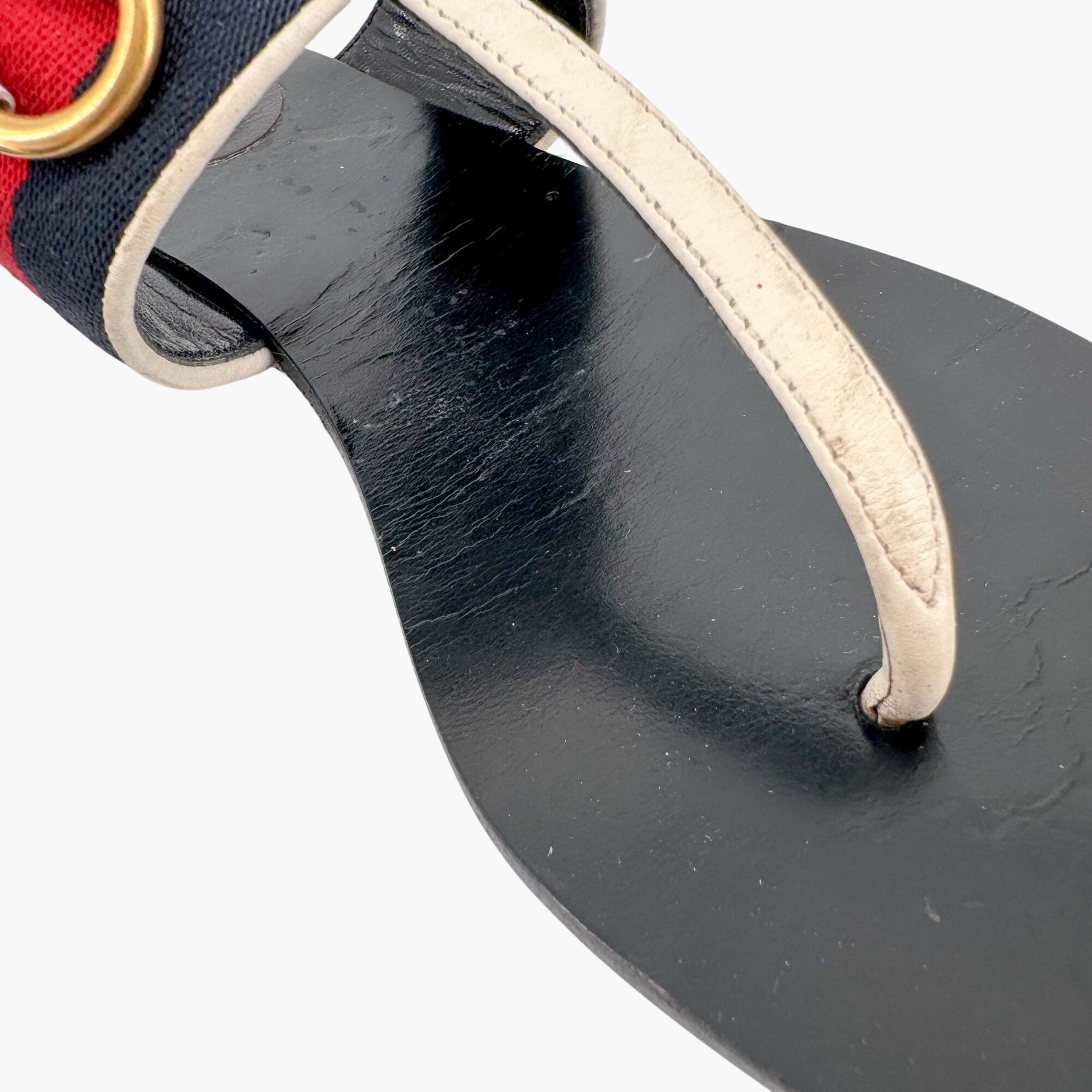 These Gucci T-strap thong sandals feature white leather uppers with a navy blue and red Web Stripe, gold-tone Horsebit detail, and a slip-on silhouette. Designed with a leather footbed and flat heel, they’re an easy luxury choice for warm-weather wear, vacations, or casual designer styling.