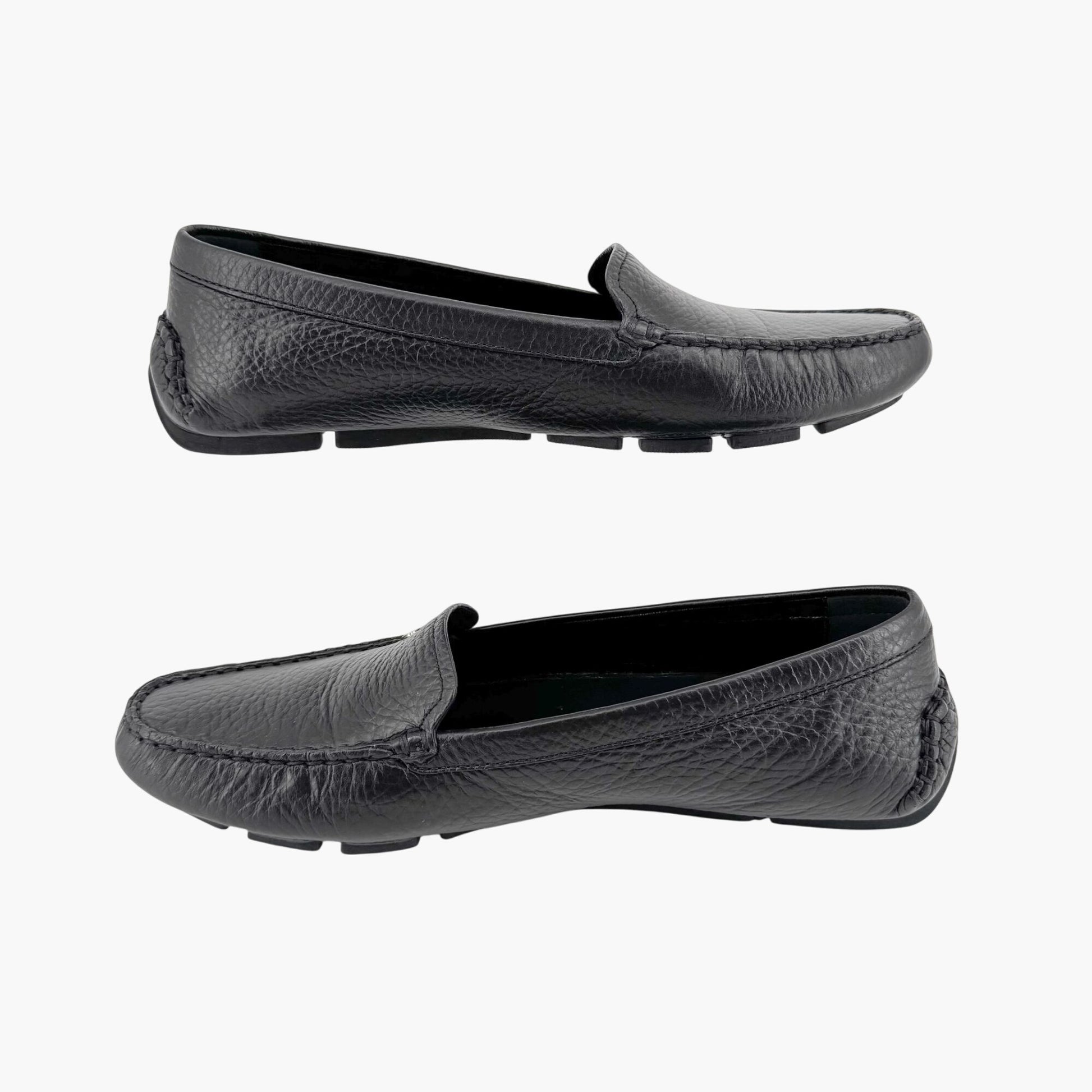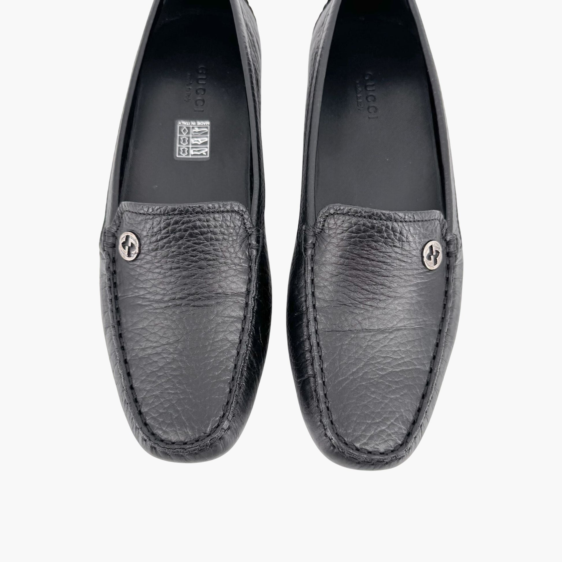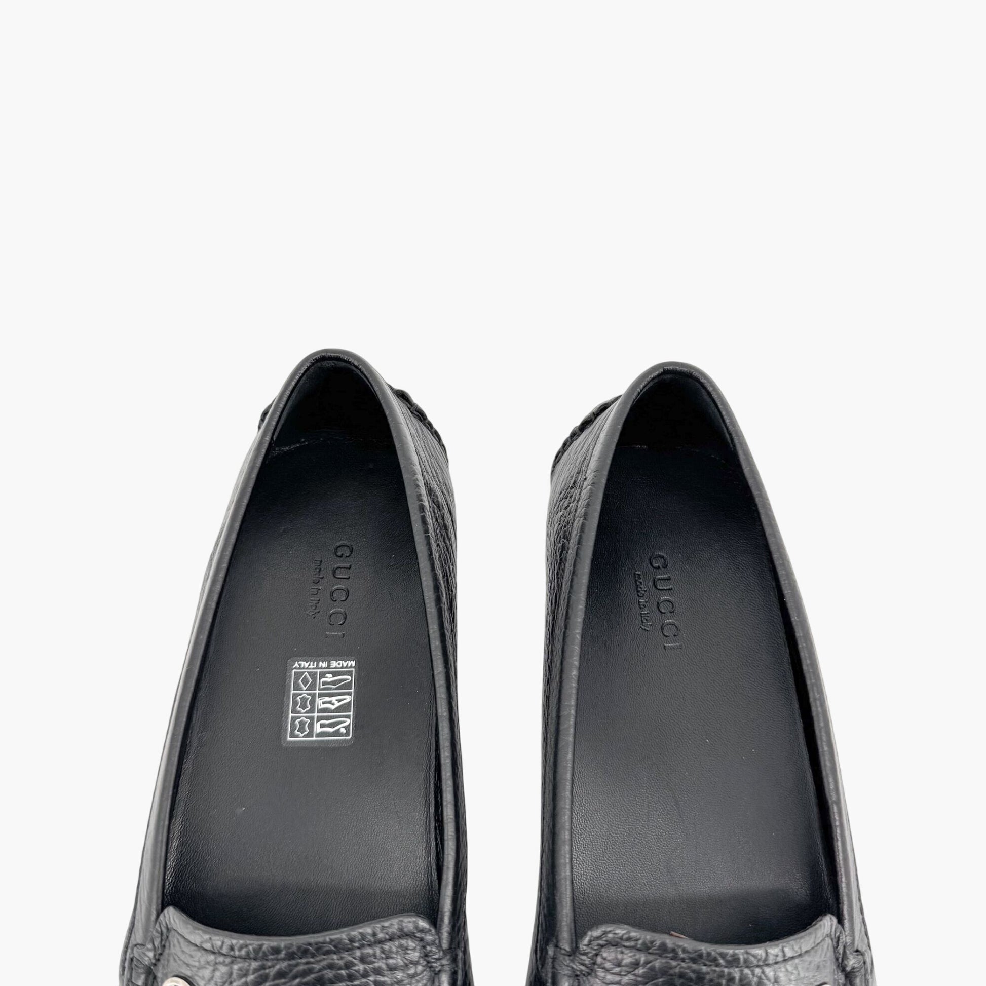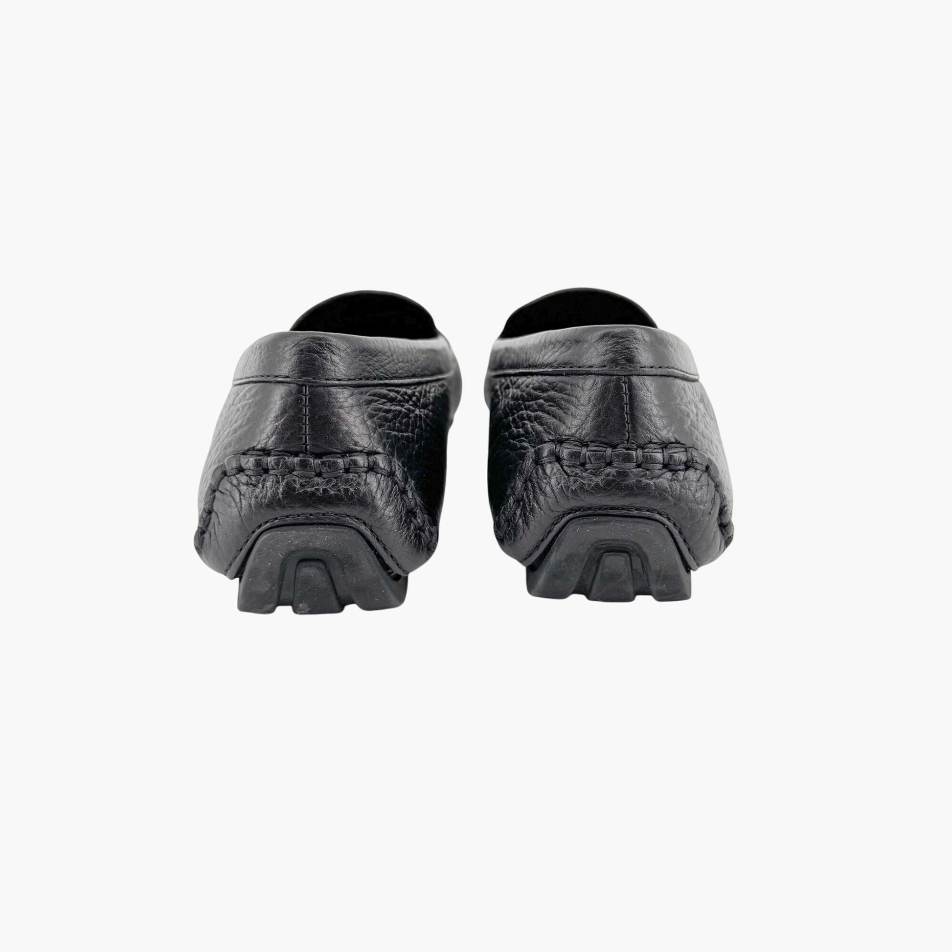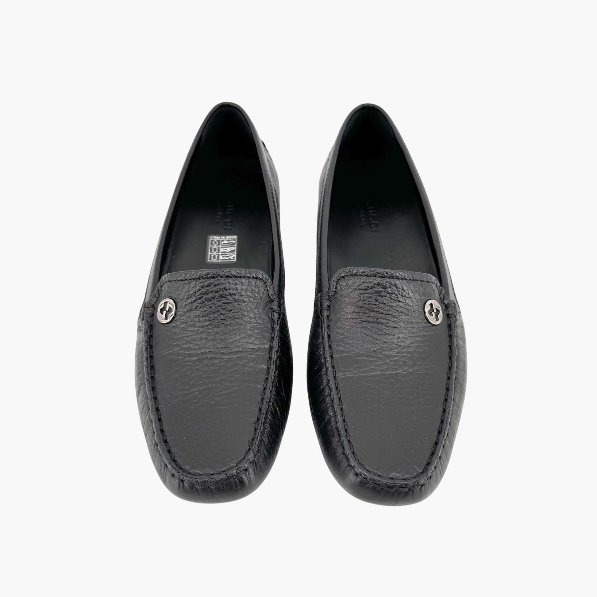 These Gucci driving loafers are crafted from black textured leather and feature the iconic interlocking G logo accent. The tapered square toe and flat heel provide both style and comfort, while the leather footbed and lining offer a luxurious fit. The rubber moccasin outsole ensures durability and flexibility, making these loafers perfect for casual wear, daily commutes, or relaxed weekend outings. A refined and versatile piece to elevate your footwear collection.