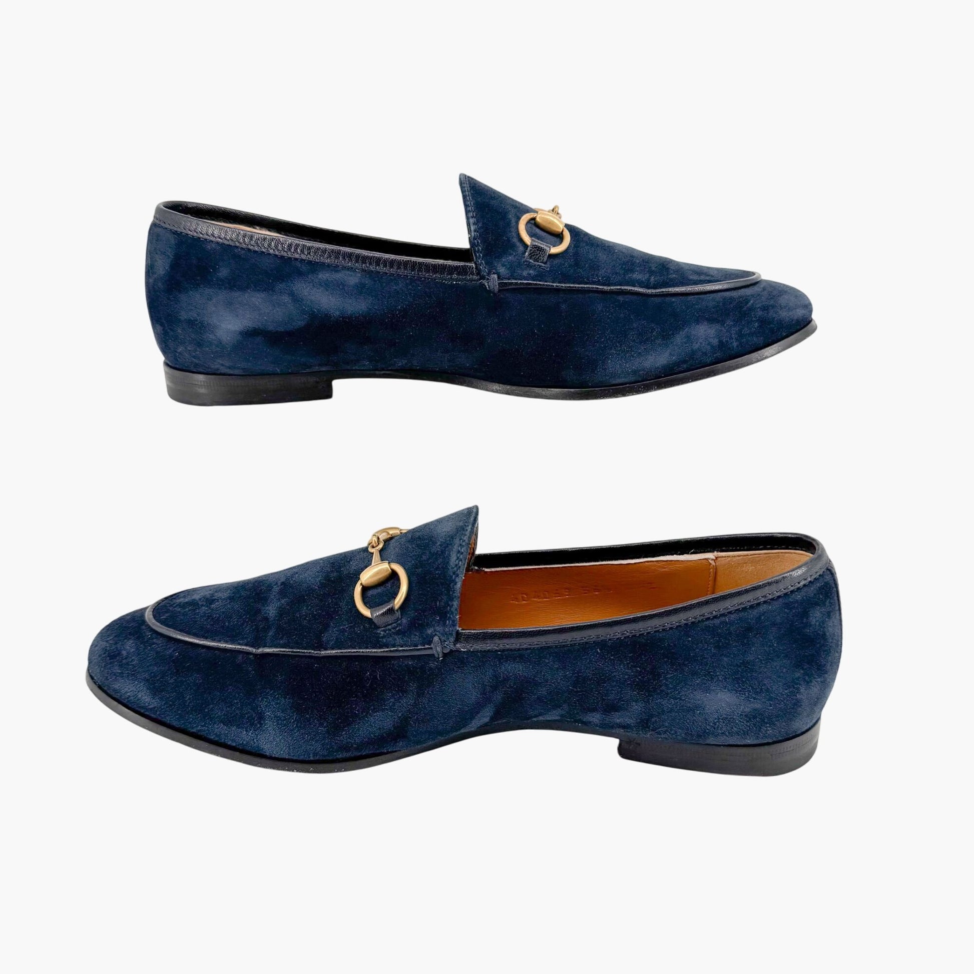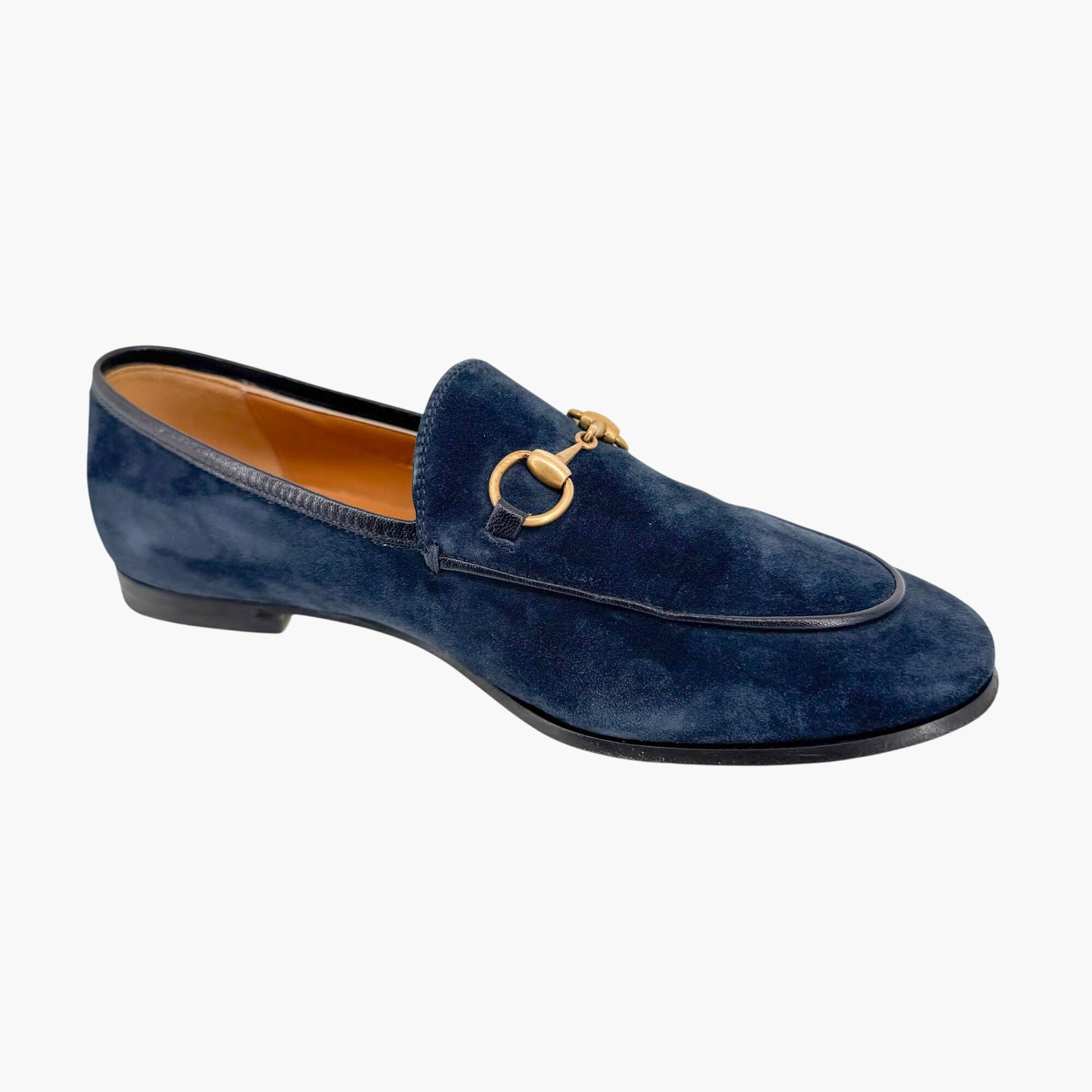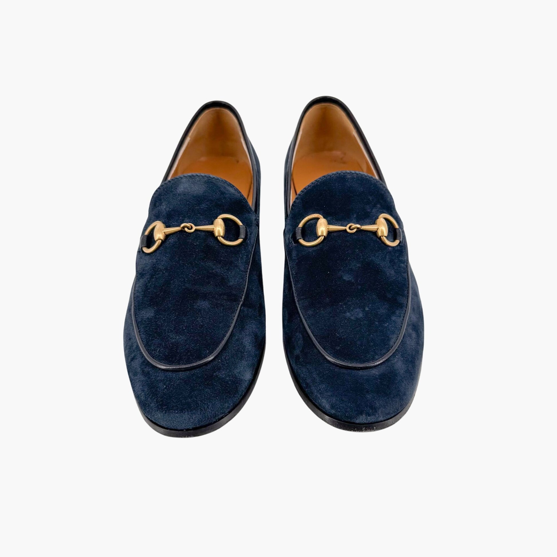 These Gucci Jordaan loafers offer a refined, versatile twist on the brand's classic loafer silhouette. Crafted from rich navy suede, the slip-on design is finished with Gucci’s iconic gold-tone Horsebit buckle for a touch of timeless elegance. Featuring a rounded almond toe and flat heel, these loafers provide effortless comfort and sophistication. The leather footbed and lining ensure a luxe feel, while the leather outsole offers durability. Perfect for office wear, weekend outings, or adding a polished finish to tailored and casual looks alike. Comes with the original box.