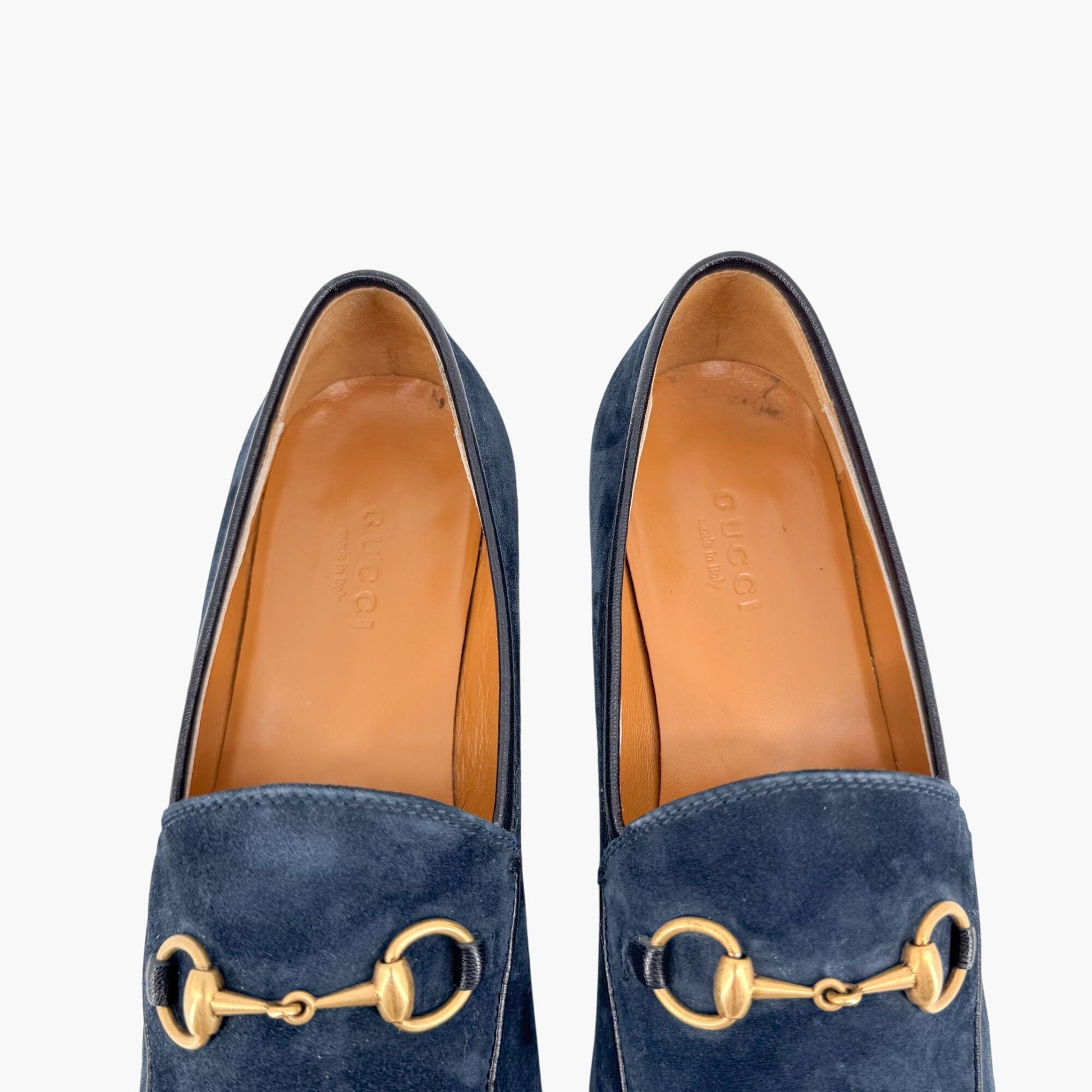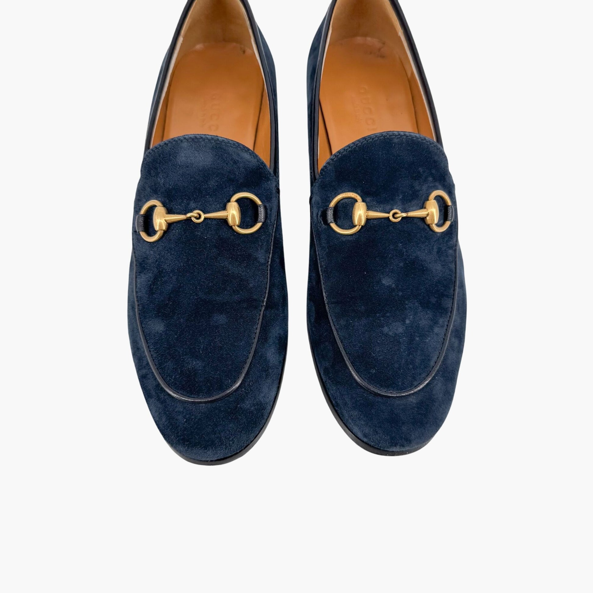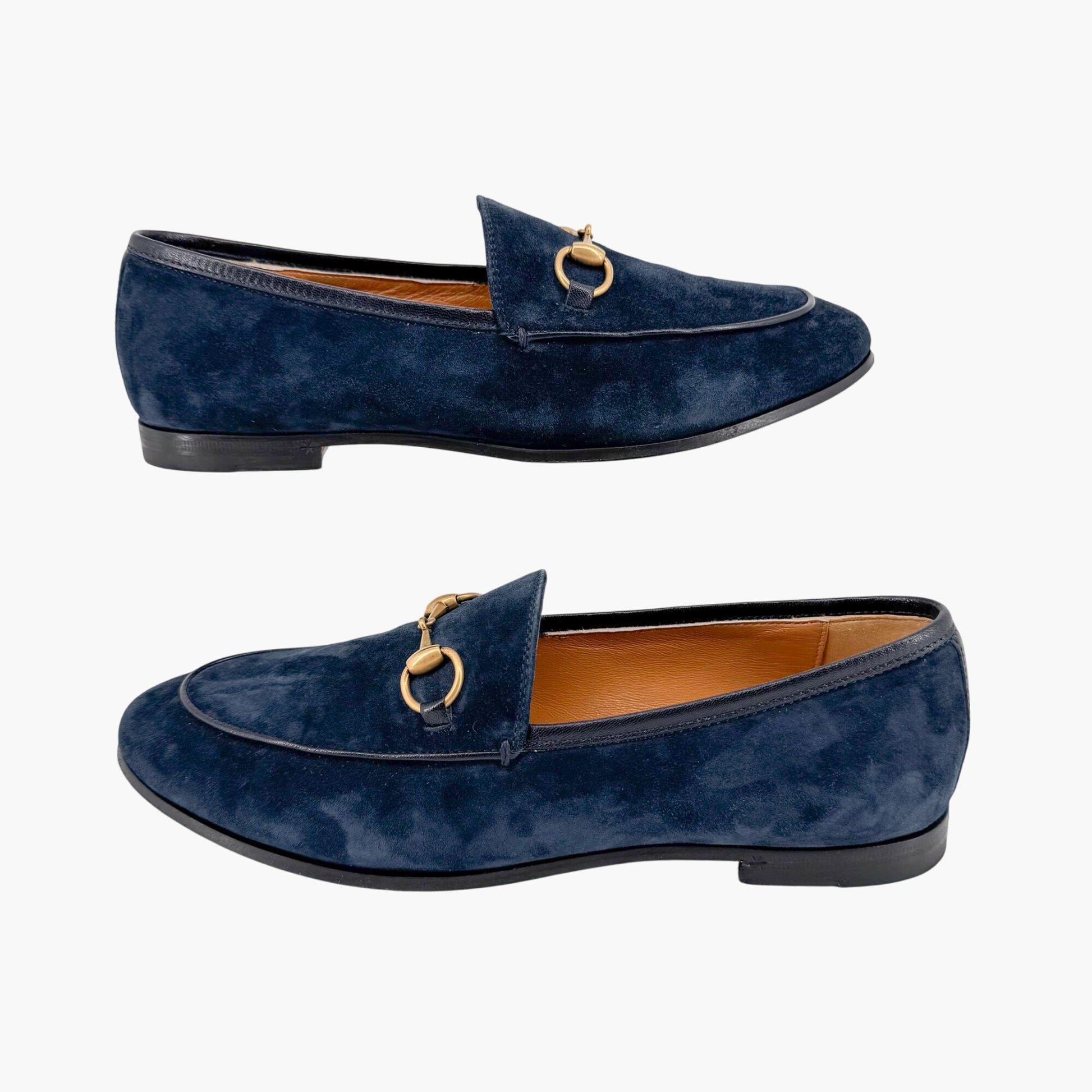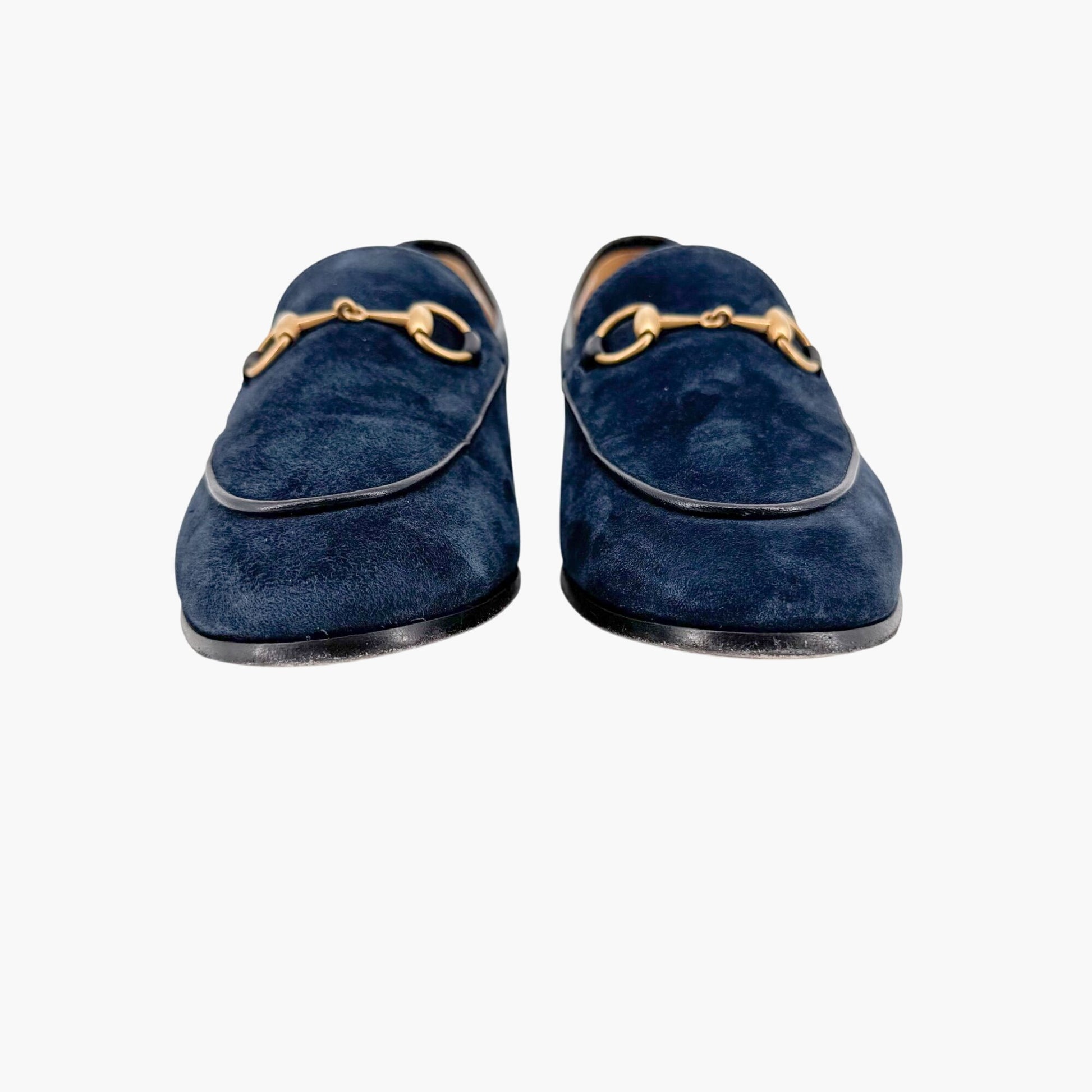 These Gucci Jordaan loafers offer a refined, versatile twist on the brand's classic loafer silhouette. Crafted from rich navy suede, the slip-on design is finished with Gucci’s iconic gold-tone Horsebit buckle for a touch of timeless elegance. Featuring a rounded almond toe and flat heel, these loafers provide effortless comfort and sophistication. The leather footbed and lining ensure a luxe feel, while the leather outsole offers durability. Perfect for office wear, weekend outings, or adding a polished finish to tailored and casual looks alike. Comes with the original box.
