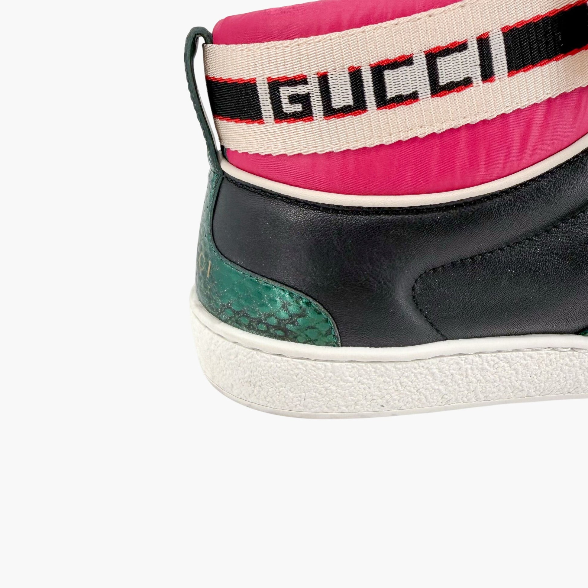 These Gucci "New Ace" high-top sneakers feature black leather uppers with green-and-red Web stripes, hook-and-loop logo straps, lace-up fronts, and pink padded shafts. Designed with leather footbeds and rubber outsoles, they offer sporty-luxe styling ideal for casual wear, travel days, and street-style looks.