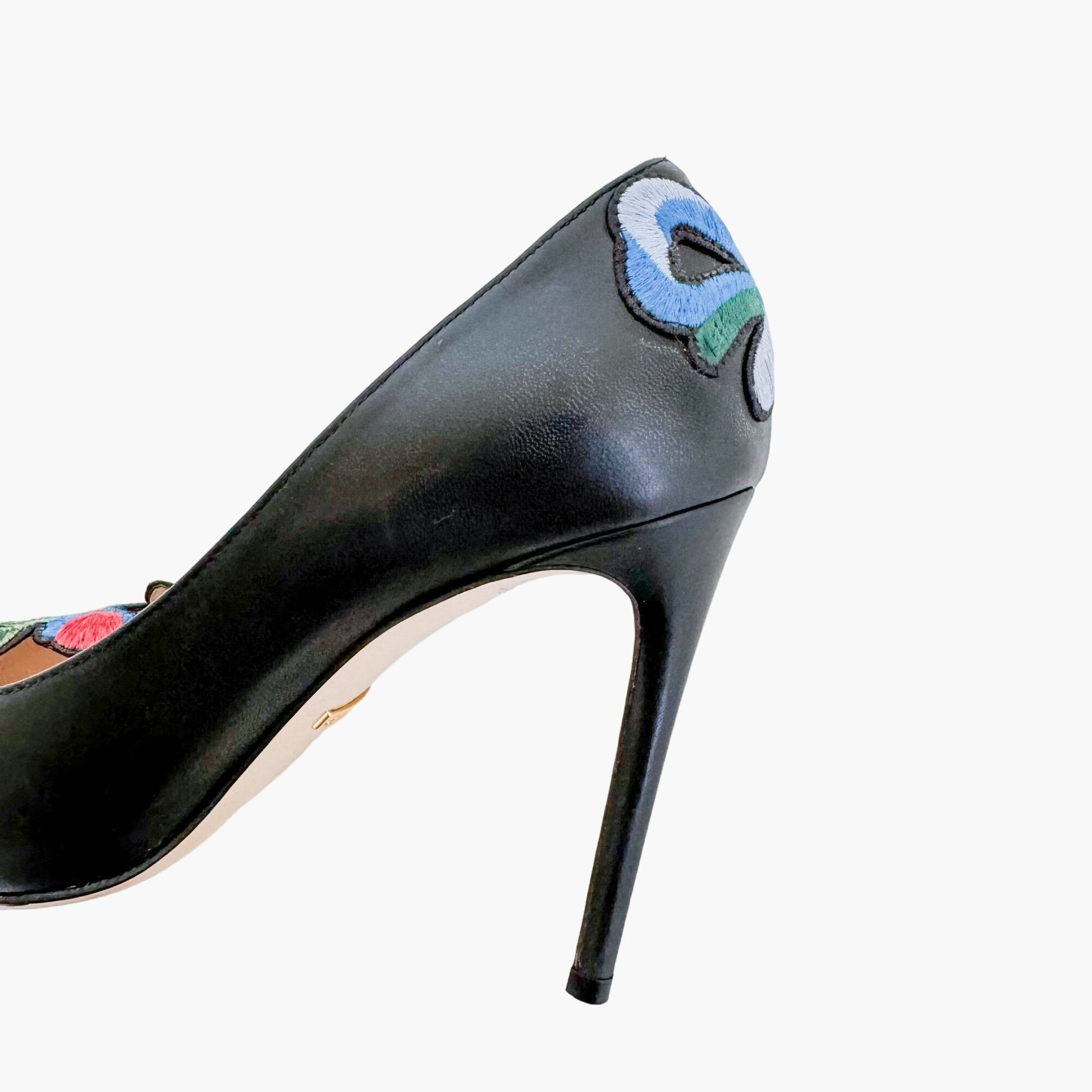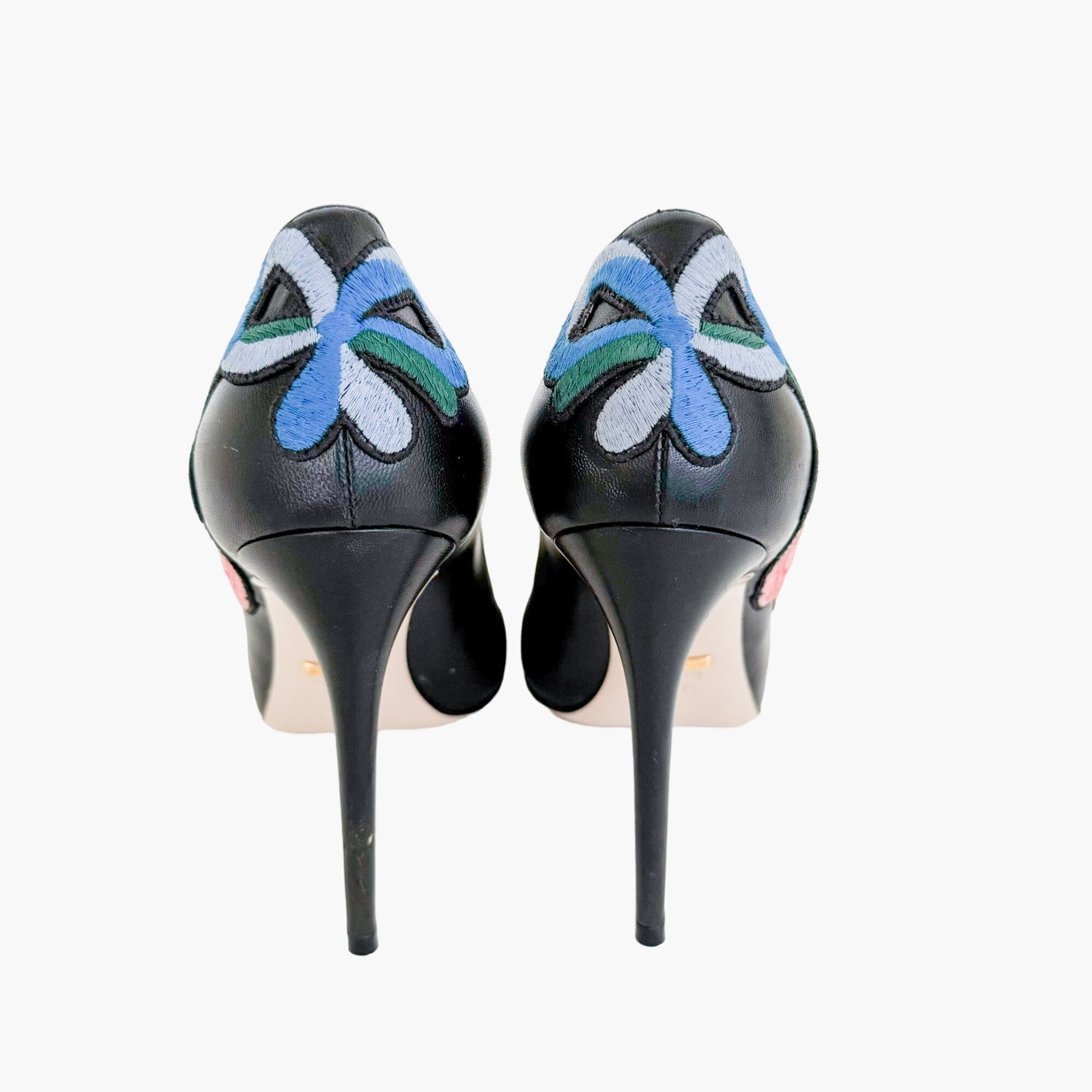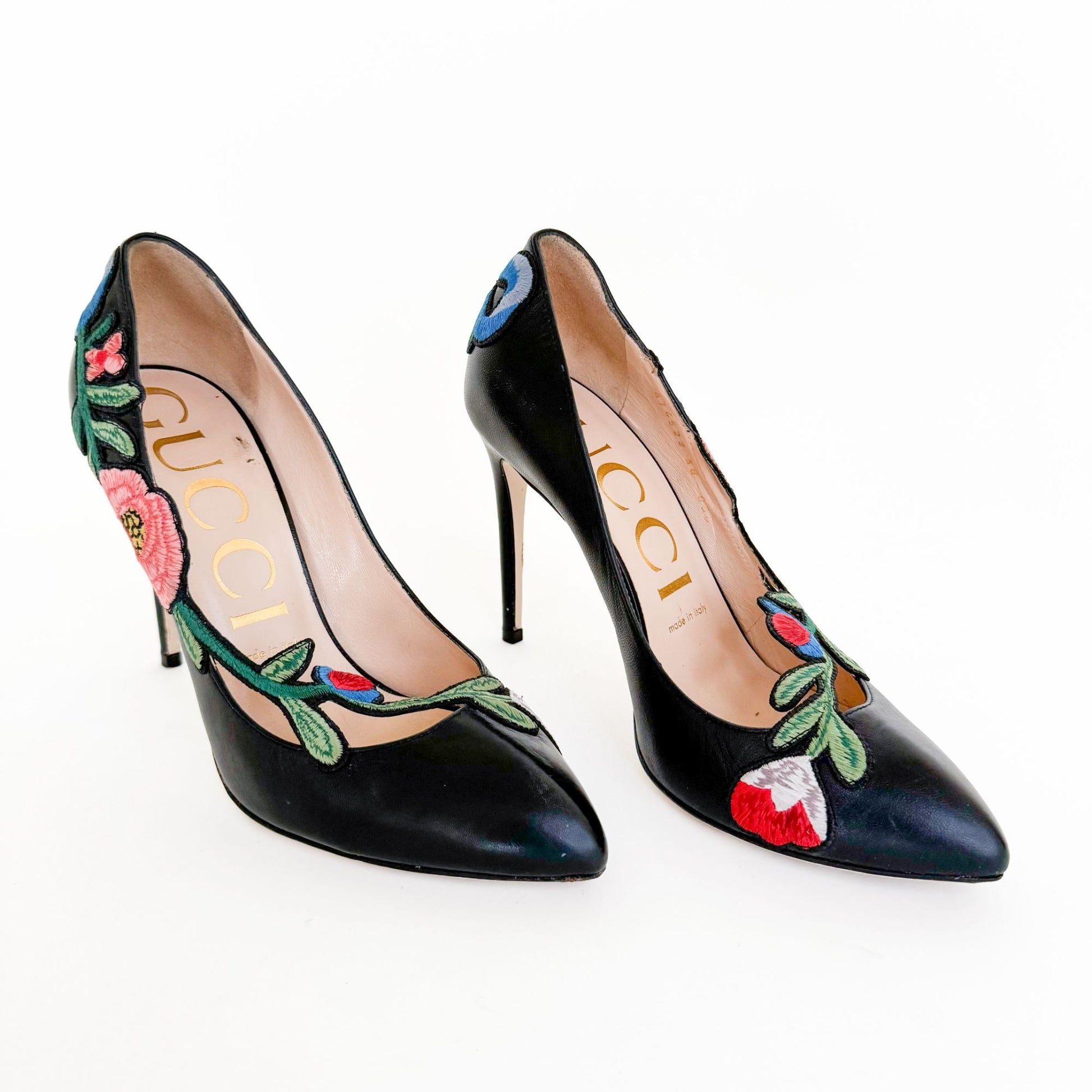 Gucci Ophelia Floral Embroidered Pumps in Black Leather Size 38