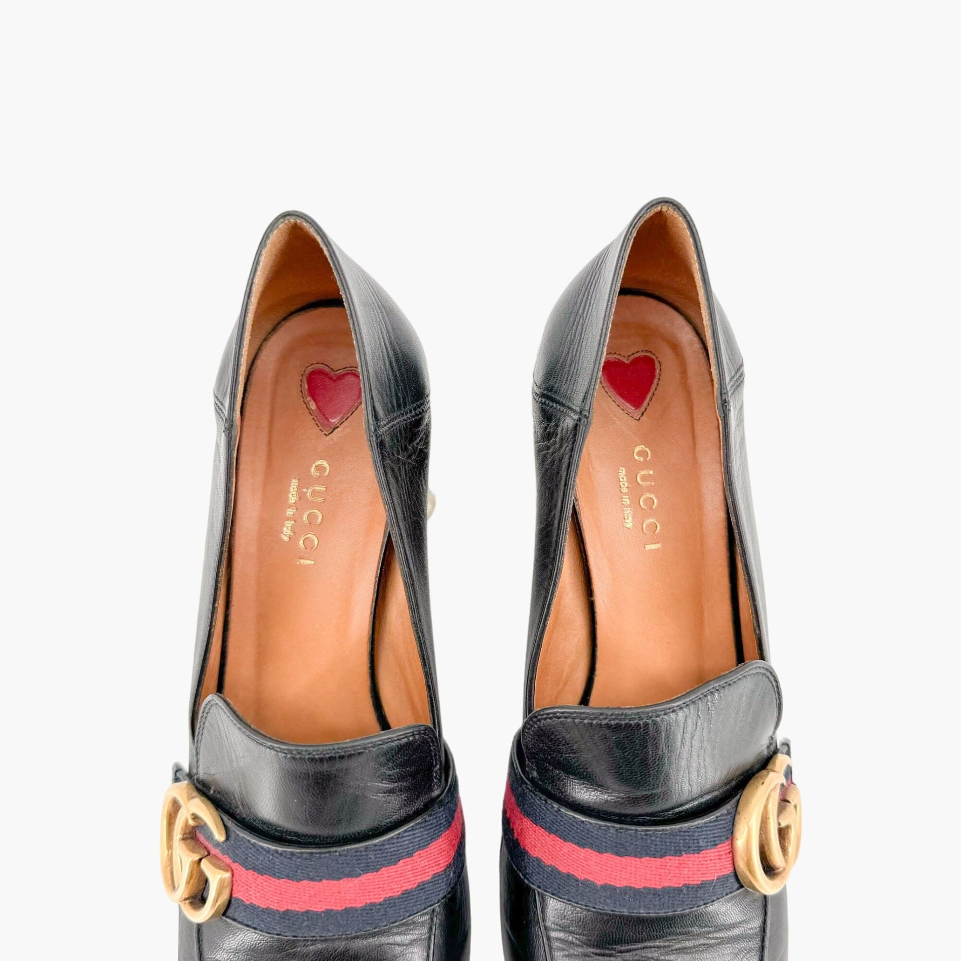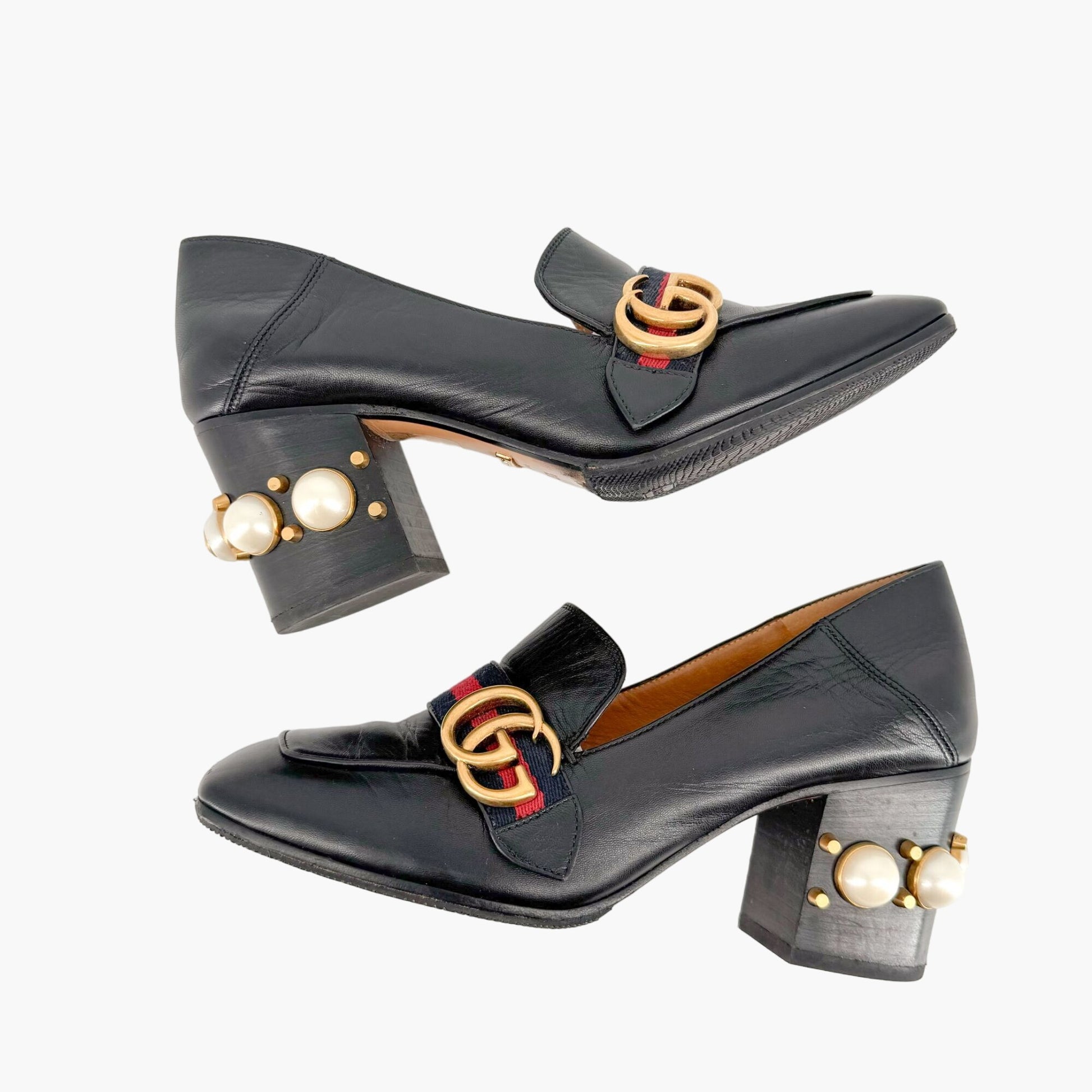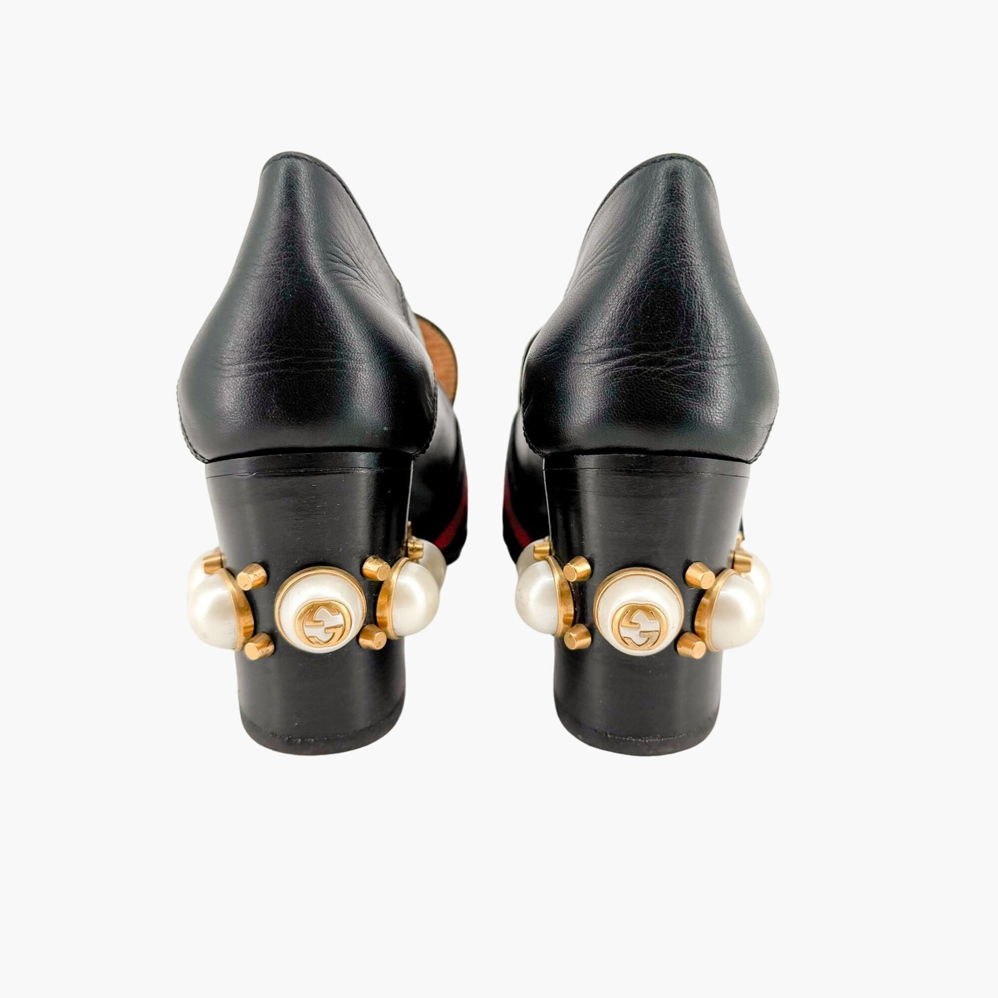 Gucci Peyton GG Pearl Loafer Pumps EU 37.5 US 7.5 Black Leather Block Heel Logo