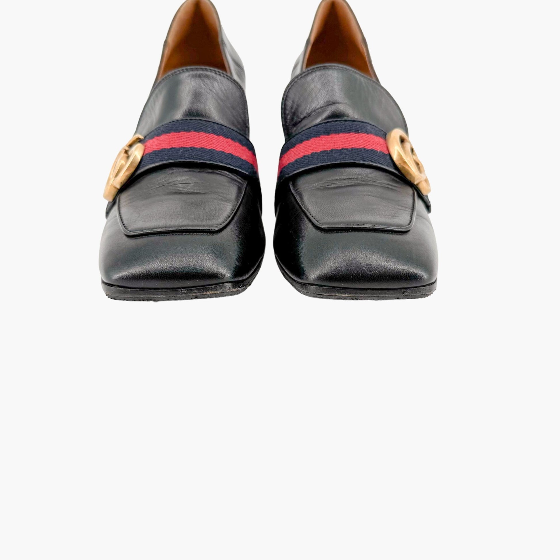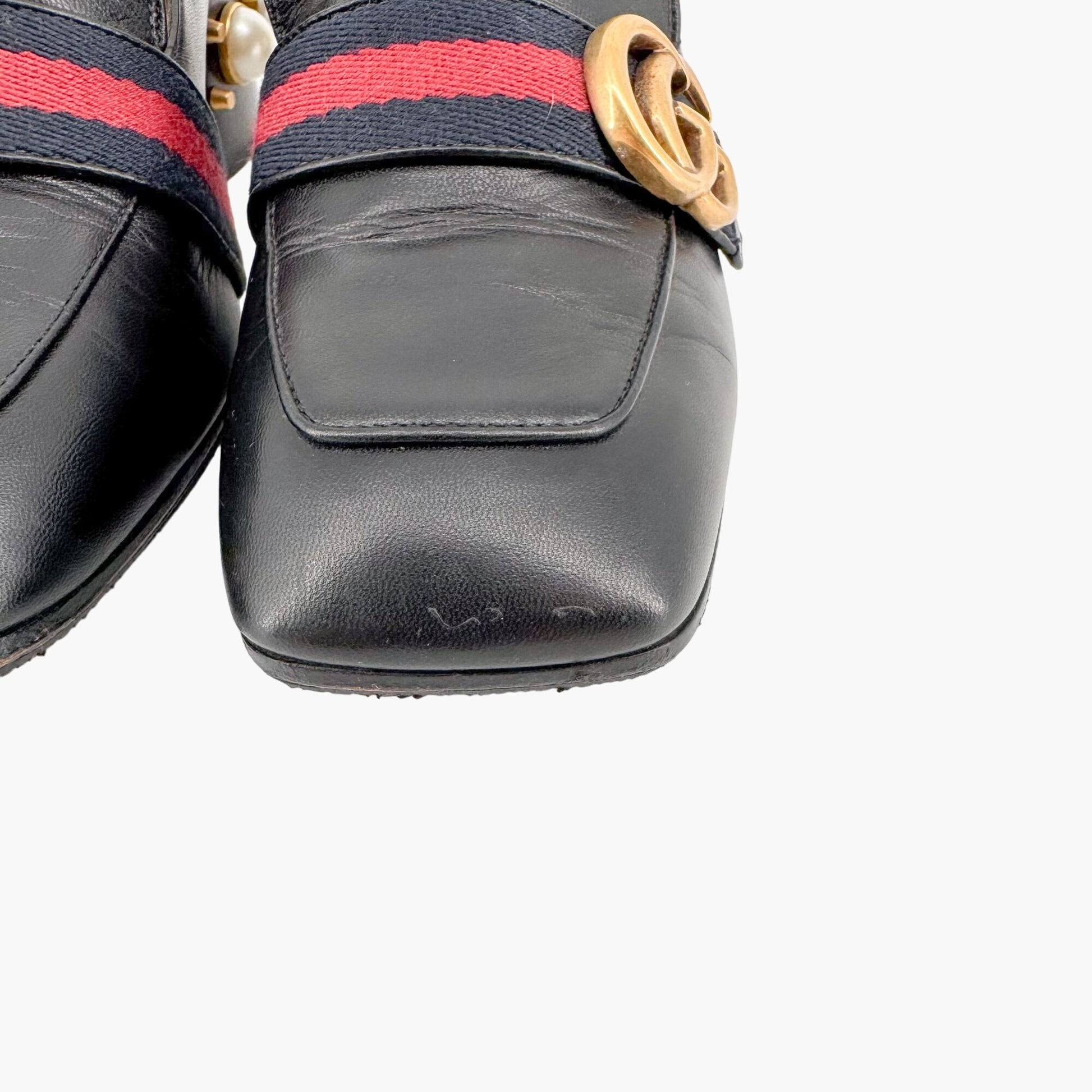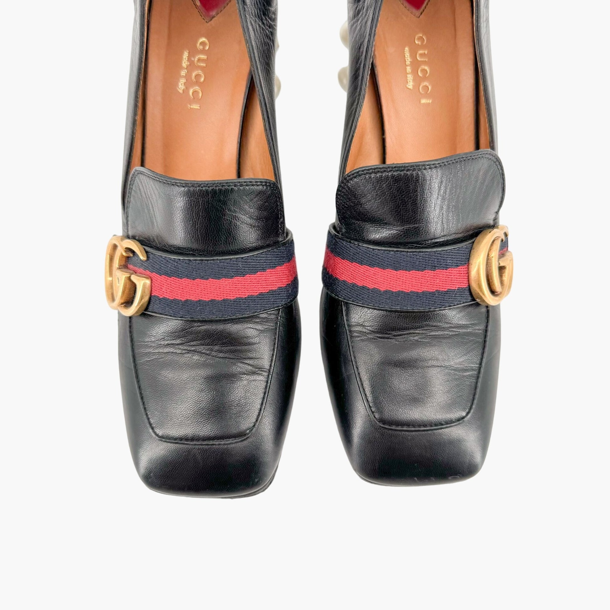 Gucci Peyton GG Pearl Loafer Pumps EU 37.5 US 7.5 Black Leather Block Heel Logo