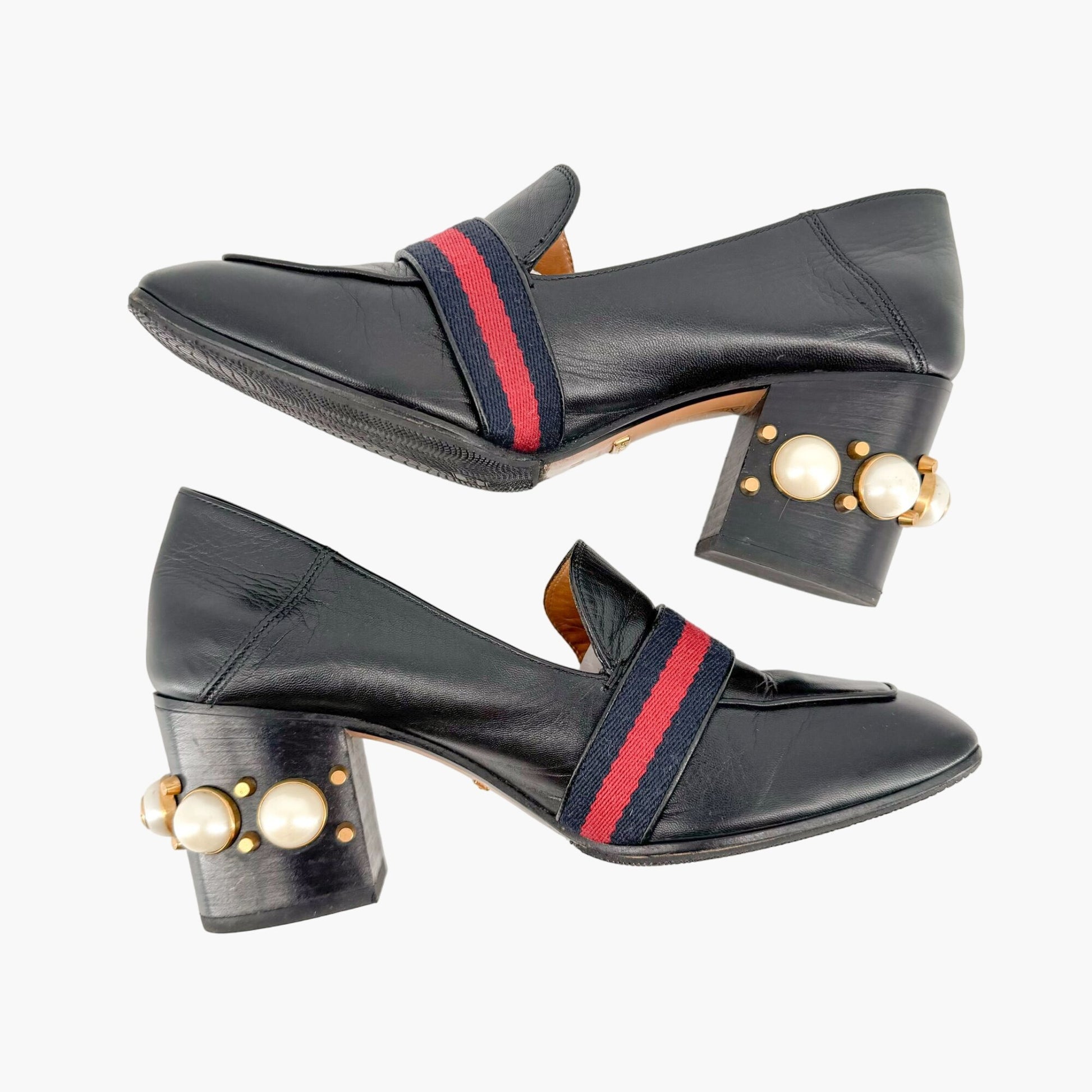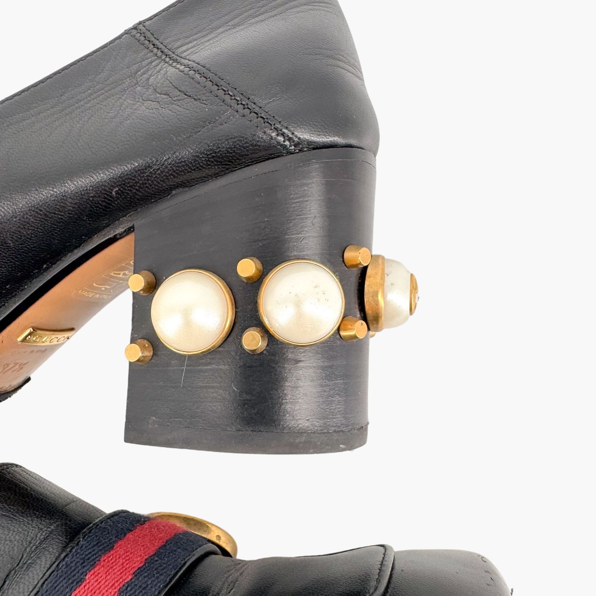 Gucci Peyton GG Pearl Embellished Block Heel Pumps in Black Leather Size 37.5