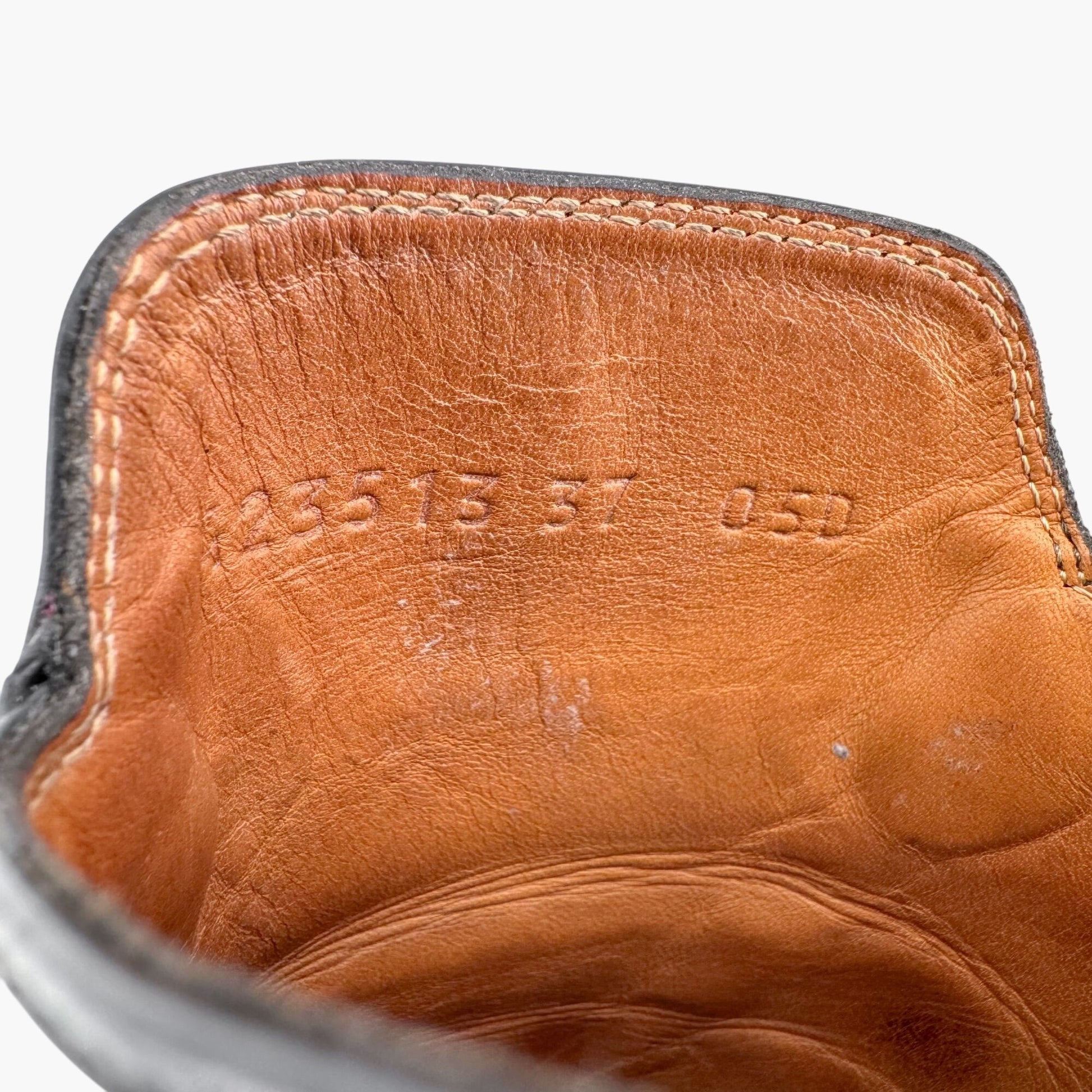 Shoes show signs of use, including creasing, scuffing on leather uppers, patina on footbeds, and wear on outsoles.