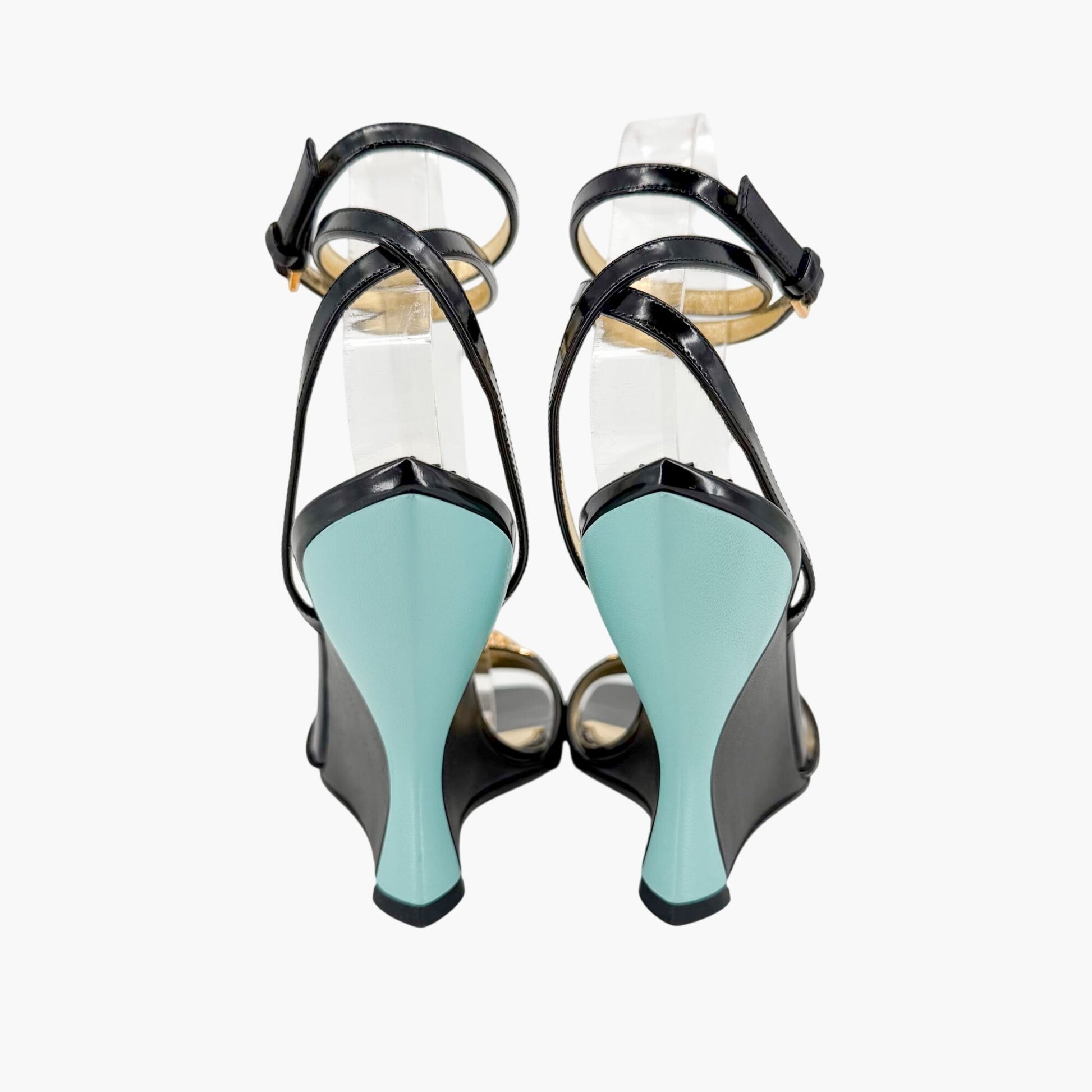 These Gucci Regent Dora wedge heels feature glossy black patent leather straps accented by a crystal-embellished gold tone snake head across the top strap. The open square toe and wrap-around ankle strap with buckle closure create a secure yet striking silhouette, while the architectural wedge heel with turquoise accent adds bold dimension. A statement sandal ideal for evening events, resort wear, summer styling, or elevated vacation looks.