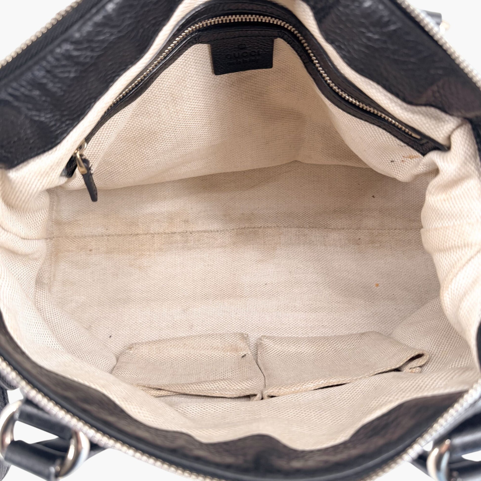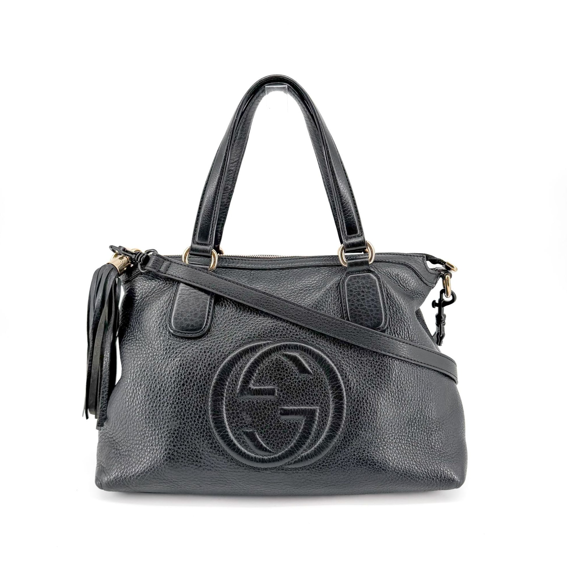 This Gucci Soho GG bag features black pebbled leather with oversized Interlocking G logo stitching, a leather tassel zipper pull, gold-tone hardware, and a canvas-lined interior. Designed with top handles and an adjustable shoulder/crossbody strap, it’s a versatile everyday carry suitable for work, travel, and polished casual styling.