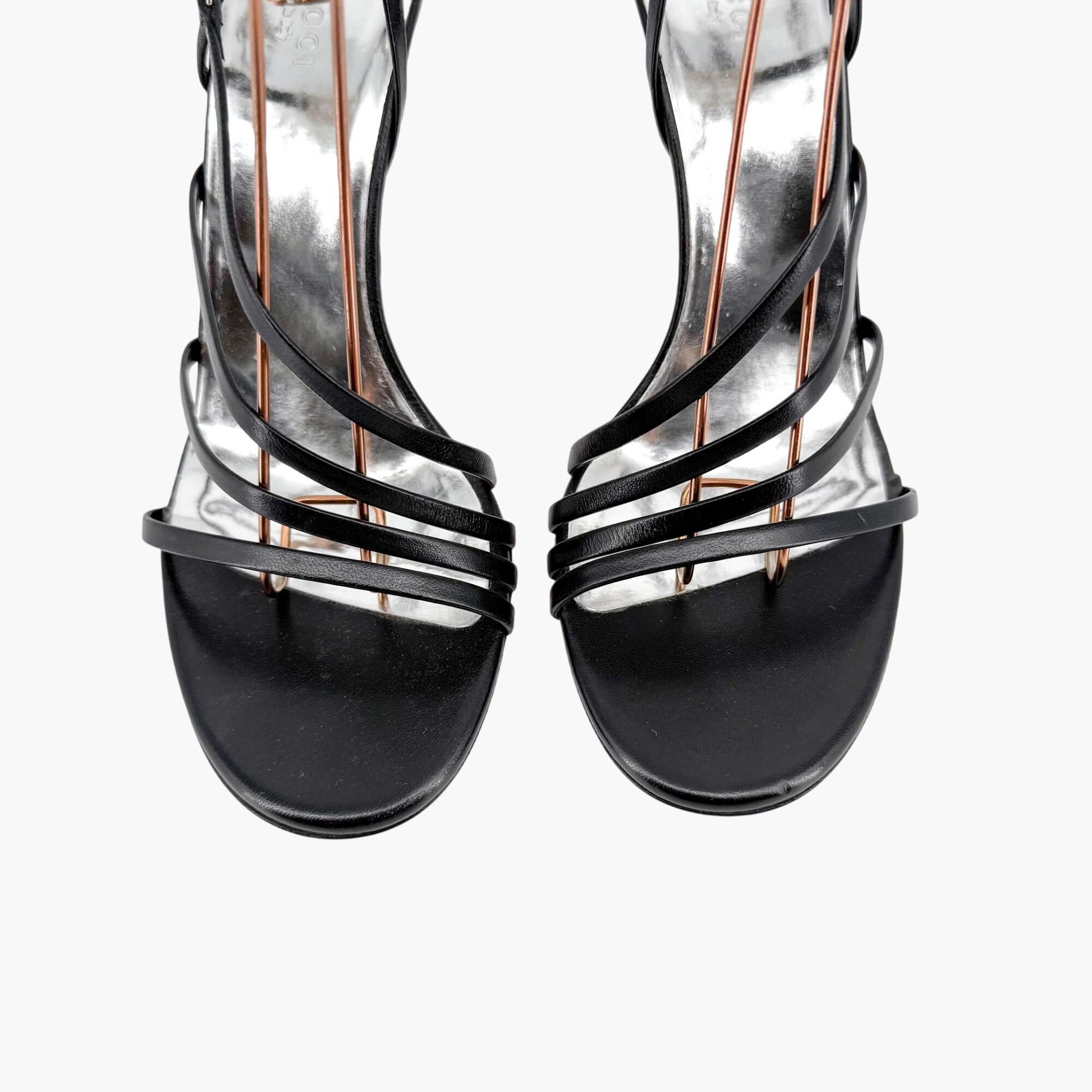 Step into luxury with these Gucci sandals, designed with a black multi-strap upper for a sleek, contemporary look. The silver-tone interlocking G accent adds a signature touch of elegance, while the ankle strap with buckle closure ensures a secure fit. With an open round toe and a high stiletto heel, these sandals are perfect for evening events, night outs, or adding a touch of sophistication to your evening ensemble. The leather footbed and lining offer comfort, and the leather outsole provides durability and style.