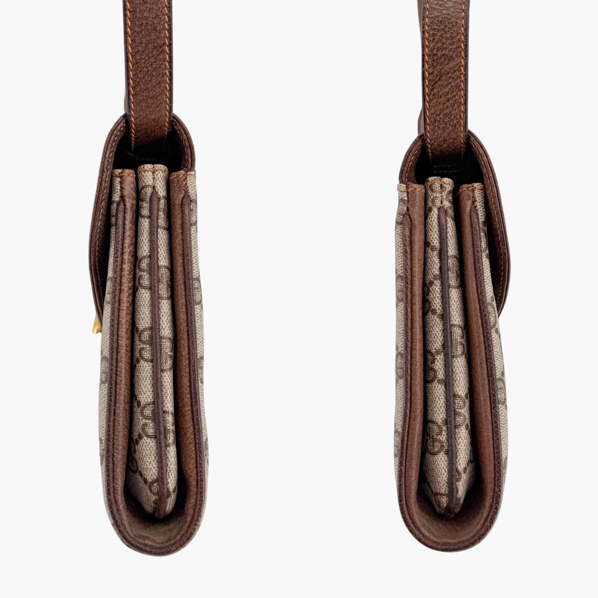 This Gucci Vintage GG crossbody bag is crafted from beige monogram coated canvas with brown leather trim and gold-tone hardware engraved with interlocking G logos. Designed with a removable and adjustable strap, it can be worn as a shoulder or crossbody bag — a versatile choice for everyday wear or travel.
