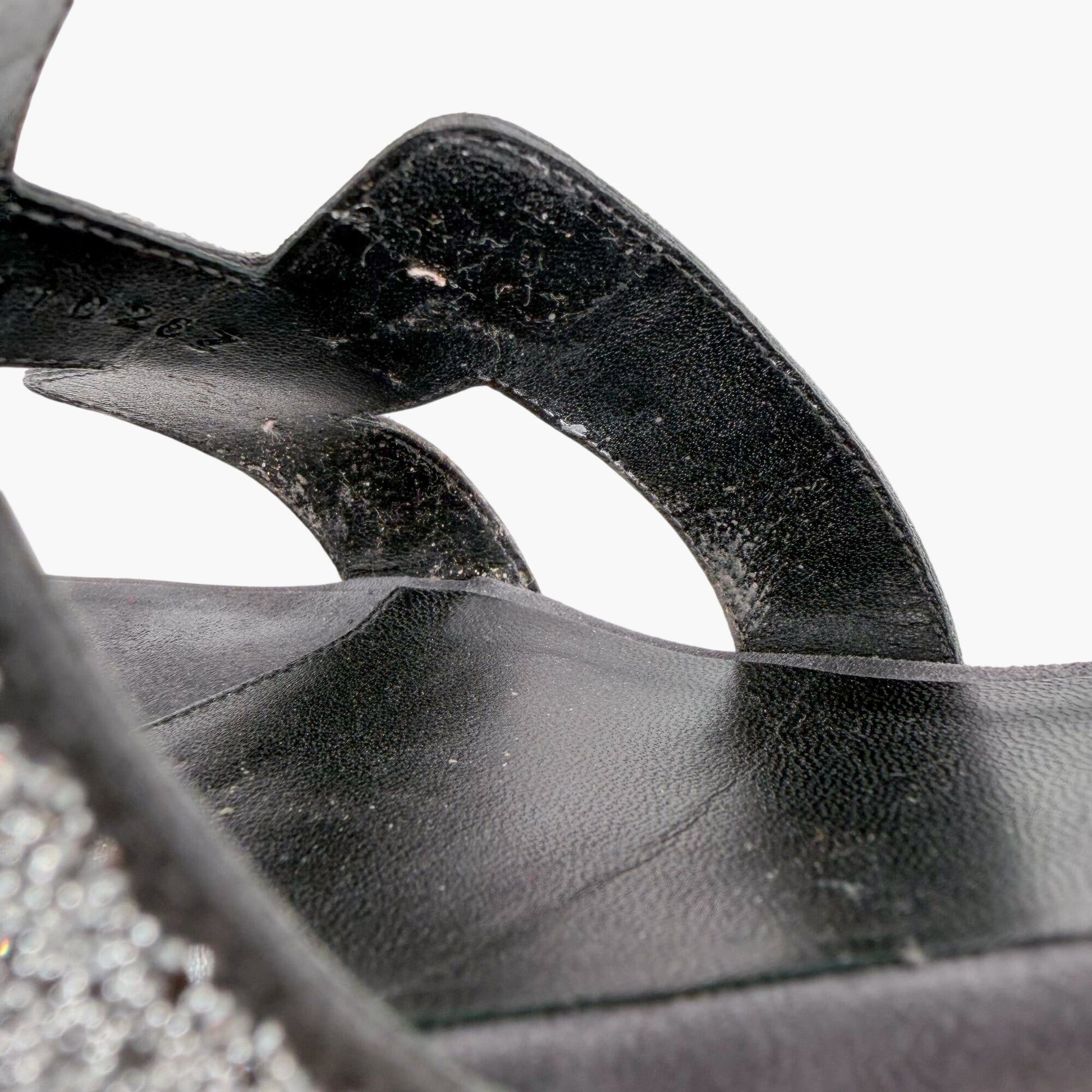 Shoes show signs of use, including residue/discoloration on suede footbeds (beneath toes), scuffing/discoloration at tips of toes, and scuffing on outsoles/heels. Otherwise in good overall condition.