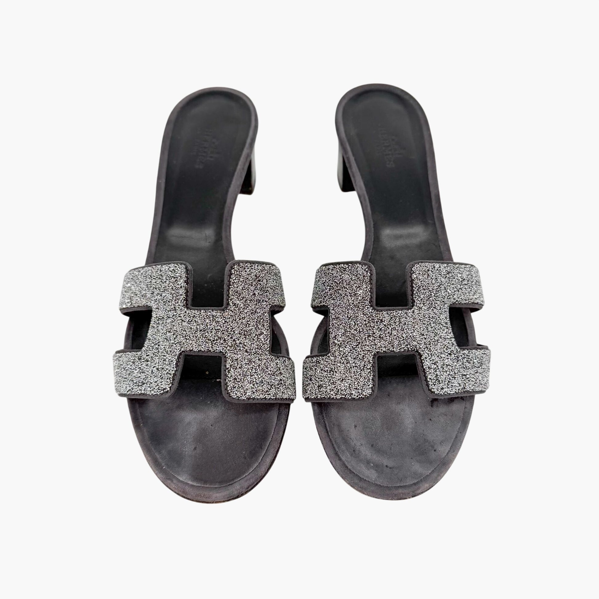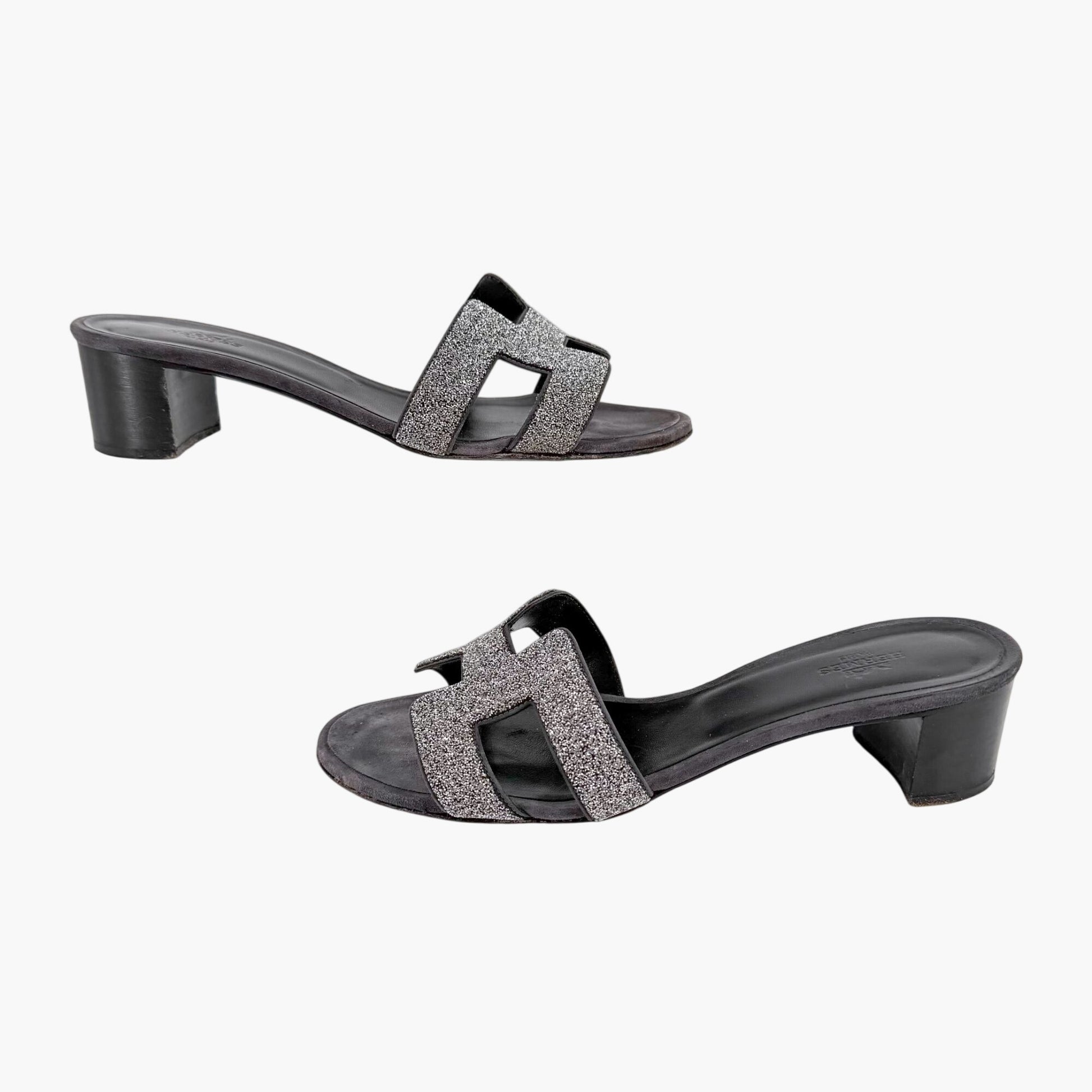 These Hermès Oasis slide sandals feature the iconic H-shaped cutout upper embellished with silver crystal and glitter detailing. The slip-on silhouette includes an open round toe and stacked block heel, creating a refined designer sandal that pairs easily with warm-weather outfits or elevated casual styling.
