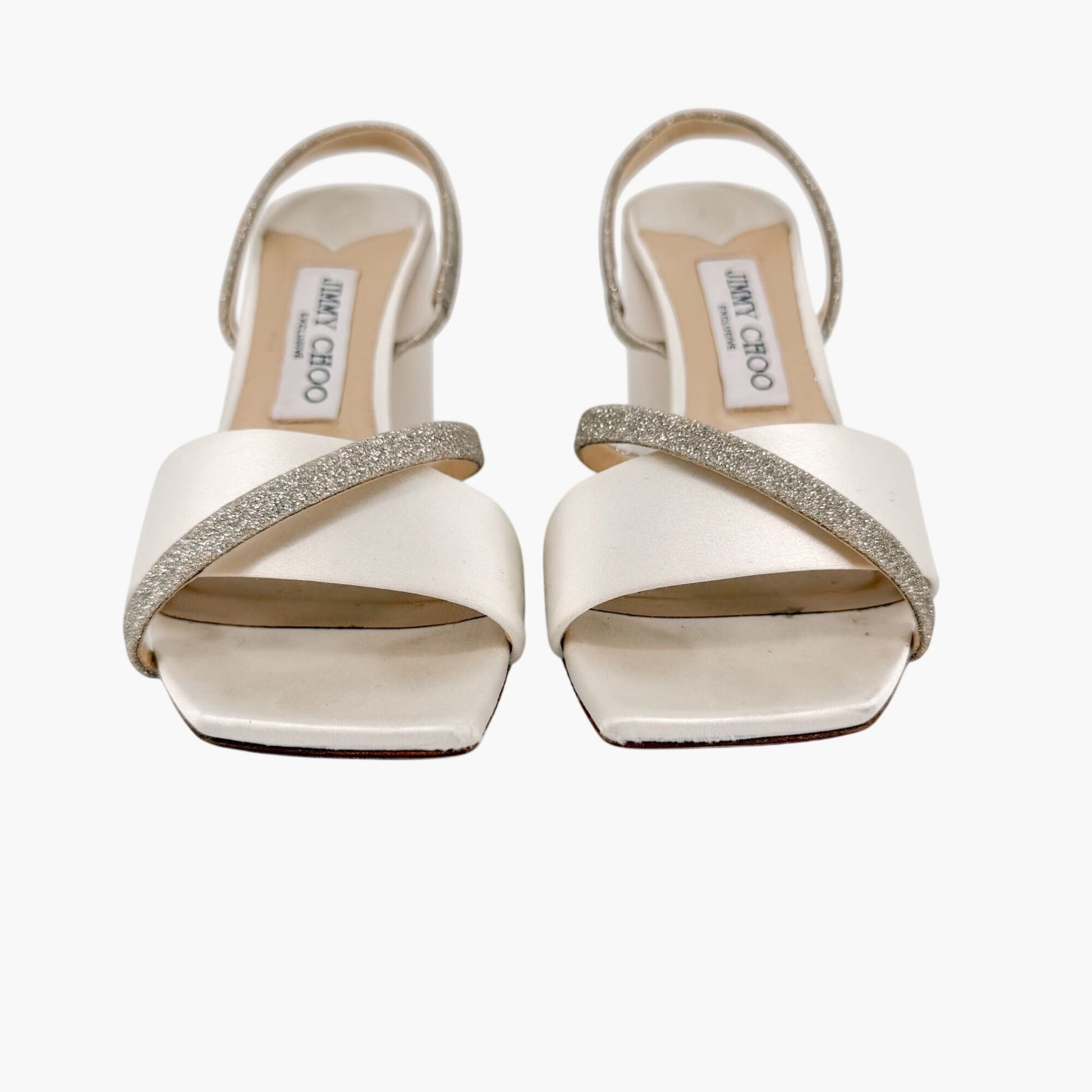 These Jimmy Choo Plum 85 sandals feature ivory satin with platinum glitter accents and a sleek strappy silhouette. The open square toe and slingback strap paired with a block heel make them ideal for weddings, bridal events, or pairing with dresses and formalwear.