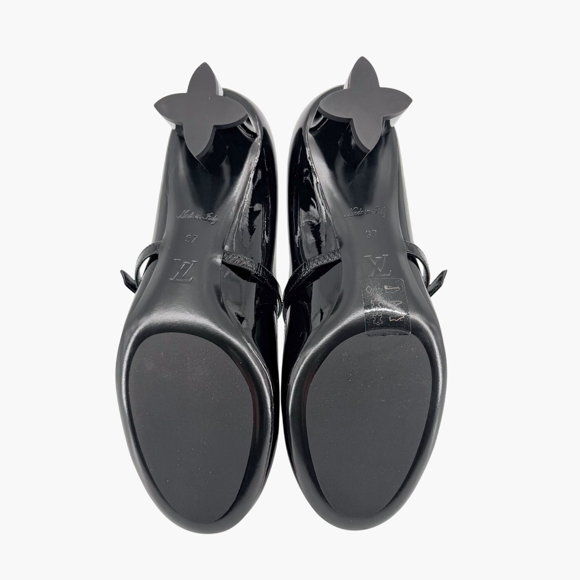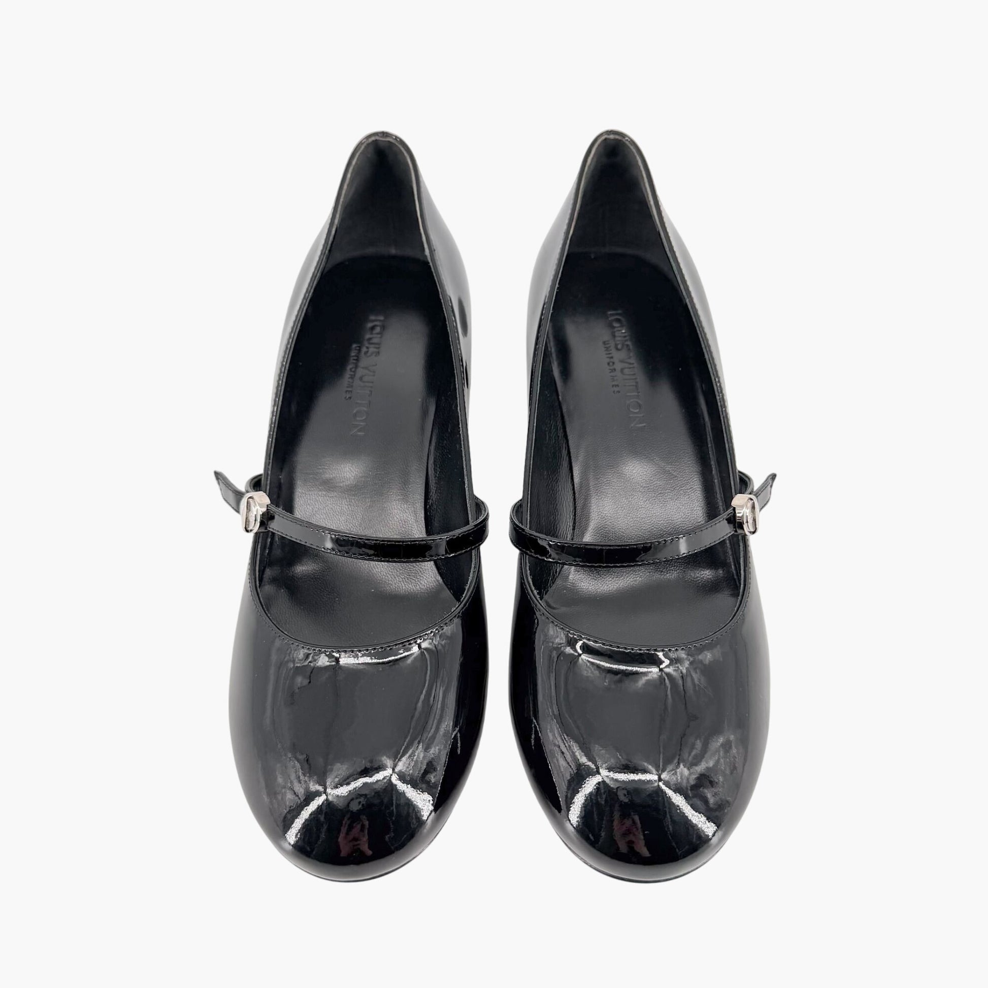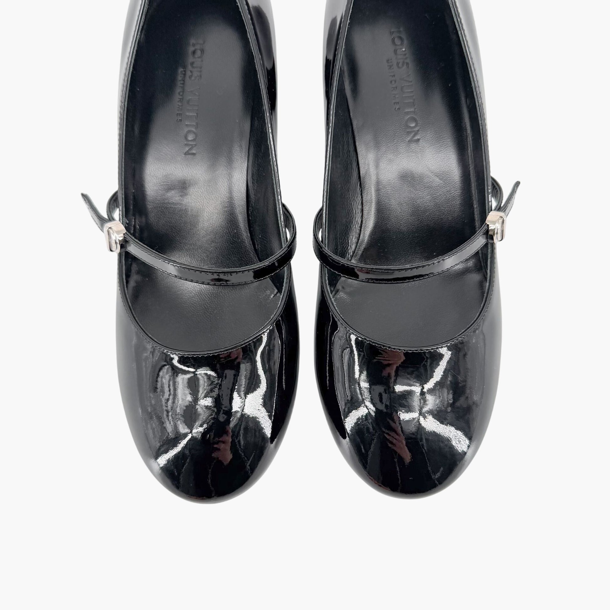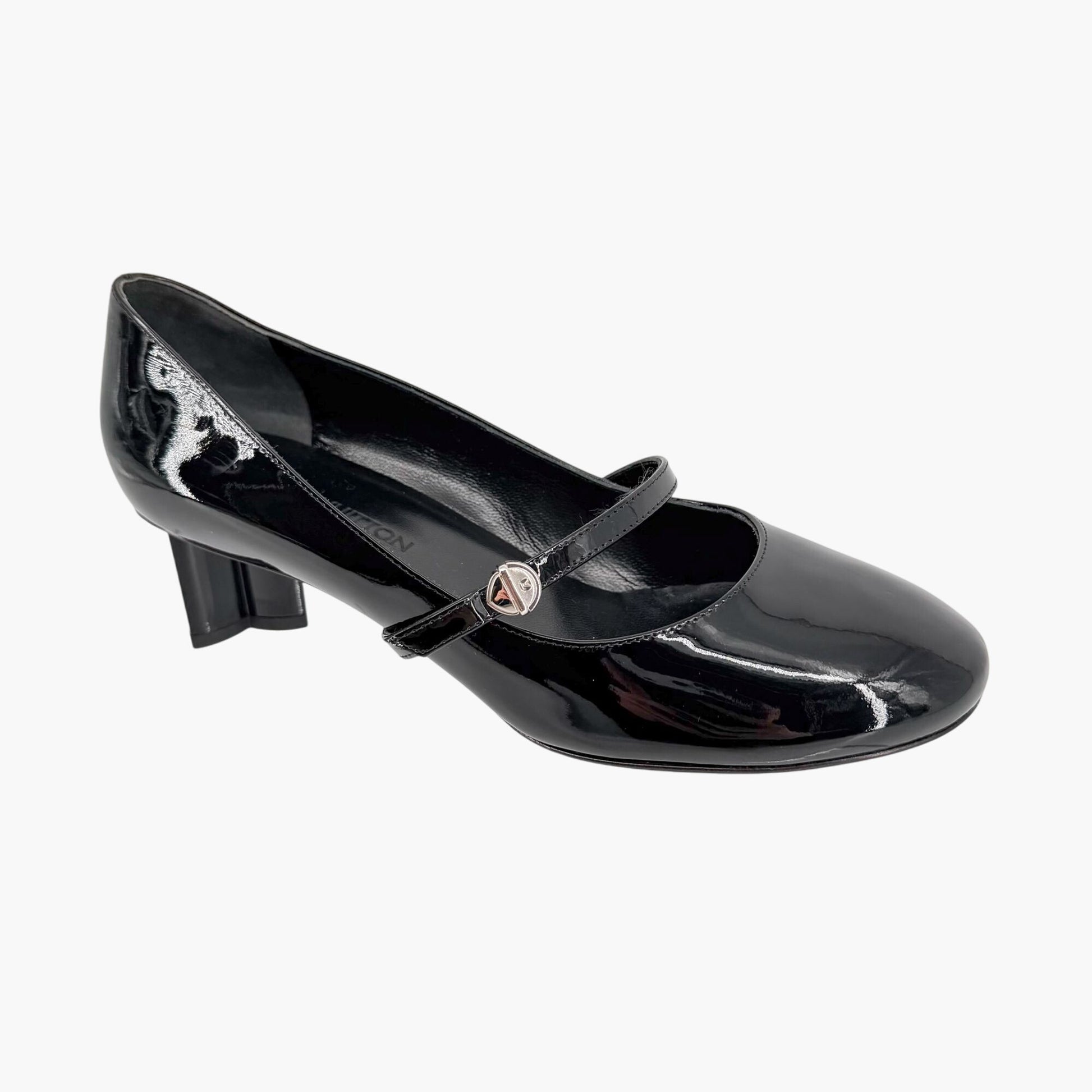 These Louis Vuitton Uniformes pumps feature glossy black patent leather uppers with Mary Jane–style straps detailed by LV logo accents. Designed with round toes, leather lining, and low flower-shaped block heels, they offer refined elegance with a playful twist.