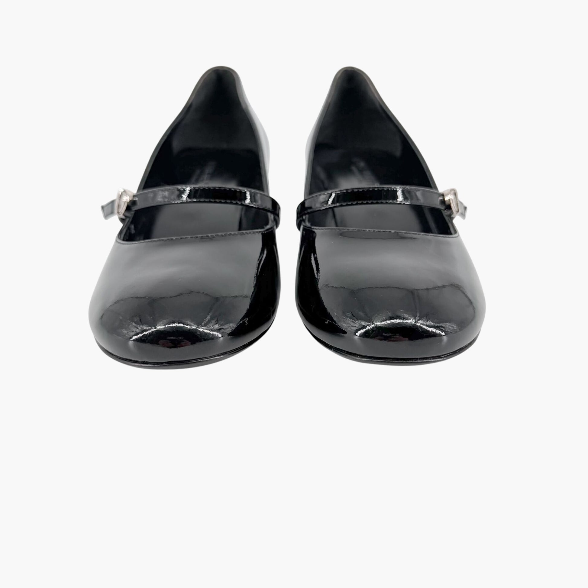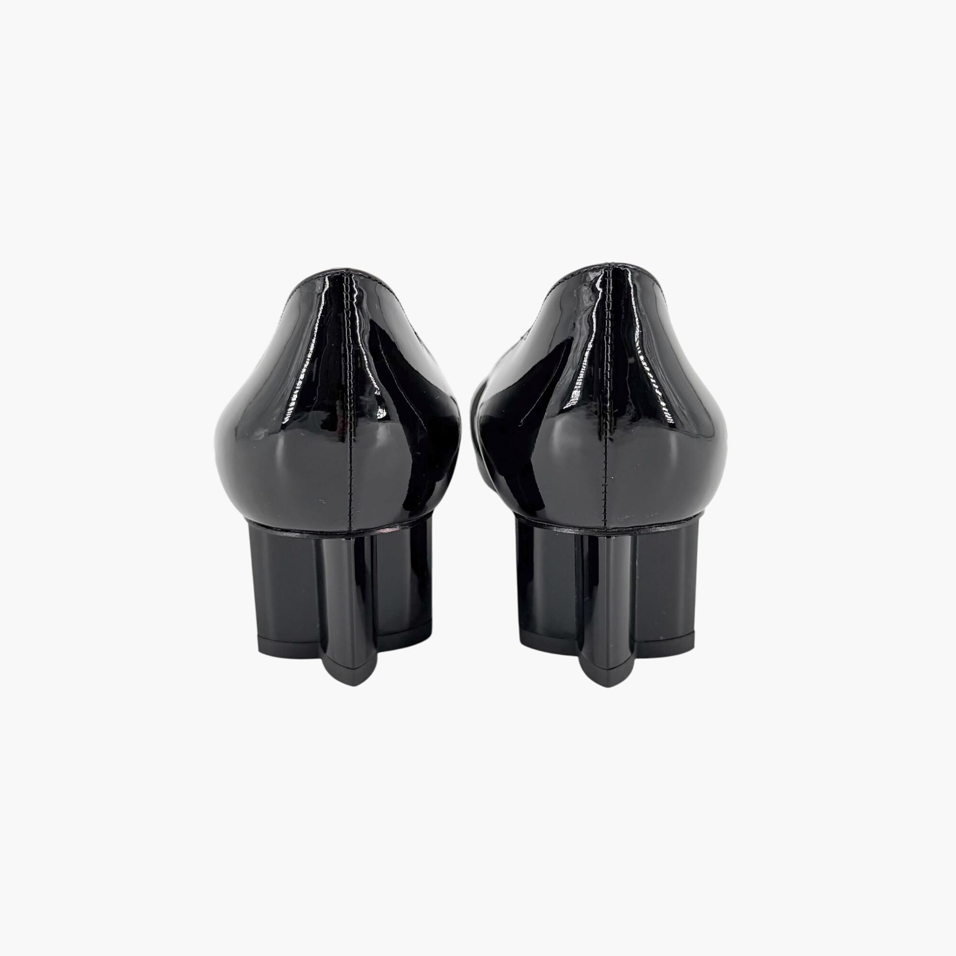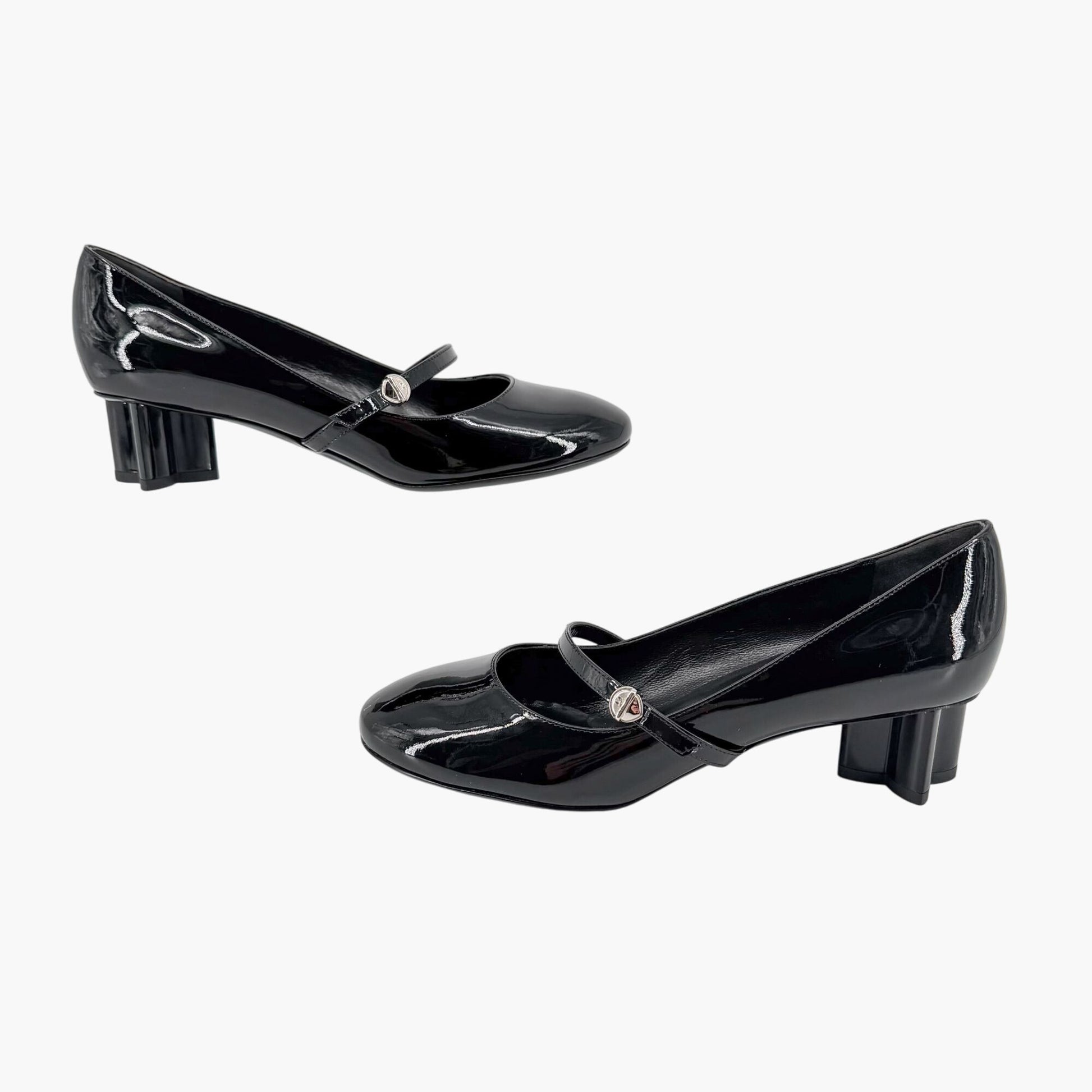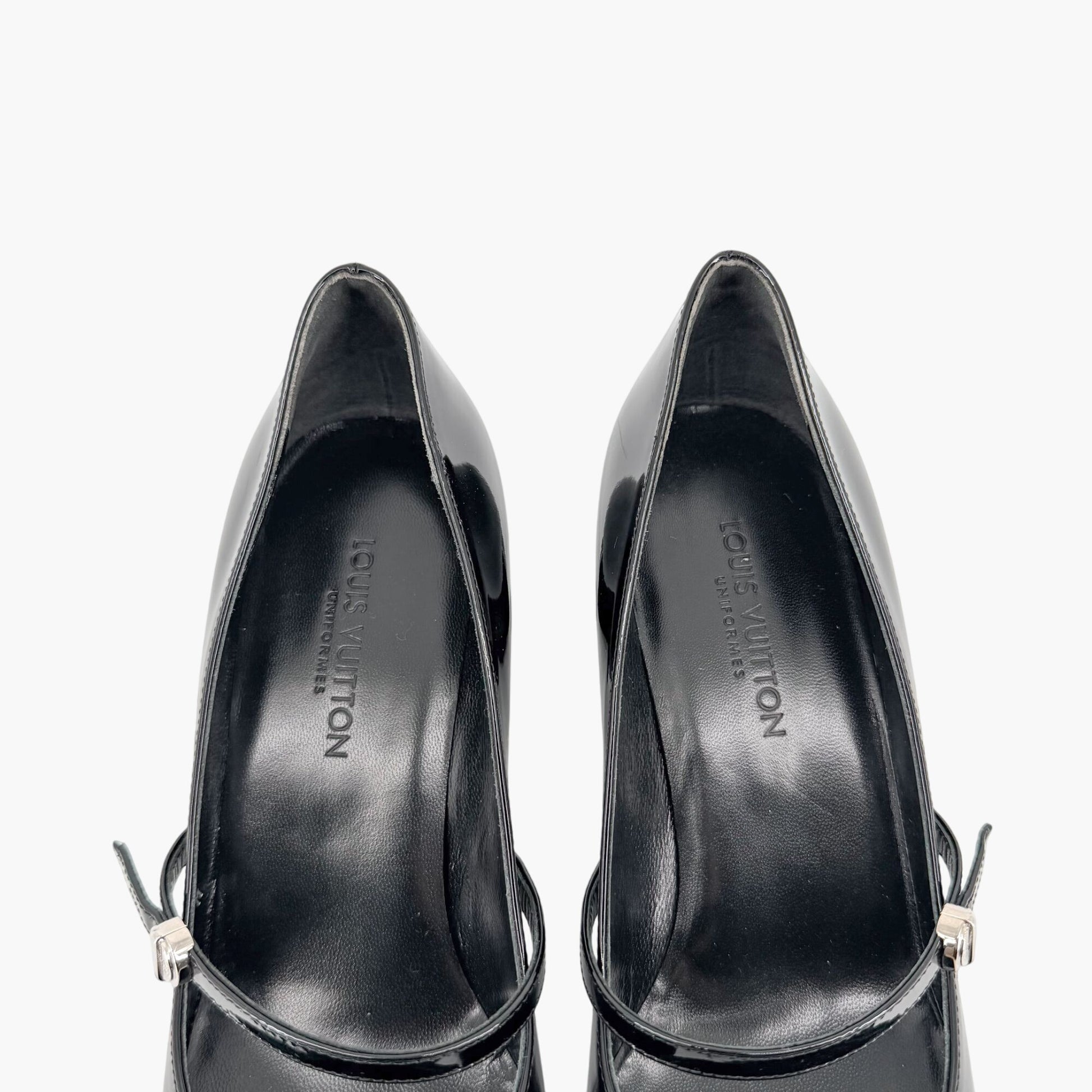 These Louis Vuitton Uniformes pumps feature glossy black patent leather uppers with Mary Jane–style straps detailed by LV logo accents. Designed with round toes, leather lining, and low flower-shaped block heels, they offer refined elegance with a playful twist.
