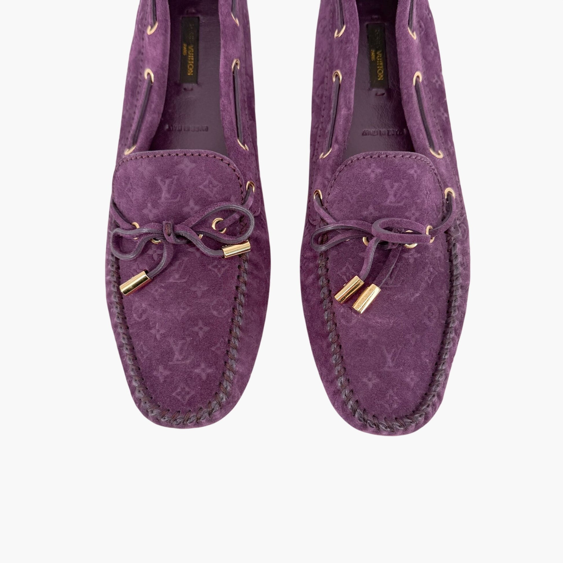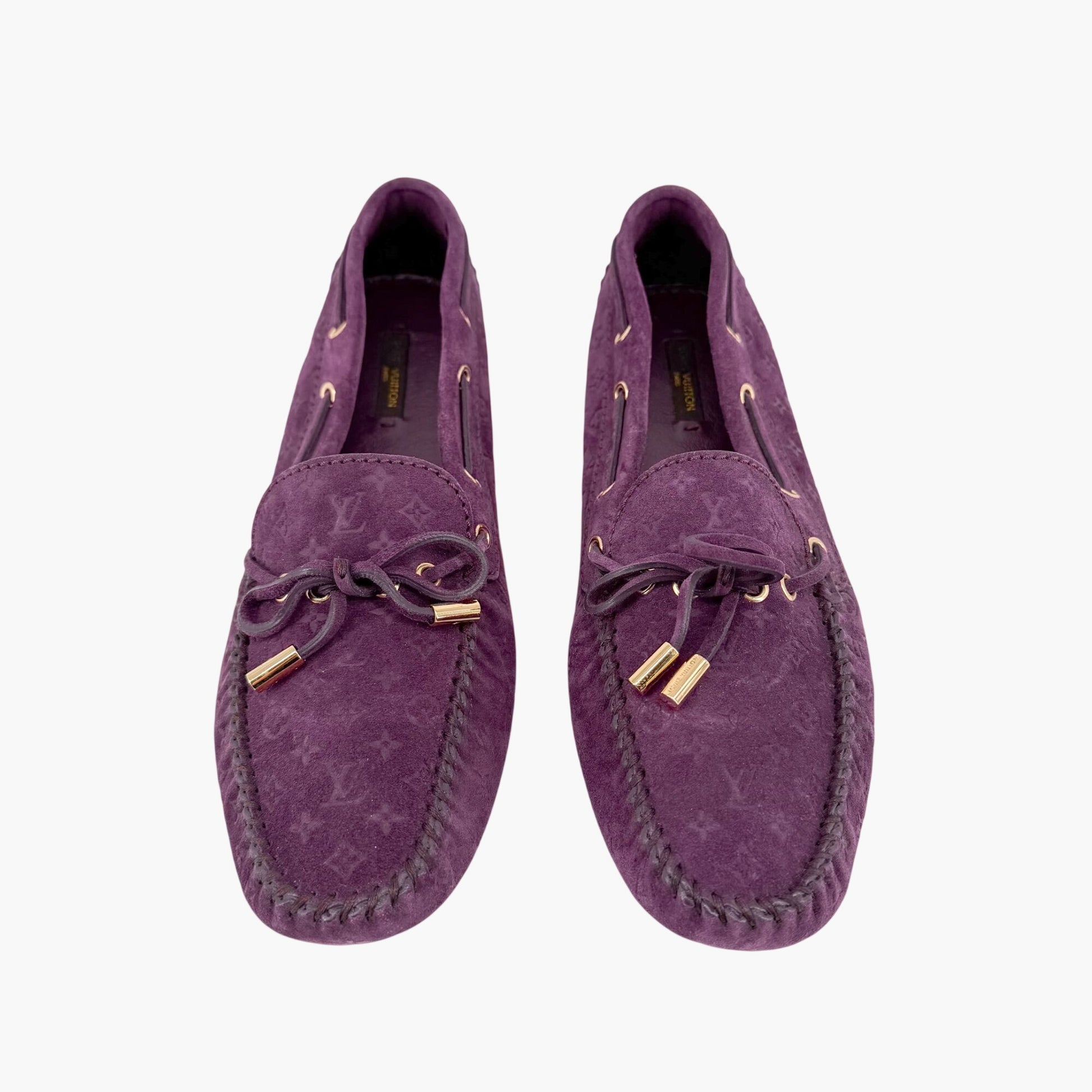 These Louis Vuitton Gloria moccasin loafers feature rich purple suede uppers debossed with the iconic LV monogram. Designed with a tapered square toe, bow detail with branded aglets, and classic slip-on moccasin construction, they offer a refined yet relaxed silhouette. Finished with leather footbeds and lining, these flats are ideal for everyday wear, work outfits, and polished casual styling.