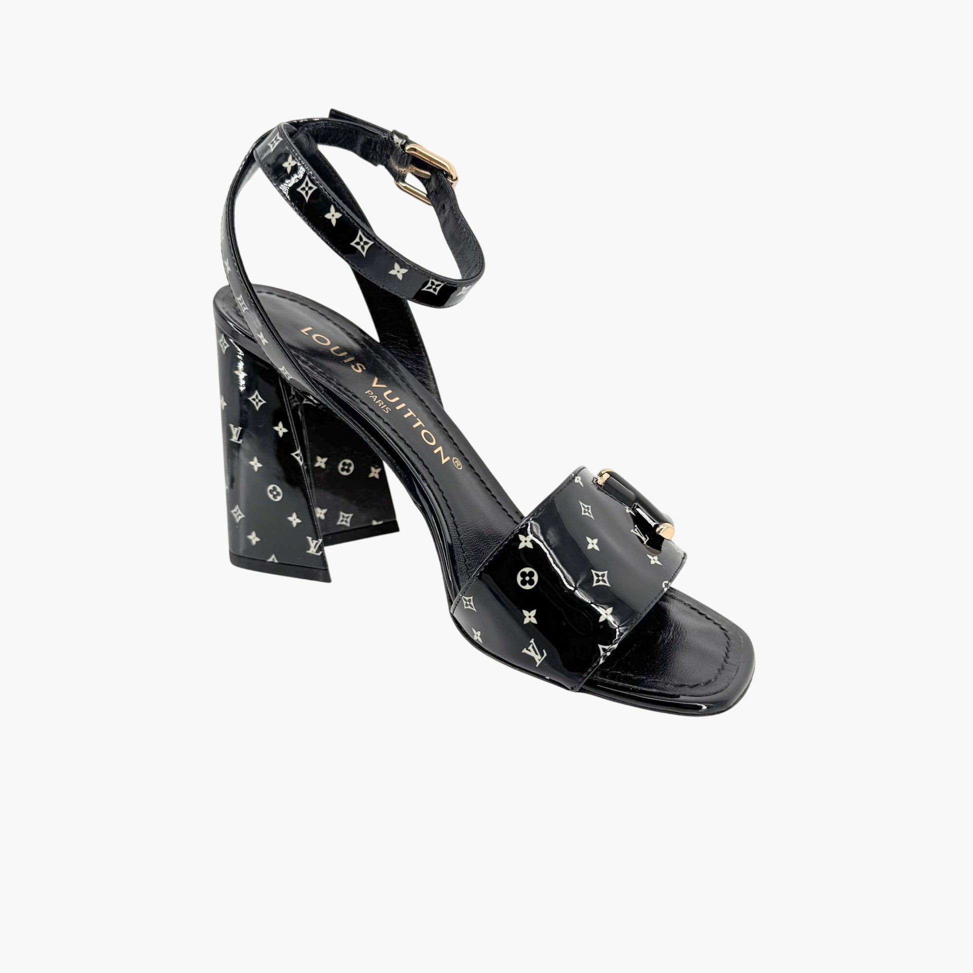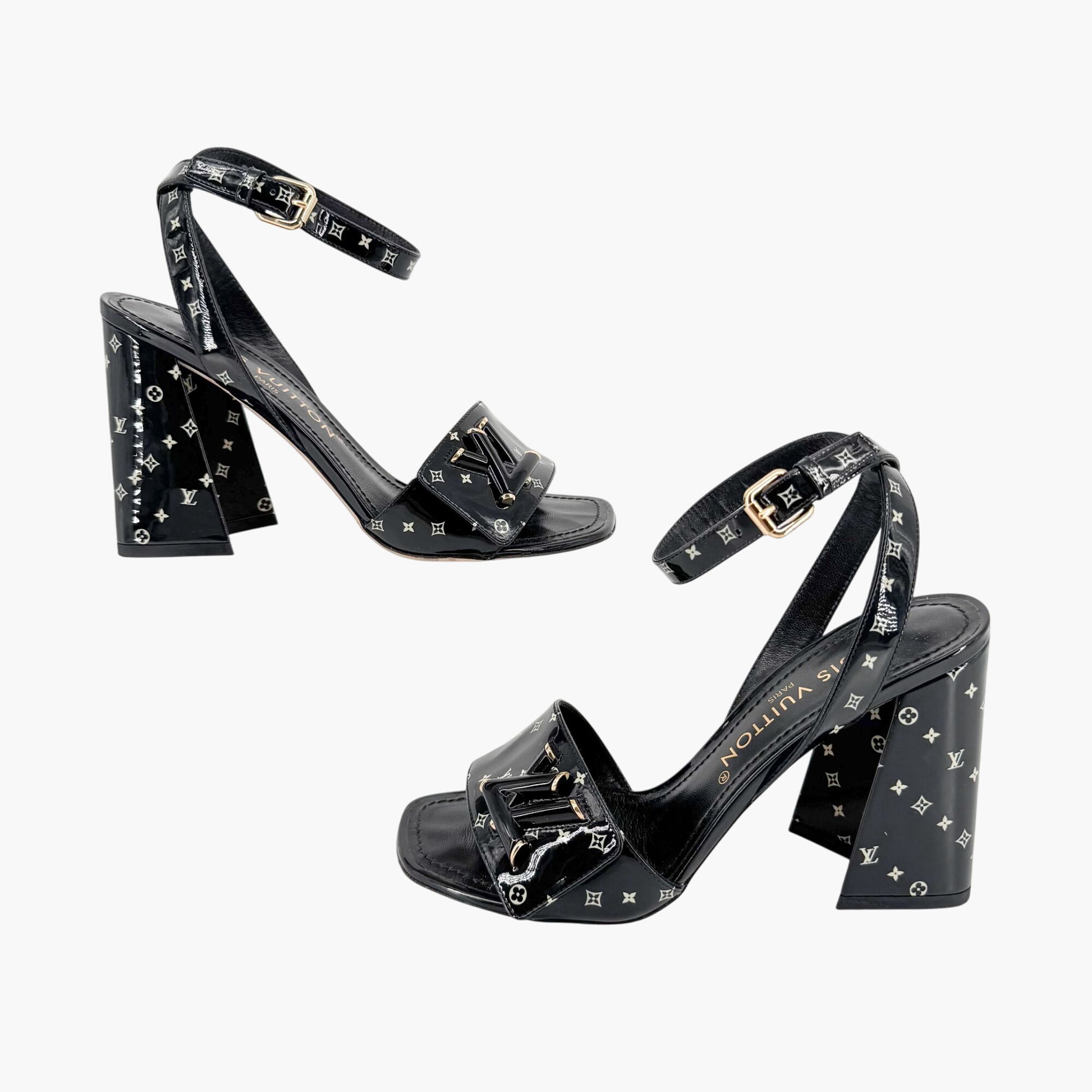 These Louis Vuitton Shake sandals make a bold, modern statement. The glossy black patent leather upper is printed with a crisp white LV monogram pattern, creating a striking contrast. A wide front strap is accented with a distinctive LV turnlock-style detail for added edge. Designed with an open square toe and adjustable ankle strap, these sandals provide both style and a secure fit. The angled block heel offers architectural flair while maintaining comfort. Finished with a leather footbed, lining, and outsole, they’re perfect for summer events, evenings out, or elevating minimal looks with a graphic designer touch. Comes with the original box and two dust bags.