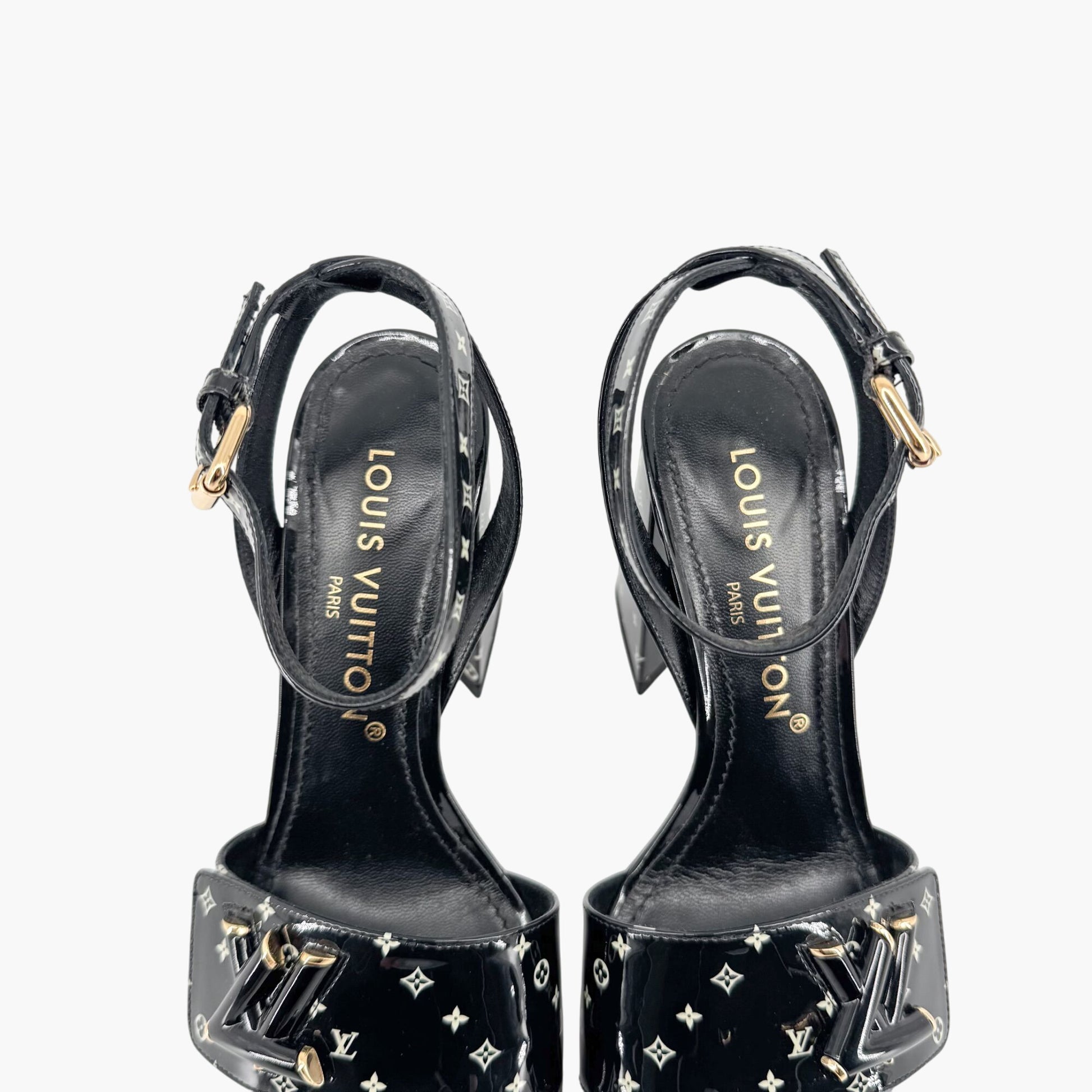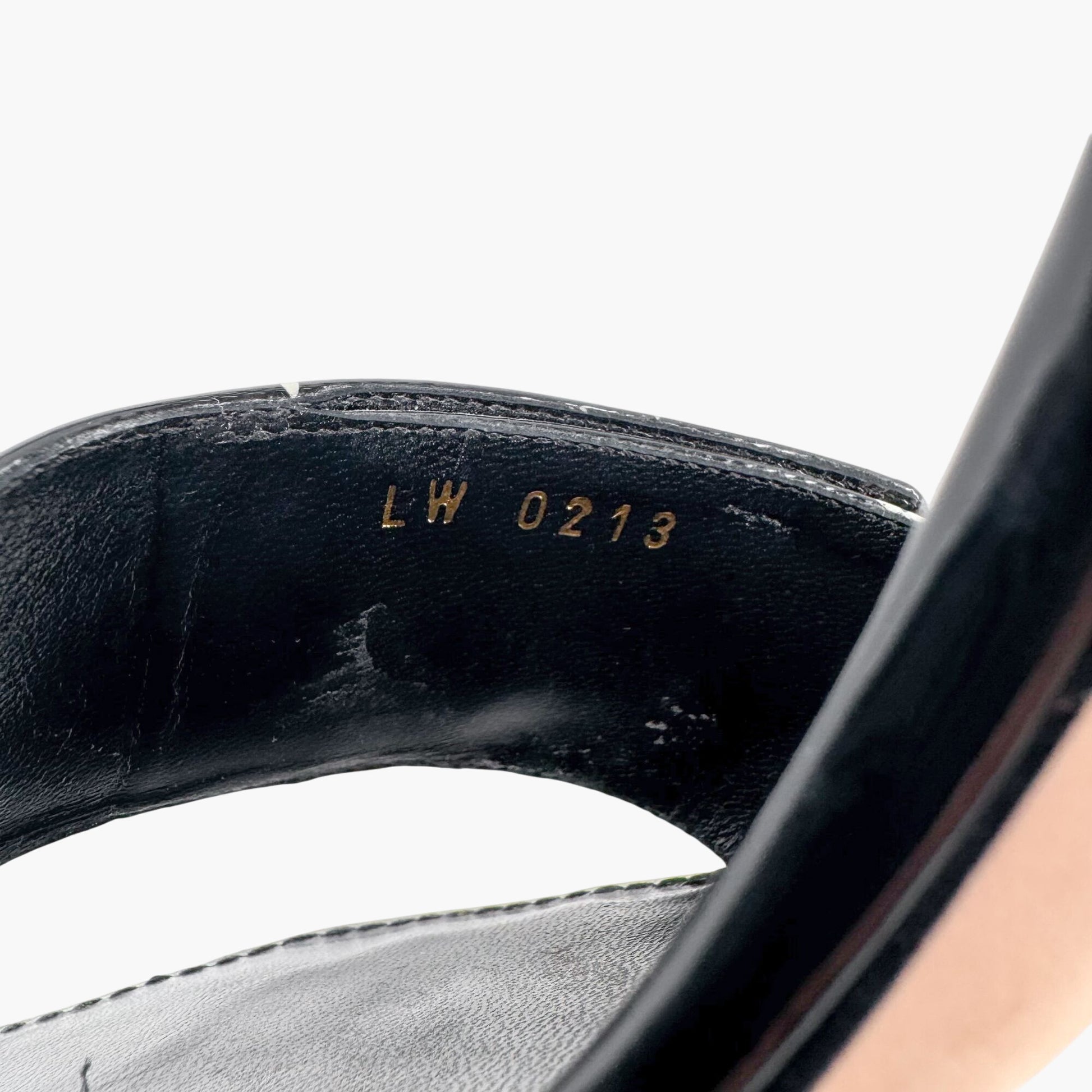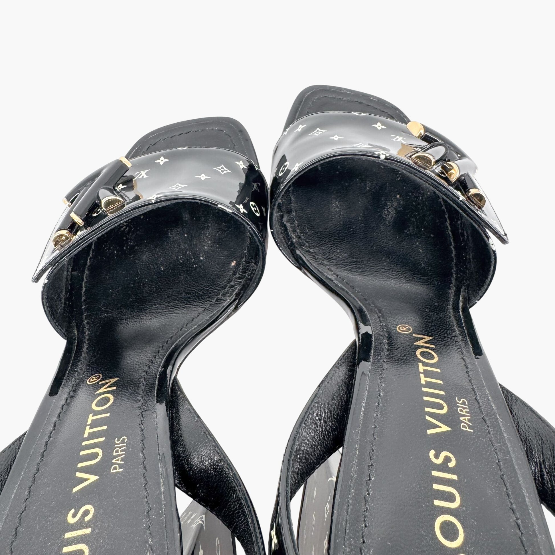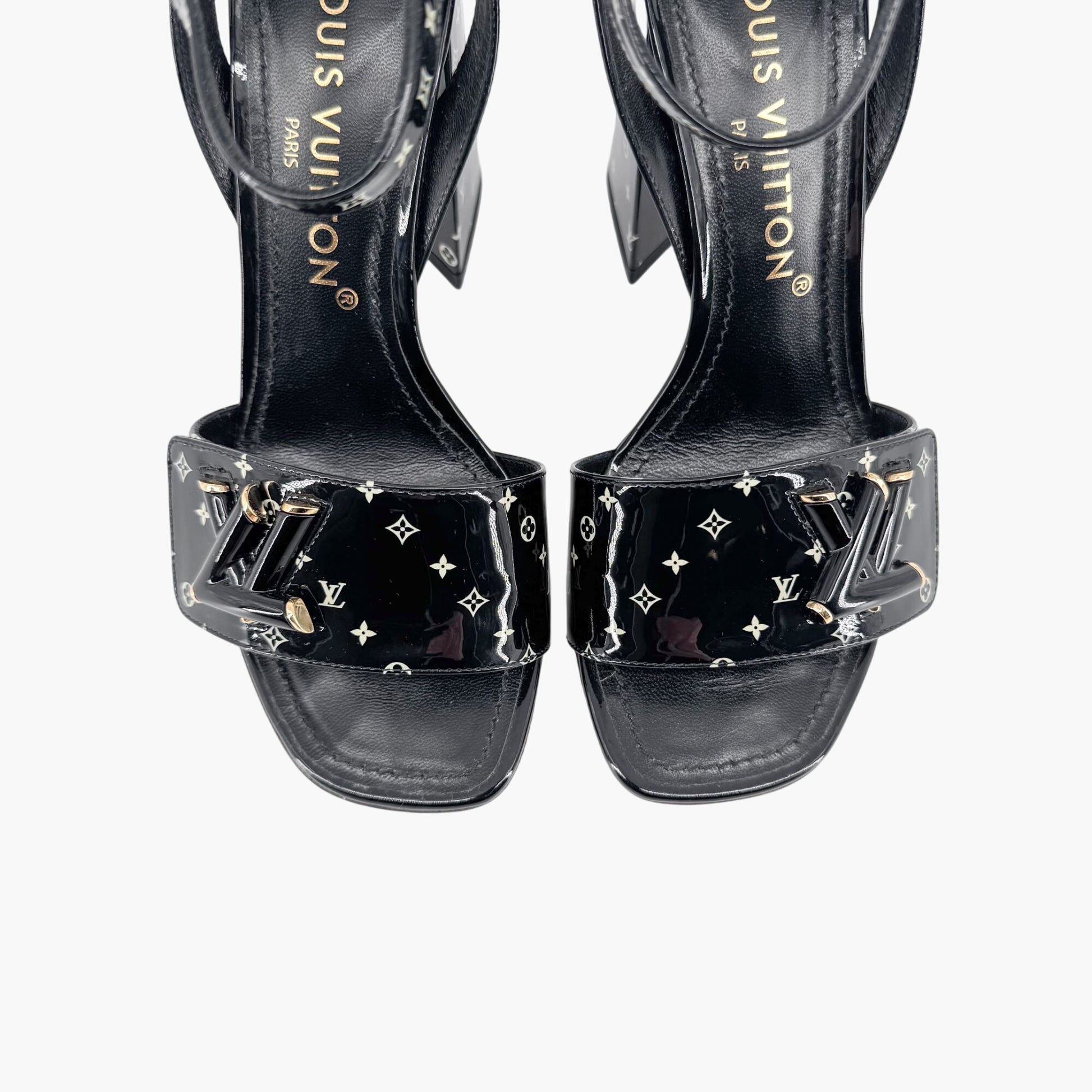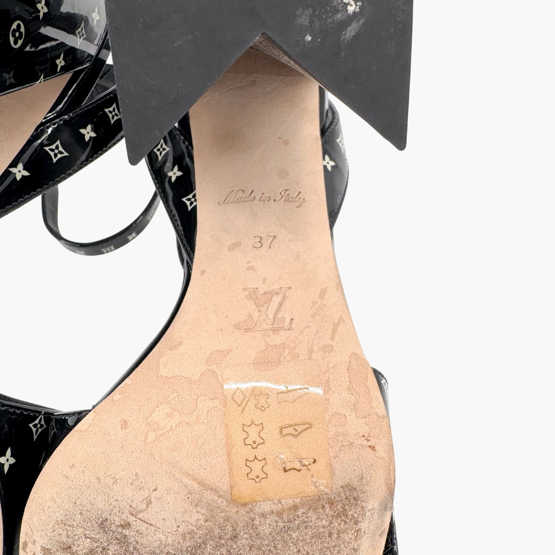 - Glossy black patent leather upper with white LV logo pattern