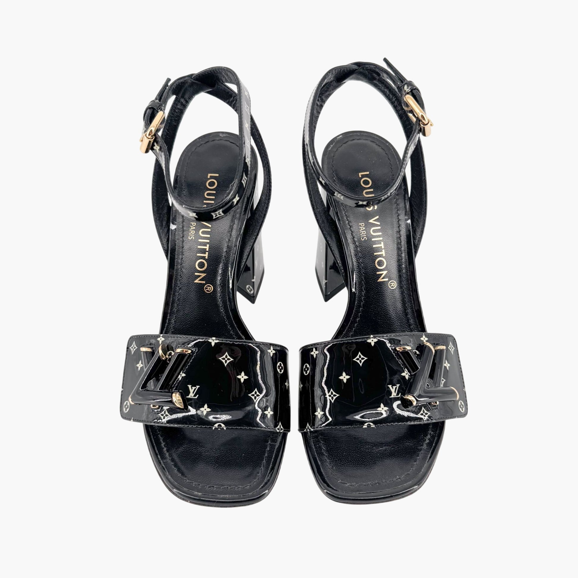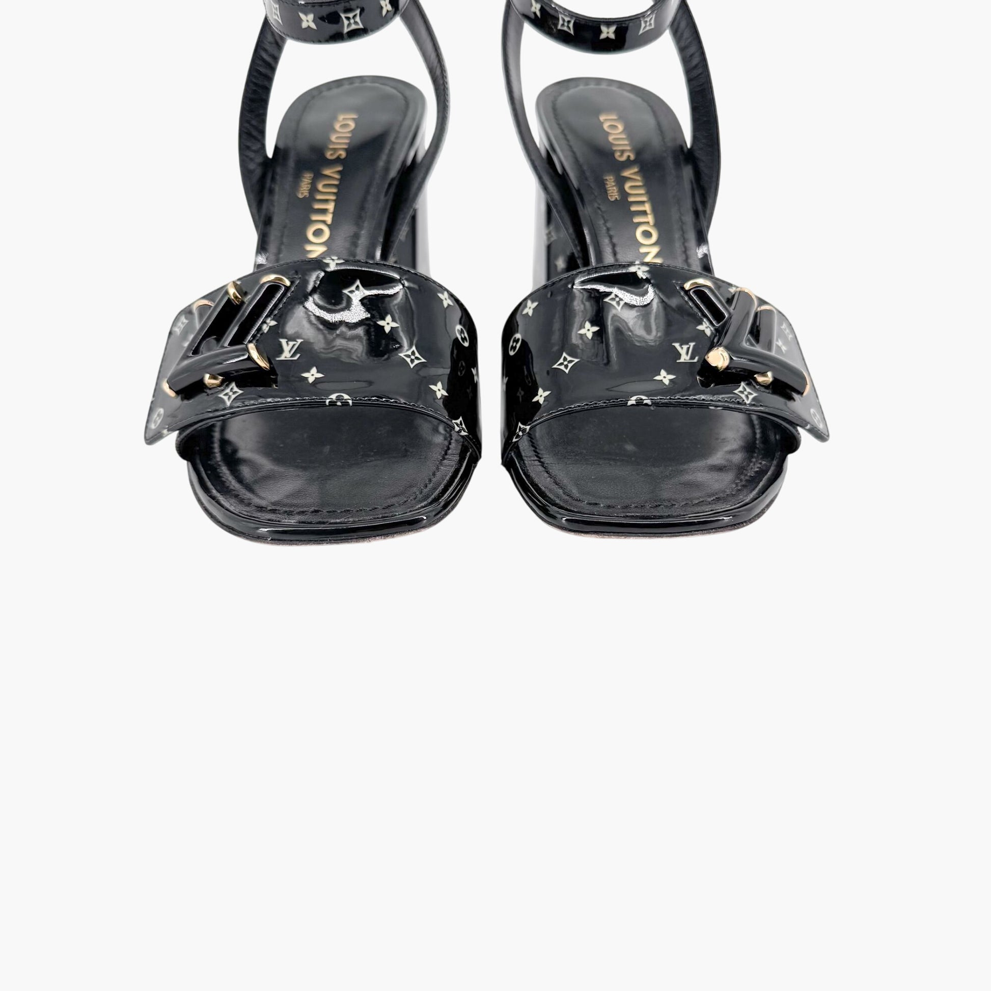 Louis Vuitton Shake LV Turnlock Sandals Size 37 US 7 Black Patent Block Heel