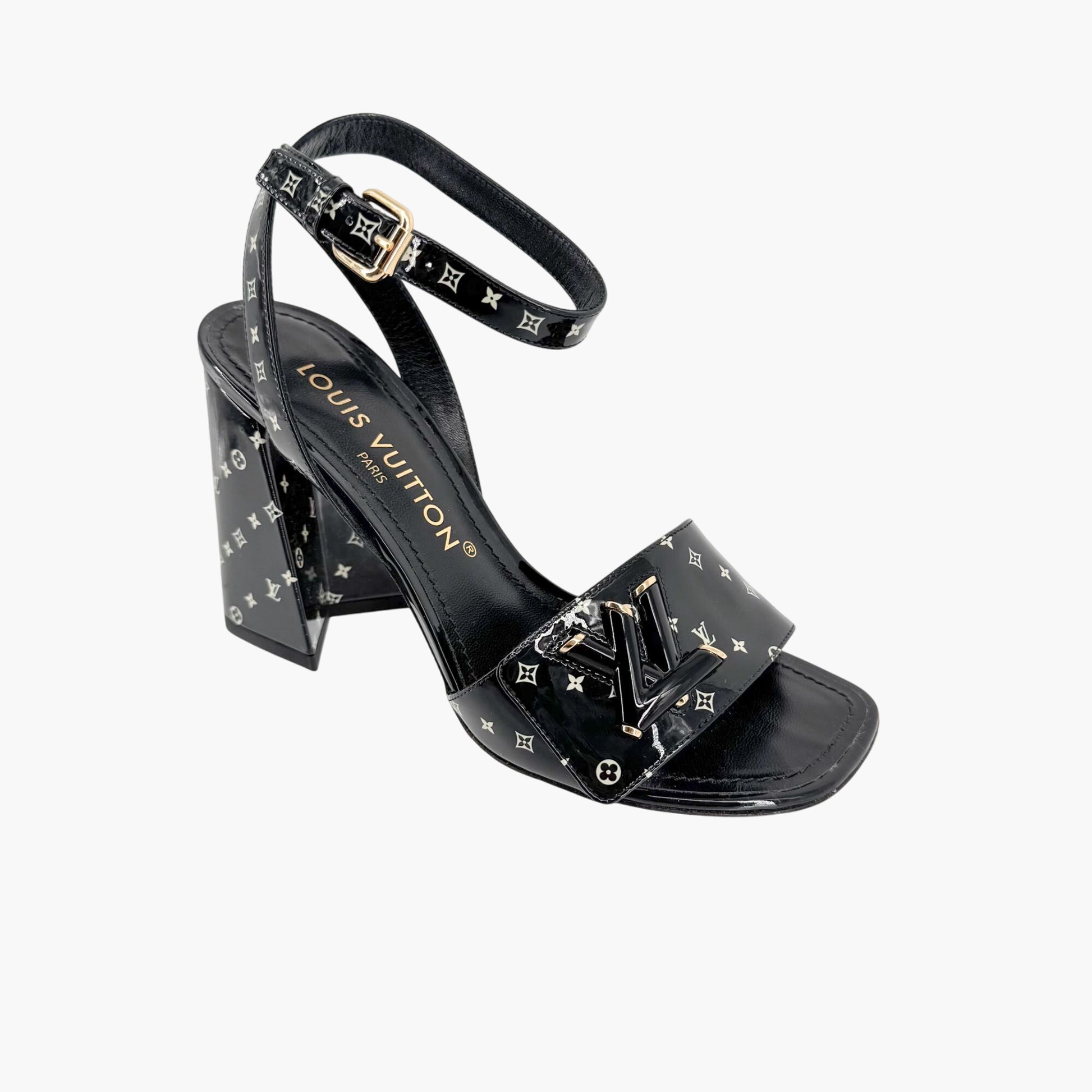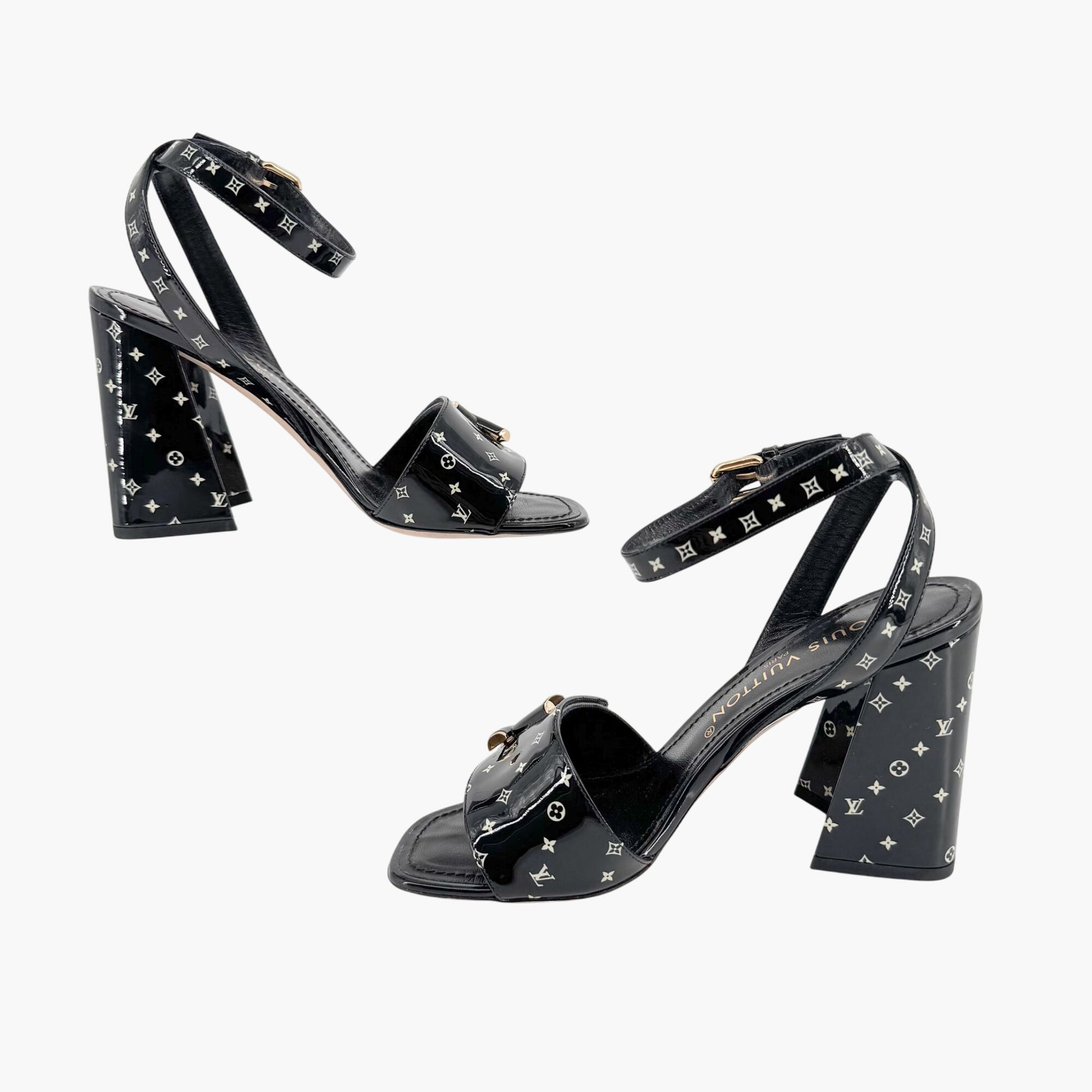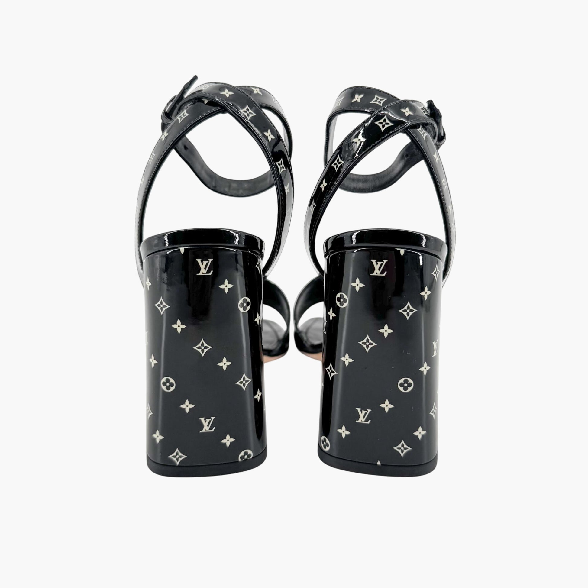 Louis Vuitton Shake LV Block Heel Sandals in Black & White Monogram Patent Leather Size 37