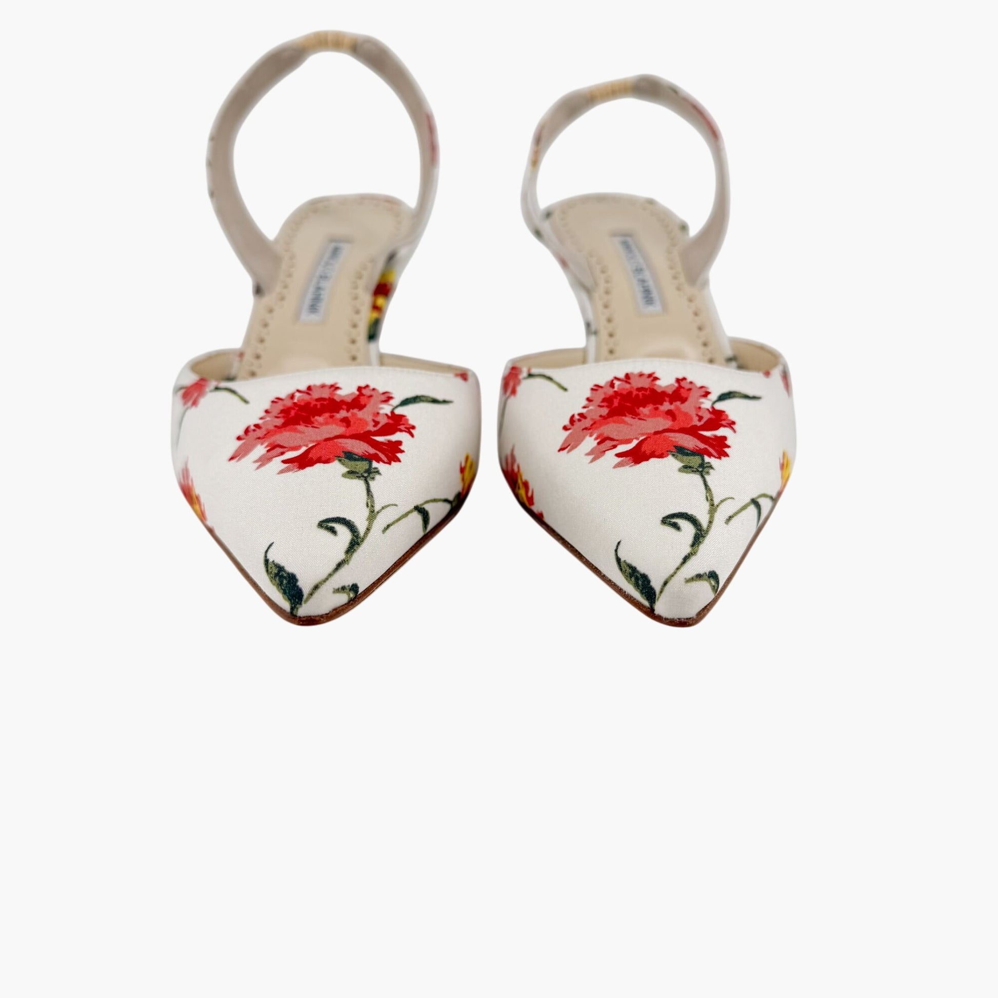 Manolo Blahnik Carolyne 50 Floral Satin Slingback Heels Size 40.5