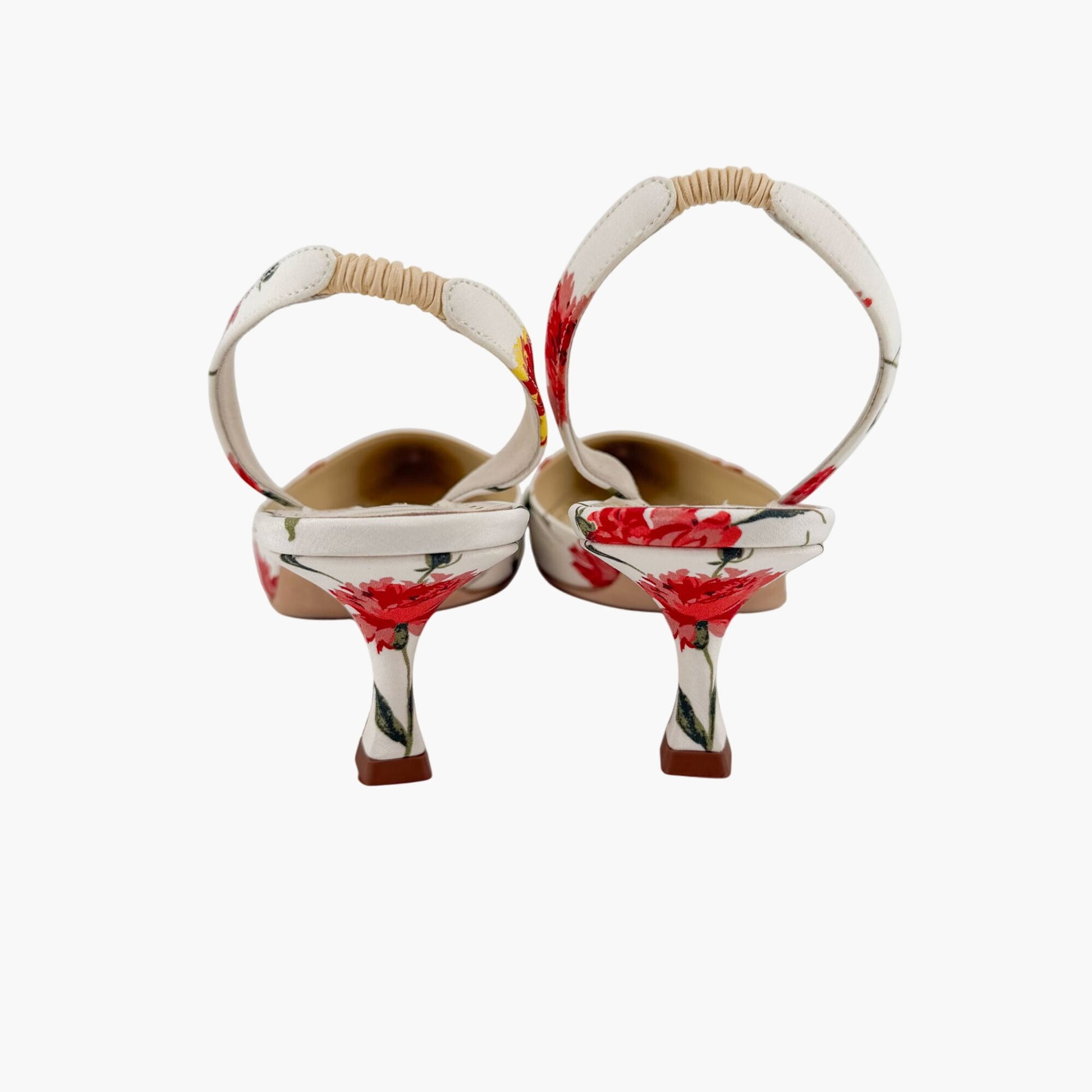 These Manolo Blahnik Carolyne 50 slingback heels feature white satin uppers printed with red and green floral patterns. Designed with pointed toes, elastic slingback straps, and low flared kitten heels, they blend feminine charm with timeless elegance — perfect for spring events, weddings, or dressy daytime occasions.
