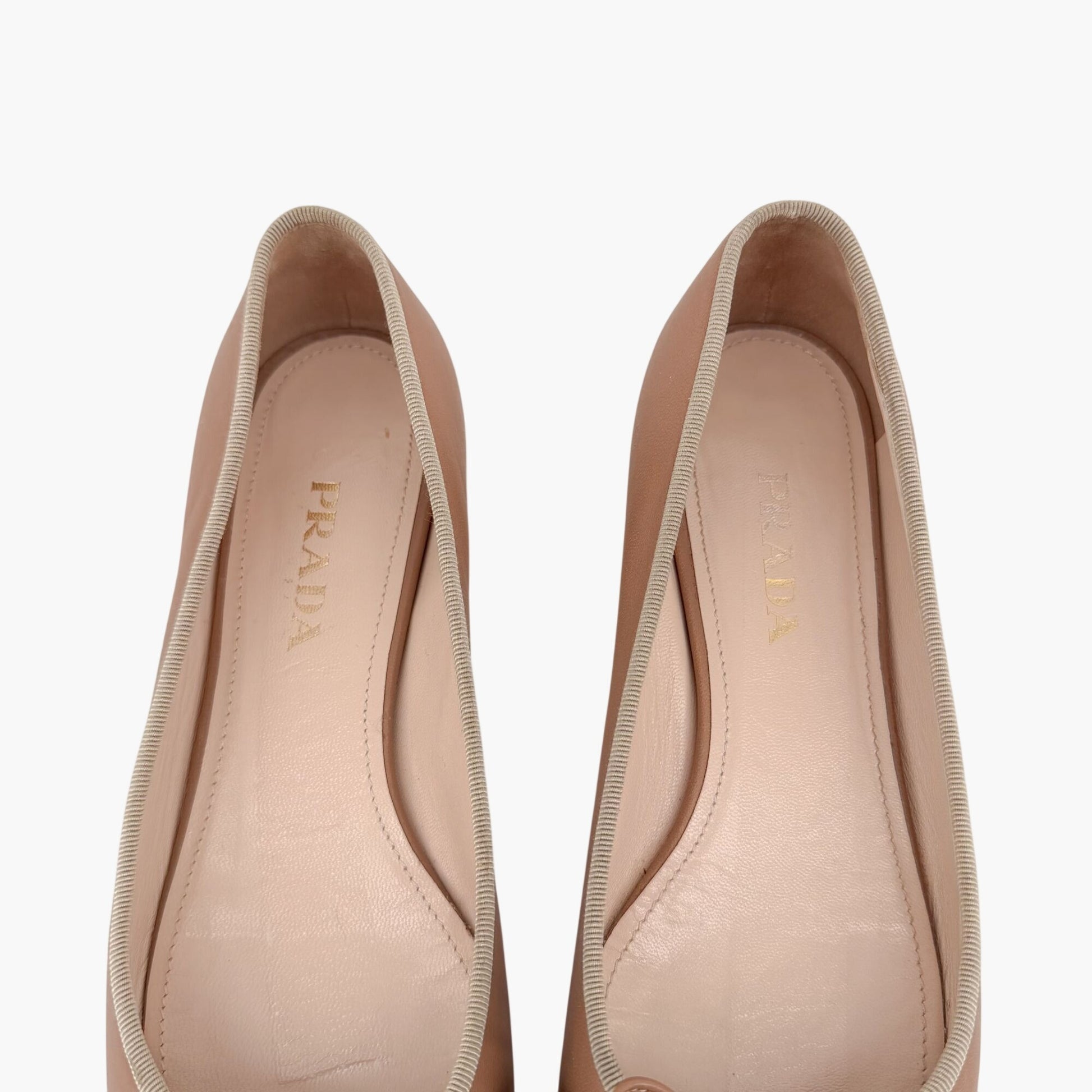 These Prada ballet flats feature beige leather uppers with black patent cap toes and bow accents at the vamp. Designed with leather lining and flat soles, they offer classic everyday styling ideal for work outfits, commuting, travel, and polished casual wear.