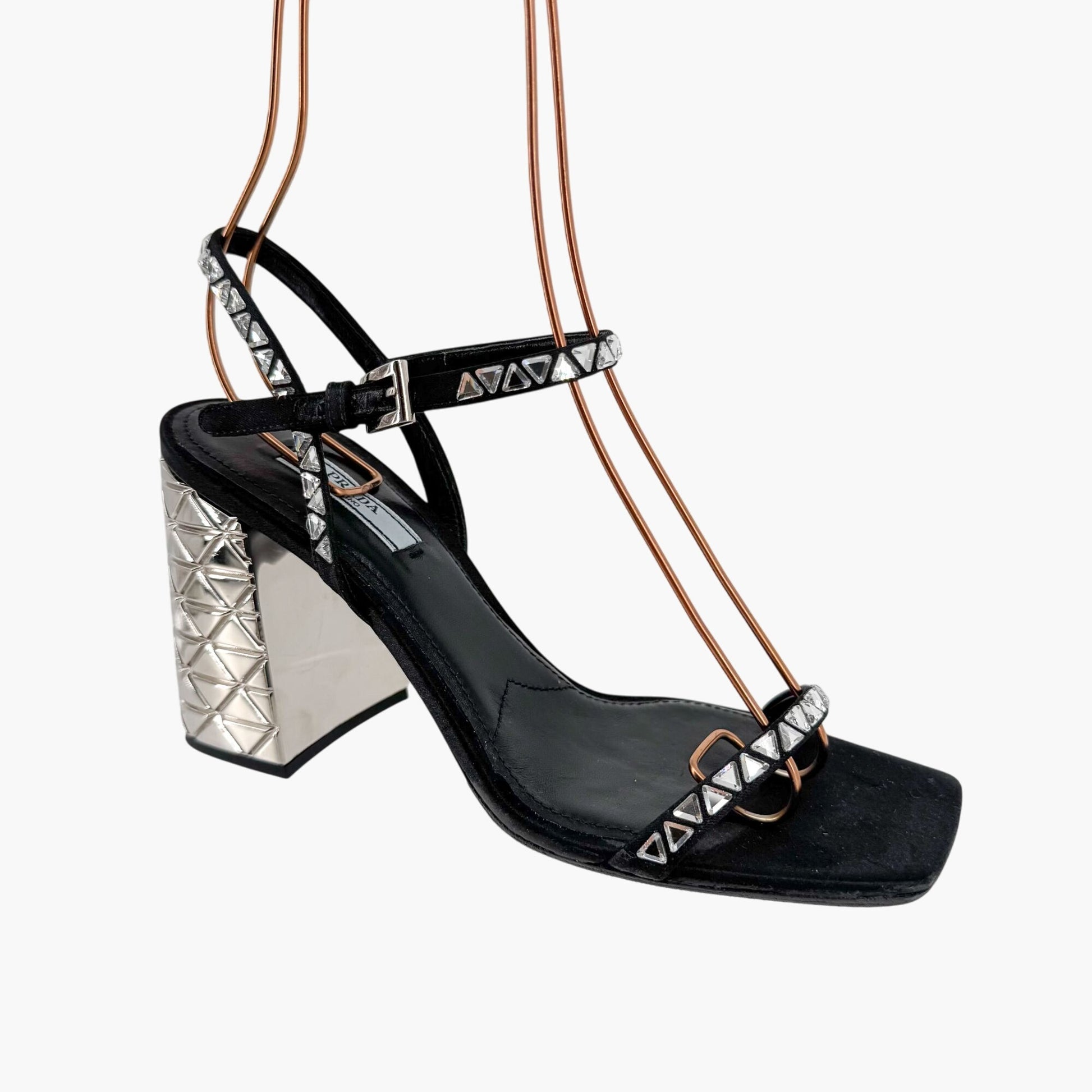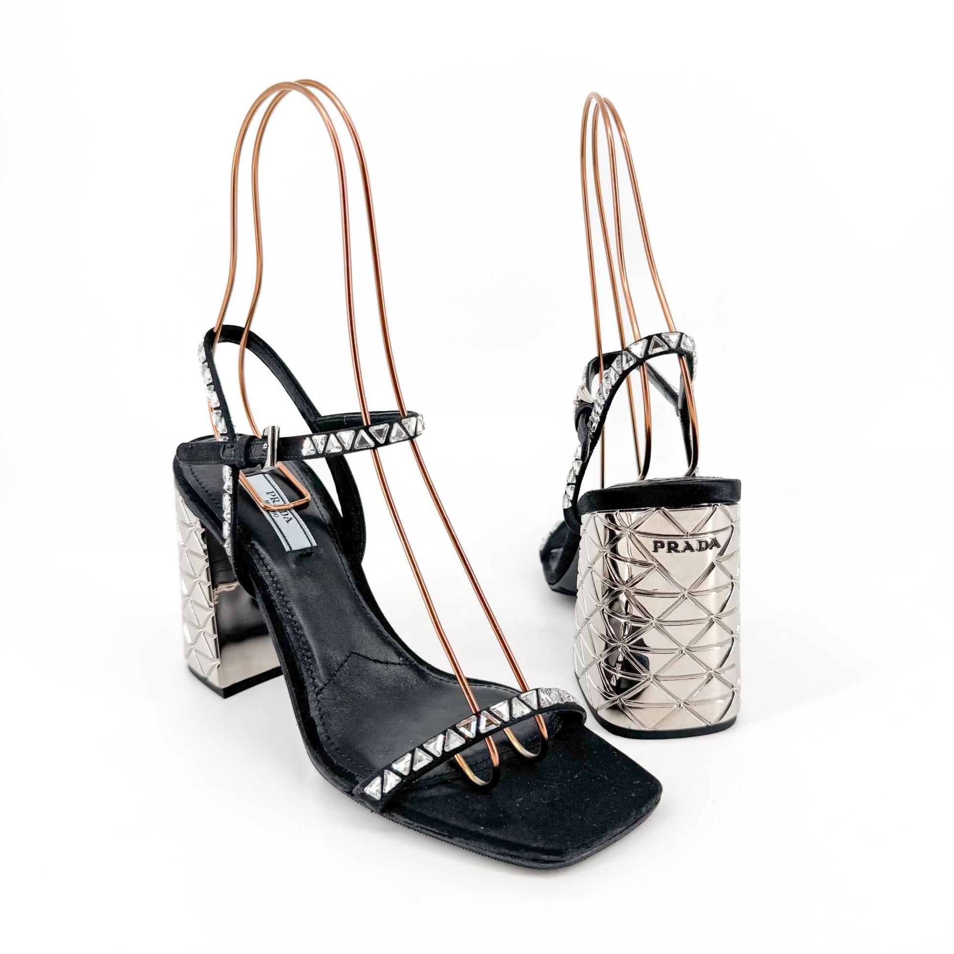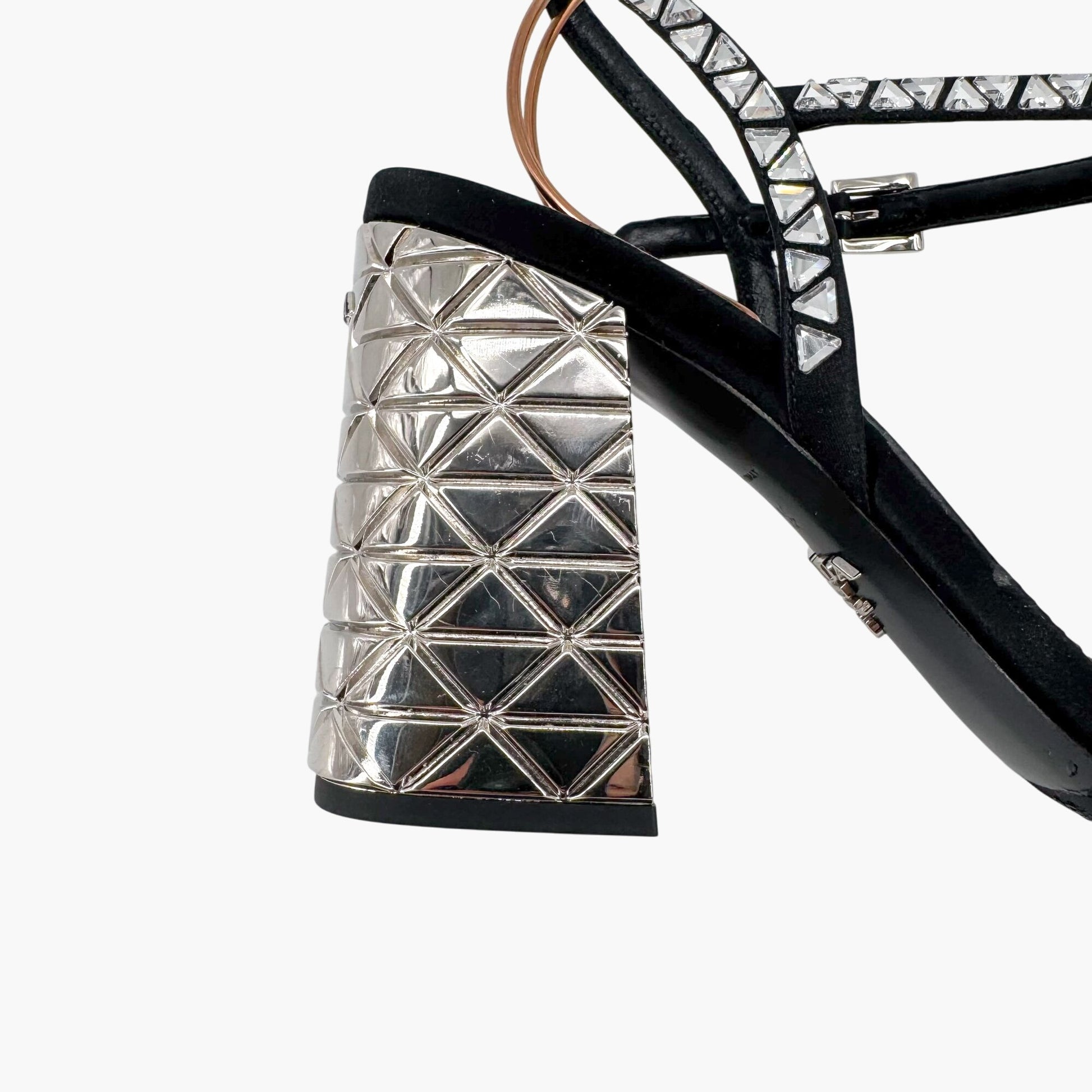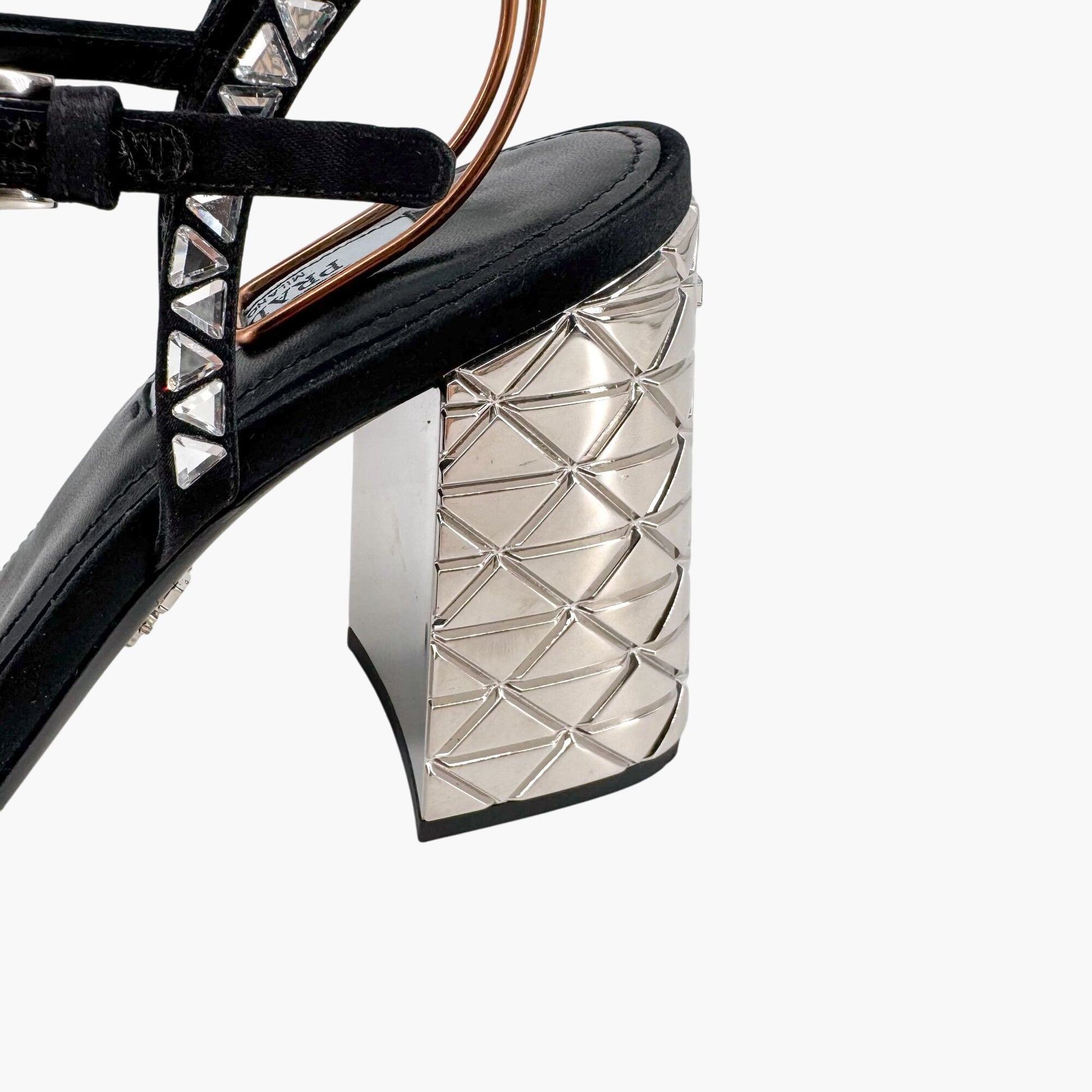 These Prada block heel sandals feature black satin straps embellished with triangle crystals for a glamorous, barely-there silhouette. Designed with an open square toe, ankle strap, and high silver block heel detailed with a triangle logo and geometric accents, they add modern sparkle to evening and occasion looks.