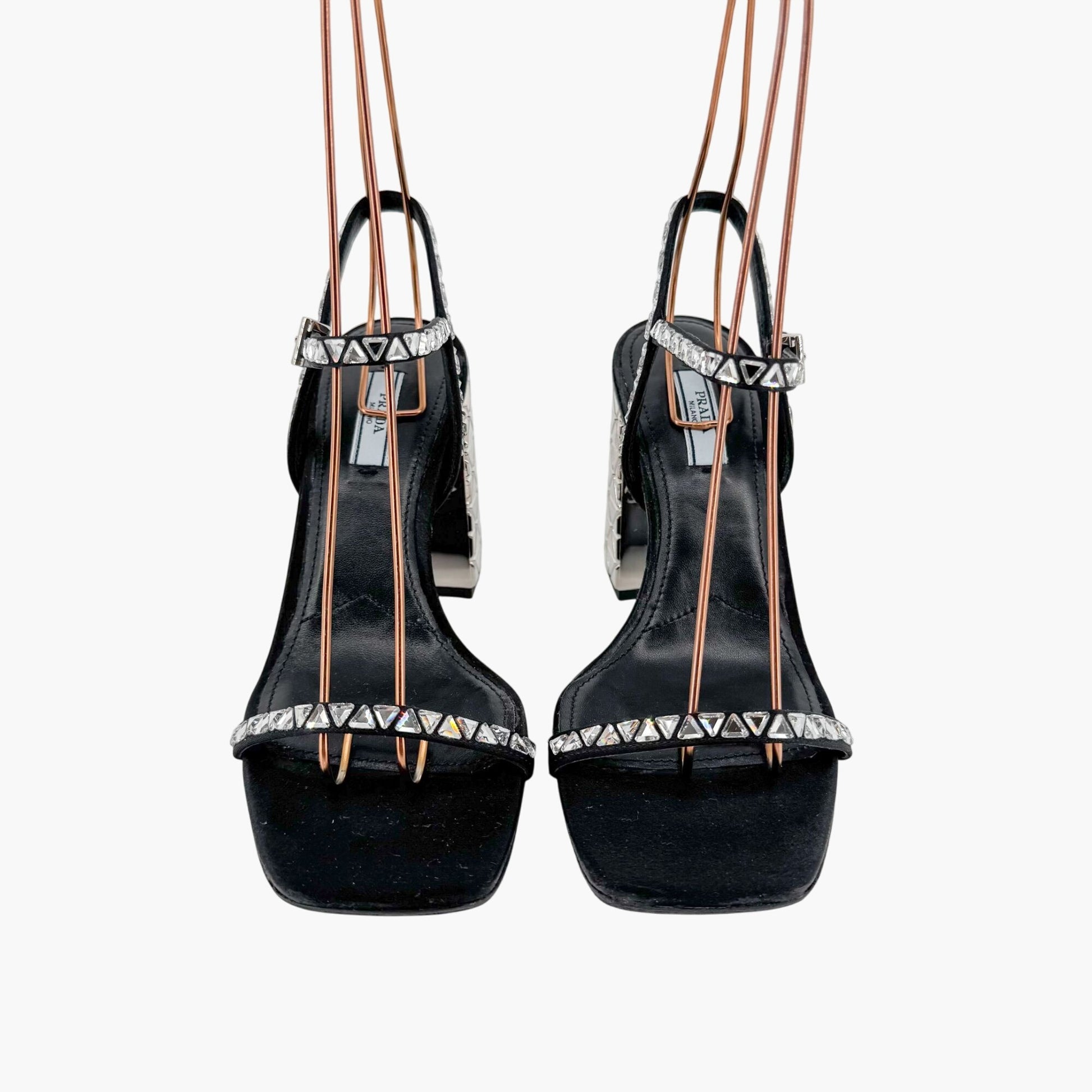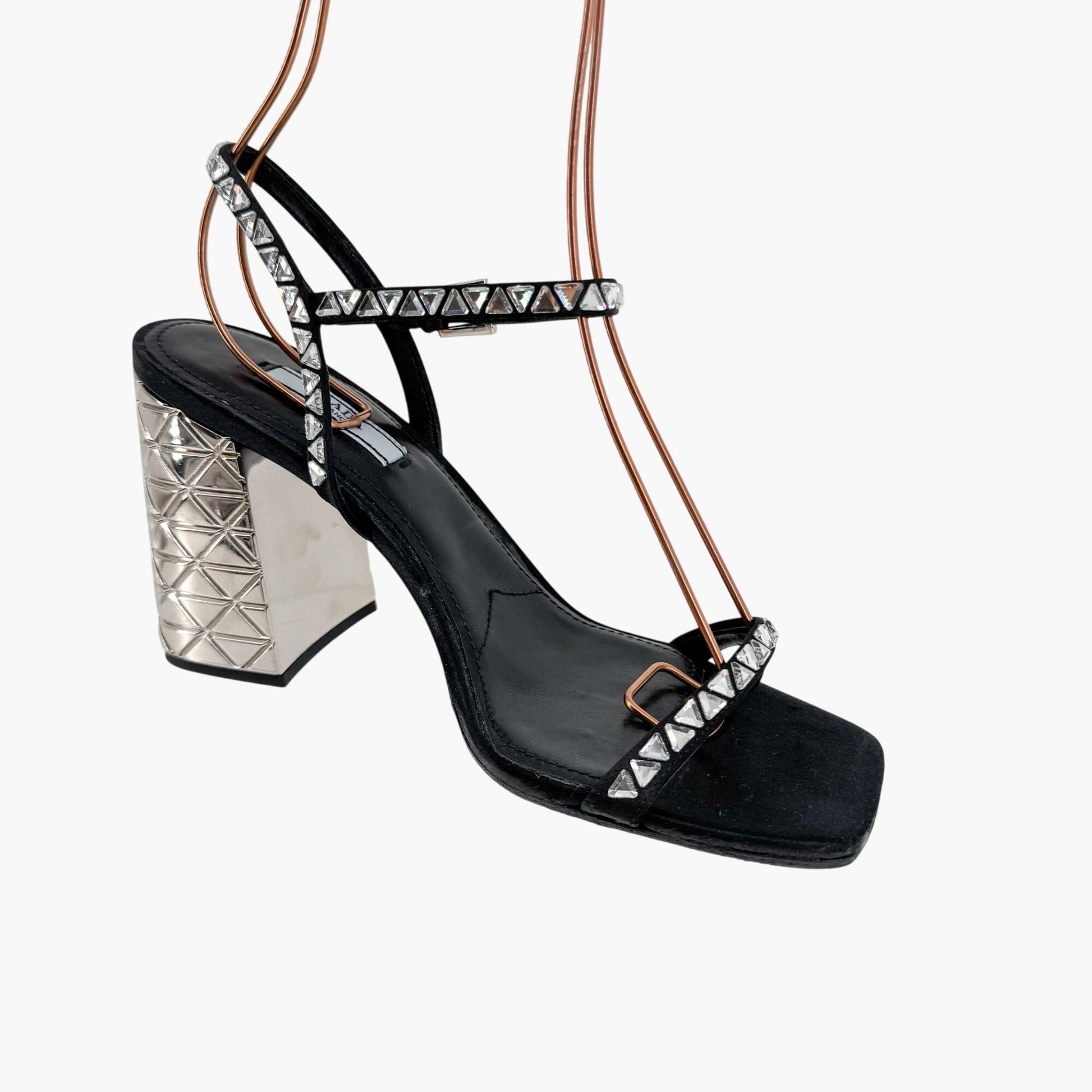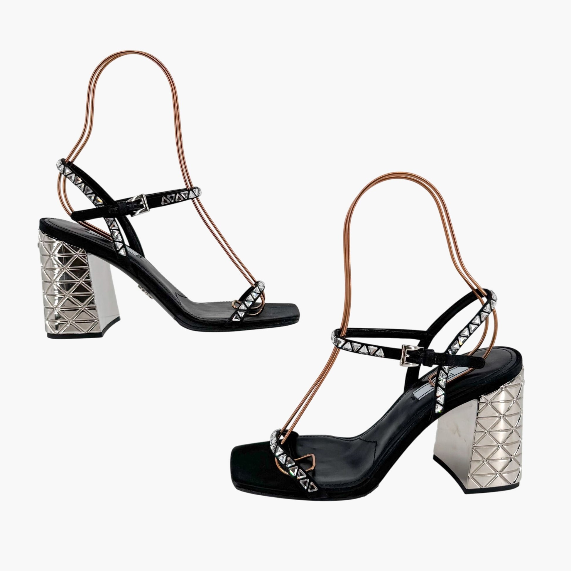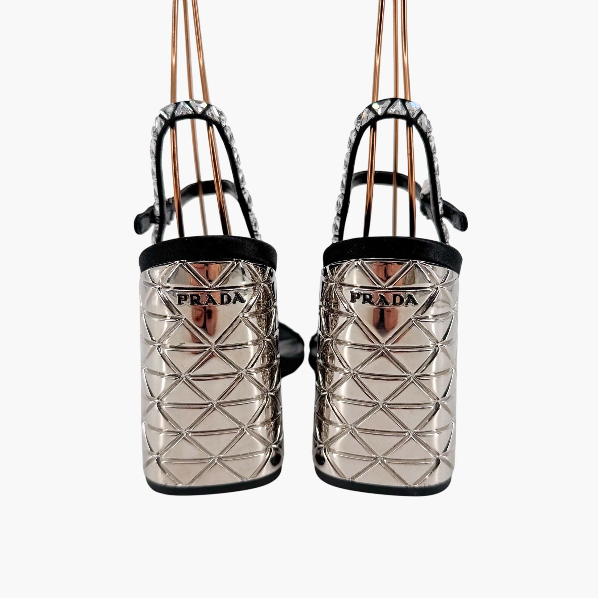 These Prada block heel sandals feature black satin straps embellished with triangle crystals for a glamorous, barely-there silhouette. Designed with an open square toe, ankle strap, and high silver block heel detailed with a triangle logo and geometric accents, they add modern sparkle to evening and occasion looks.