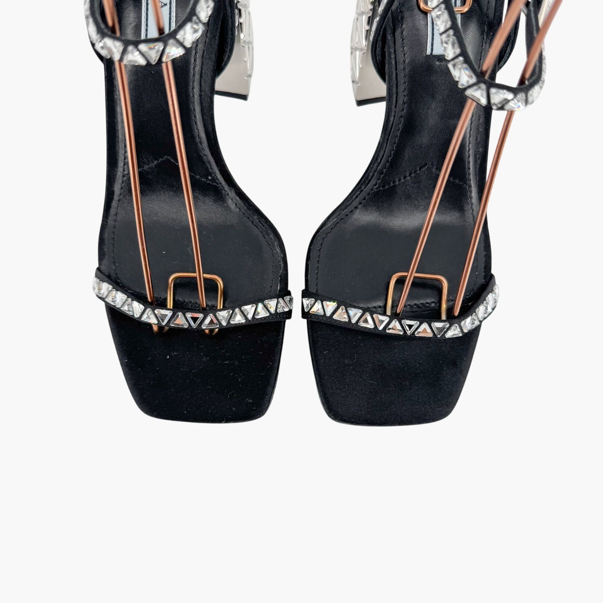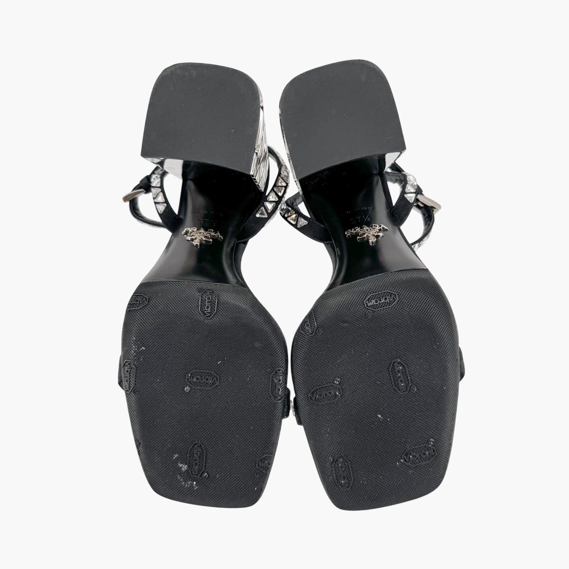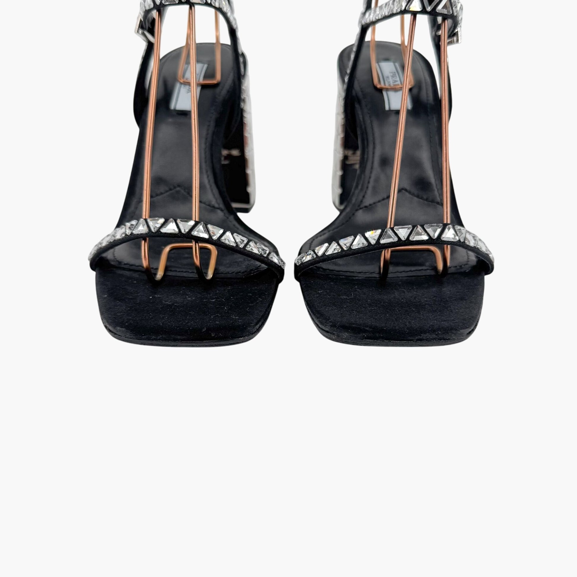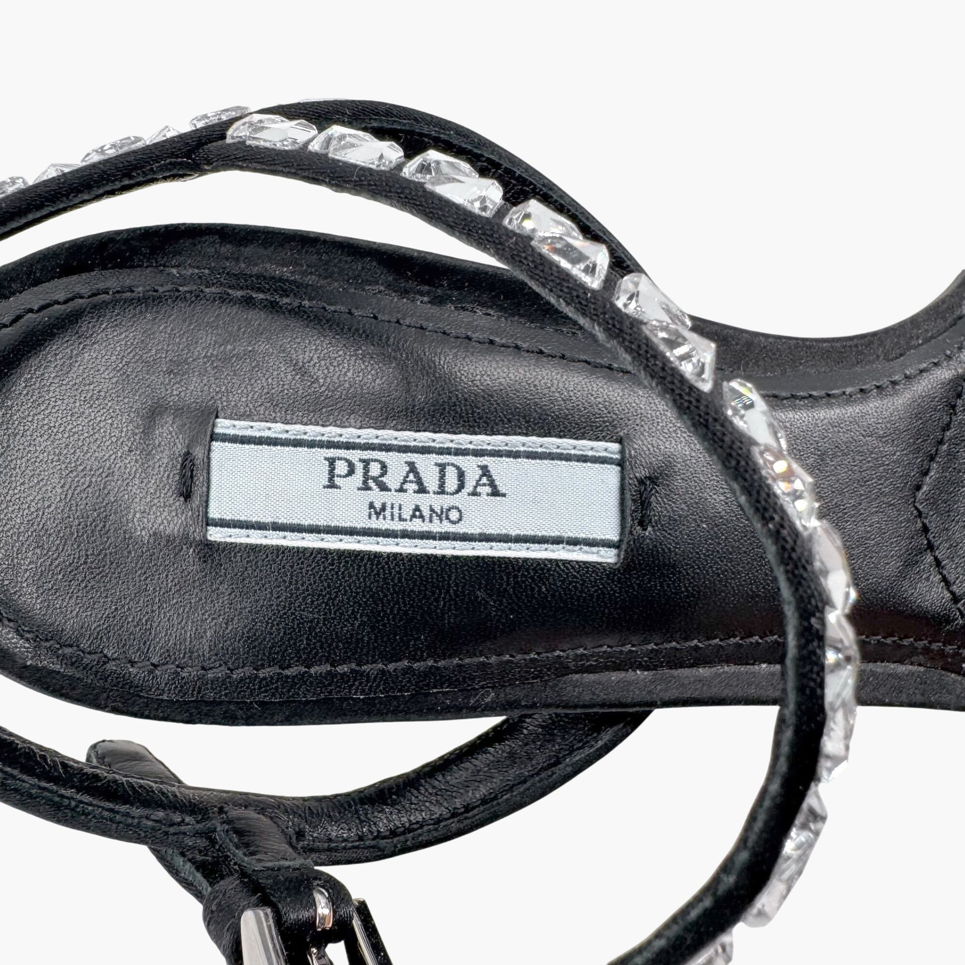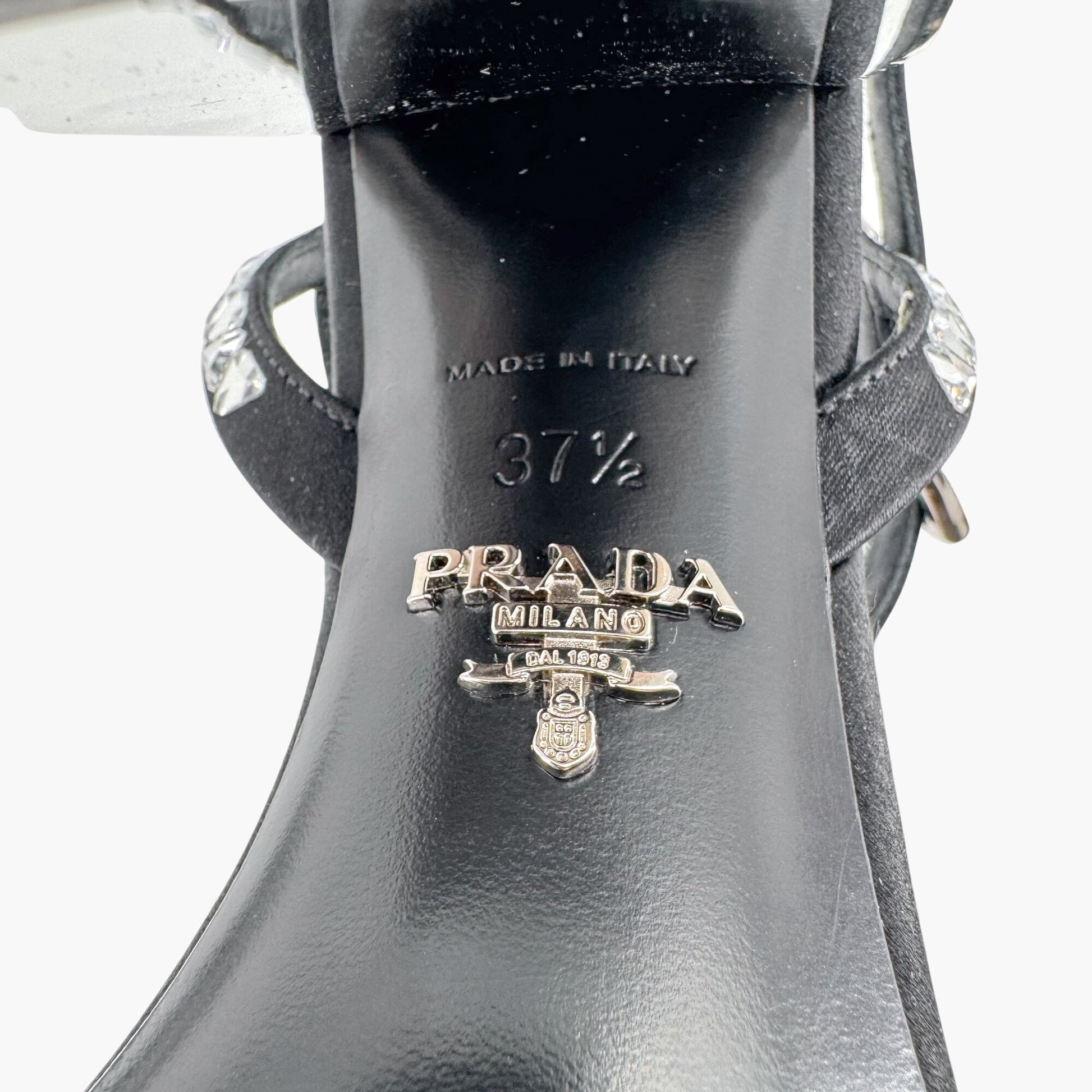 Prada Crystal Embellished Block Heel Sandals in Black Satin – Size 37.5