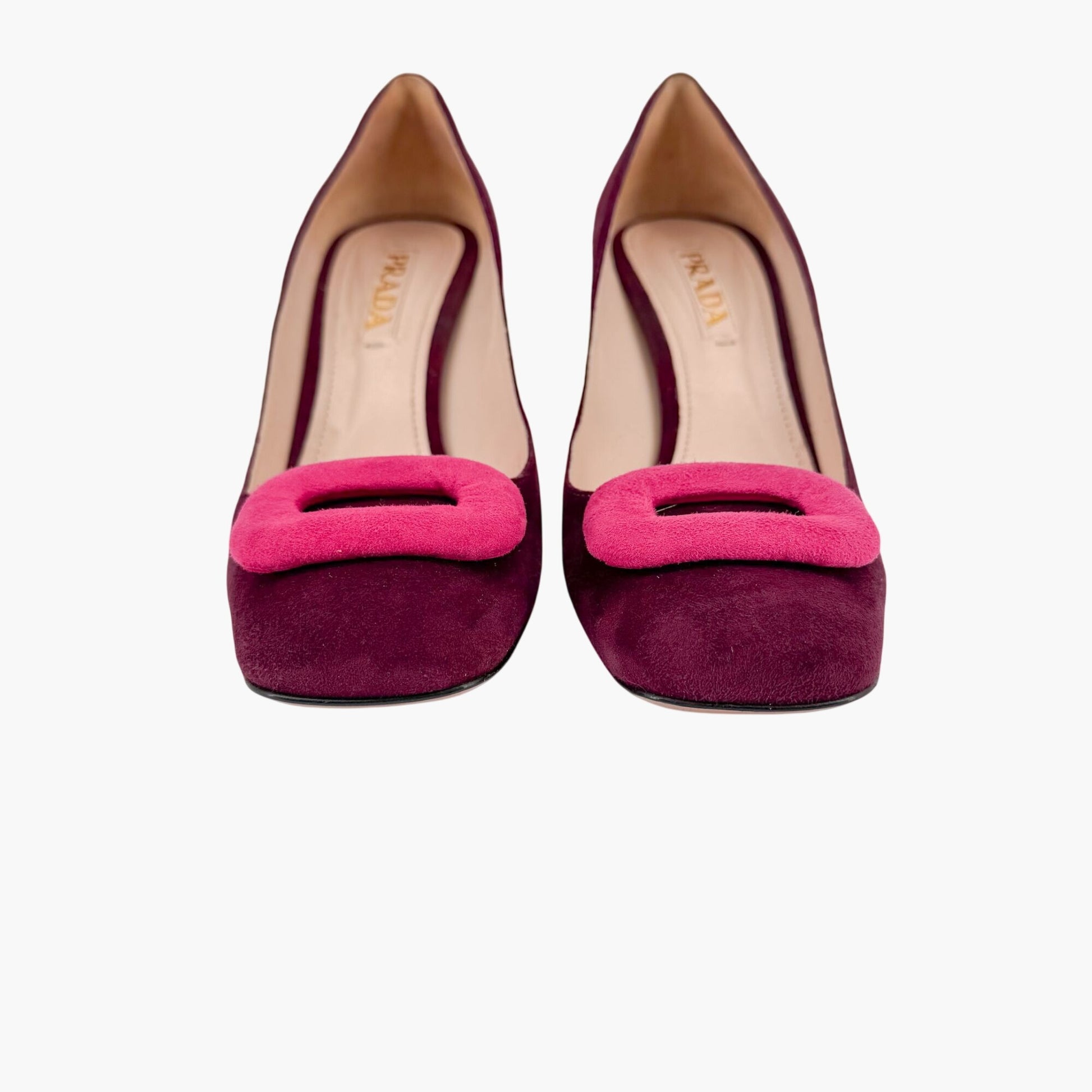 These Prada two-tone pumps feature rich maroon suede with bold magenta accents across the square toe and block heel. The slip-on silhouette is finished with a rectangular buckle-style detail on the toe and a structured block heel, creating a modern designer pump suited for professional styling or elevated everyday wear.