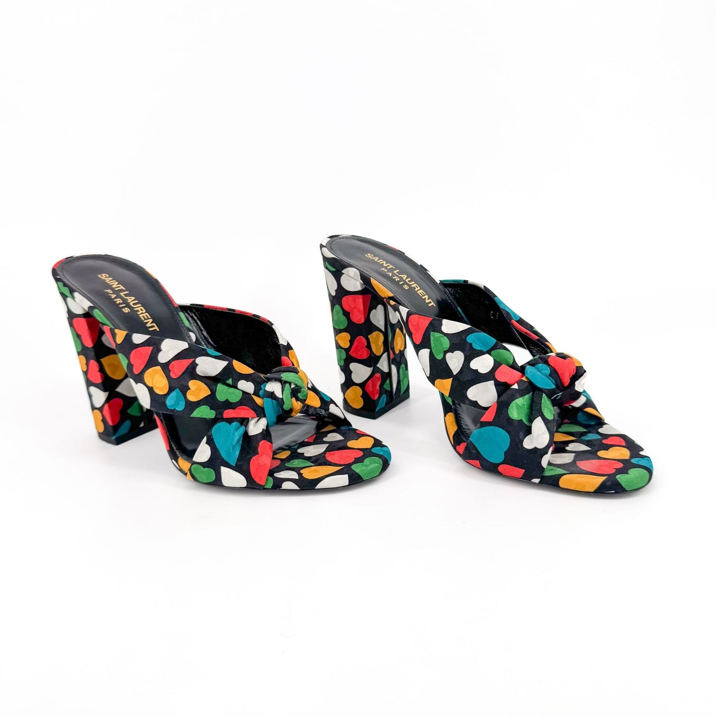 Saint Laurent Bianca 100 Mule Sandals in Black Satin with Heart Print – Size 38.5