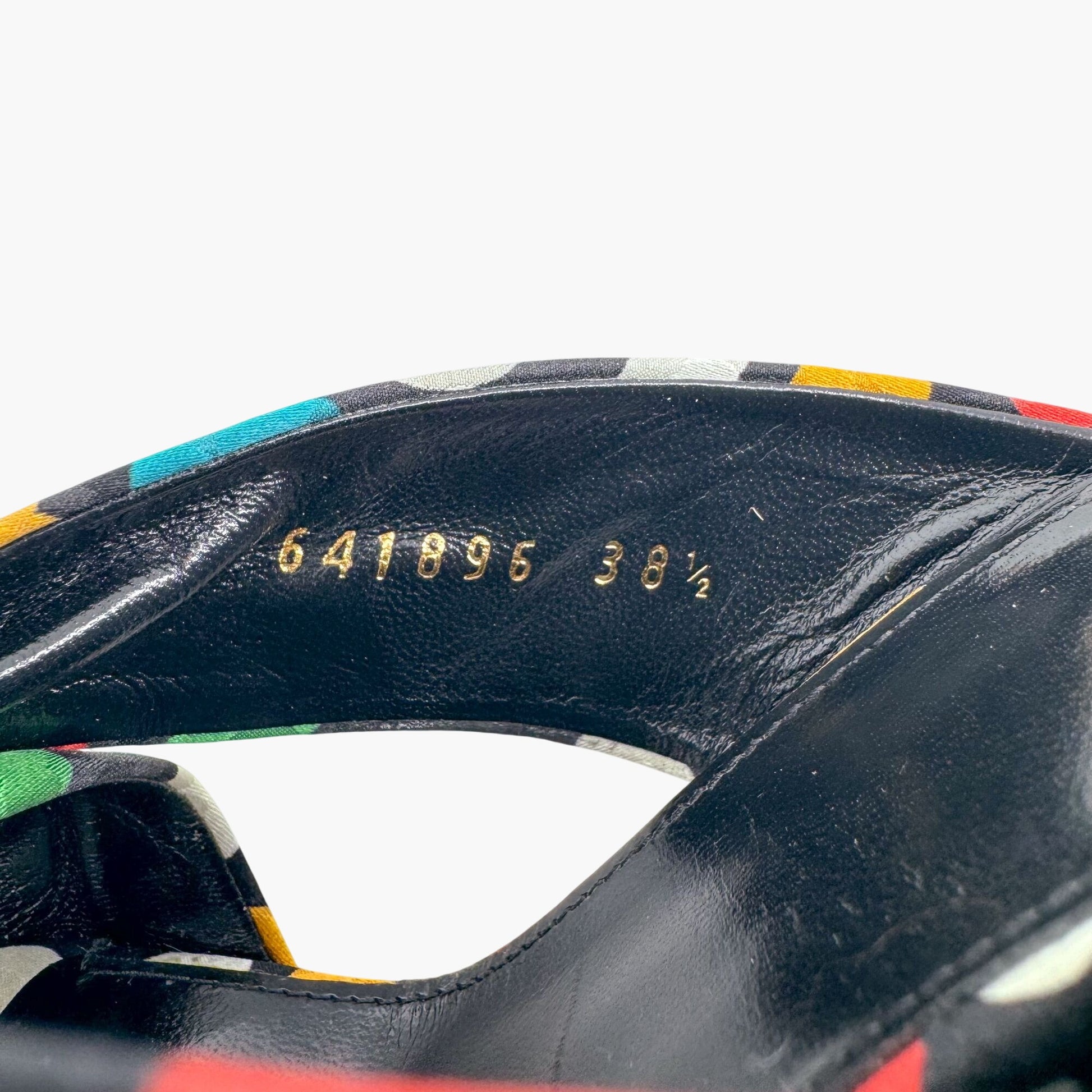These Saint Laurent Bianca 100 mule sandals feature black satin uppers with a playful multicolor heart print. Designed with a knotted strap, open round toe, and high block heel, they bring a fun yet sophisticated edge to summer outfits, resort wear, or evening looks.