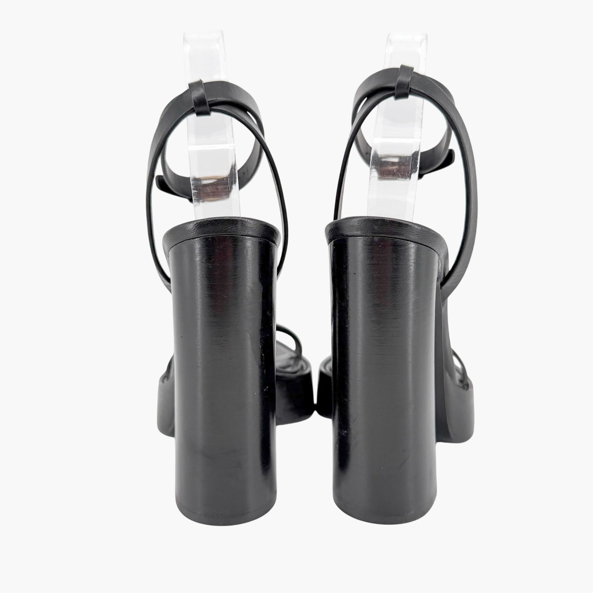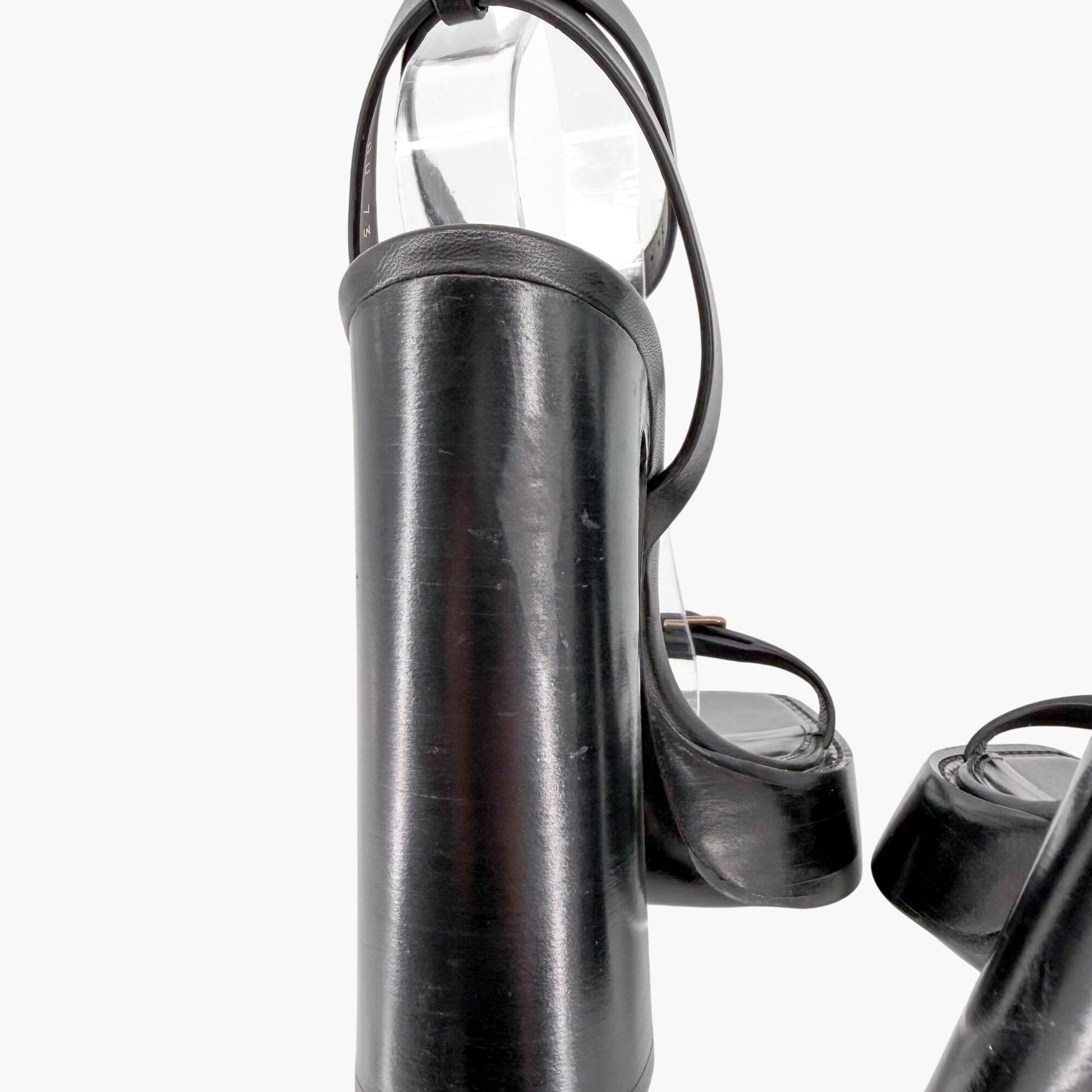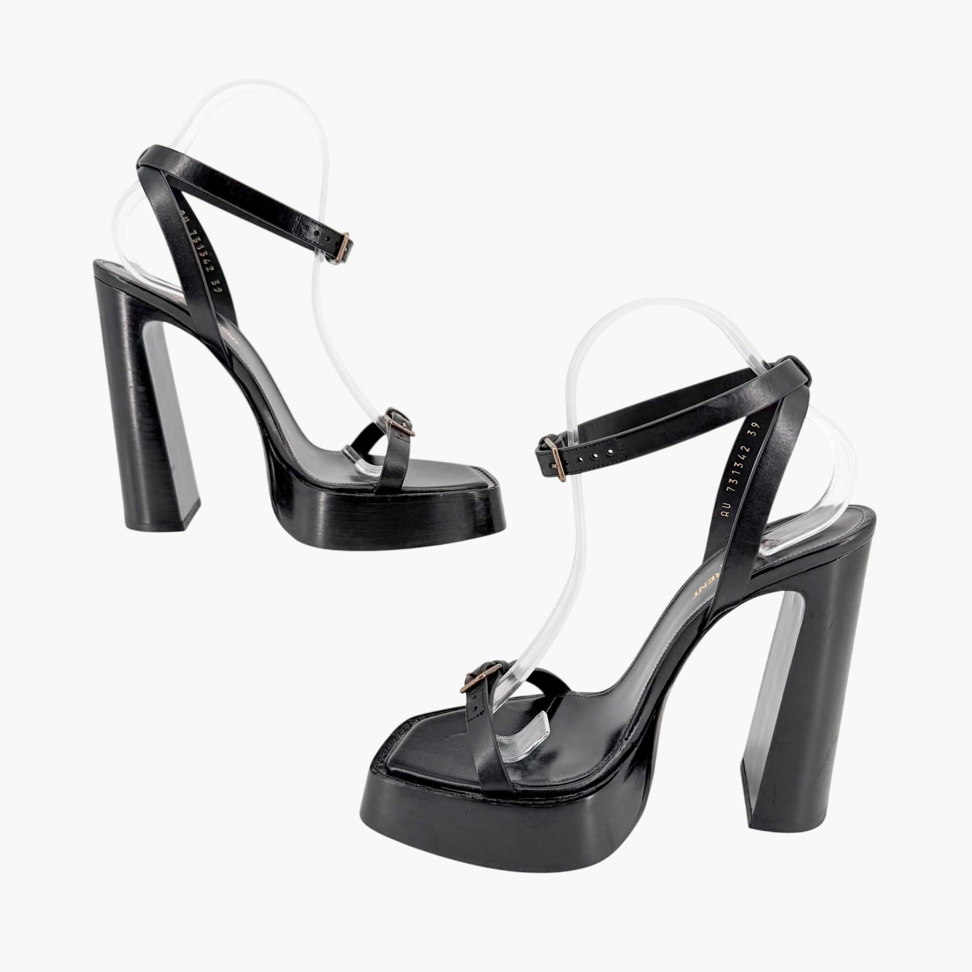 These Saint Laurent Platz platform sandals feature sleek black leather straps with a minimal “barely there” silhouette. A thin strap across the top of the foot and ankle wrap strap with buckle closure create a secure, streamlined fit. The high stacked block heel and chunky platform deliver dramatic lift, making this pair ideal for evening wear, events, or bold minimalist styling.