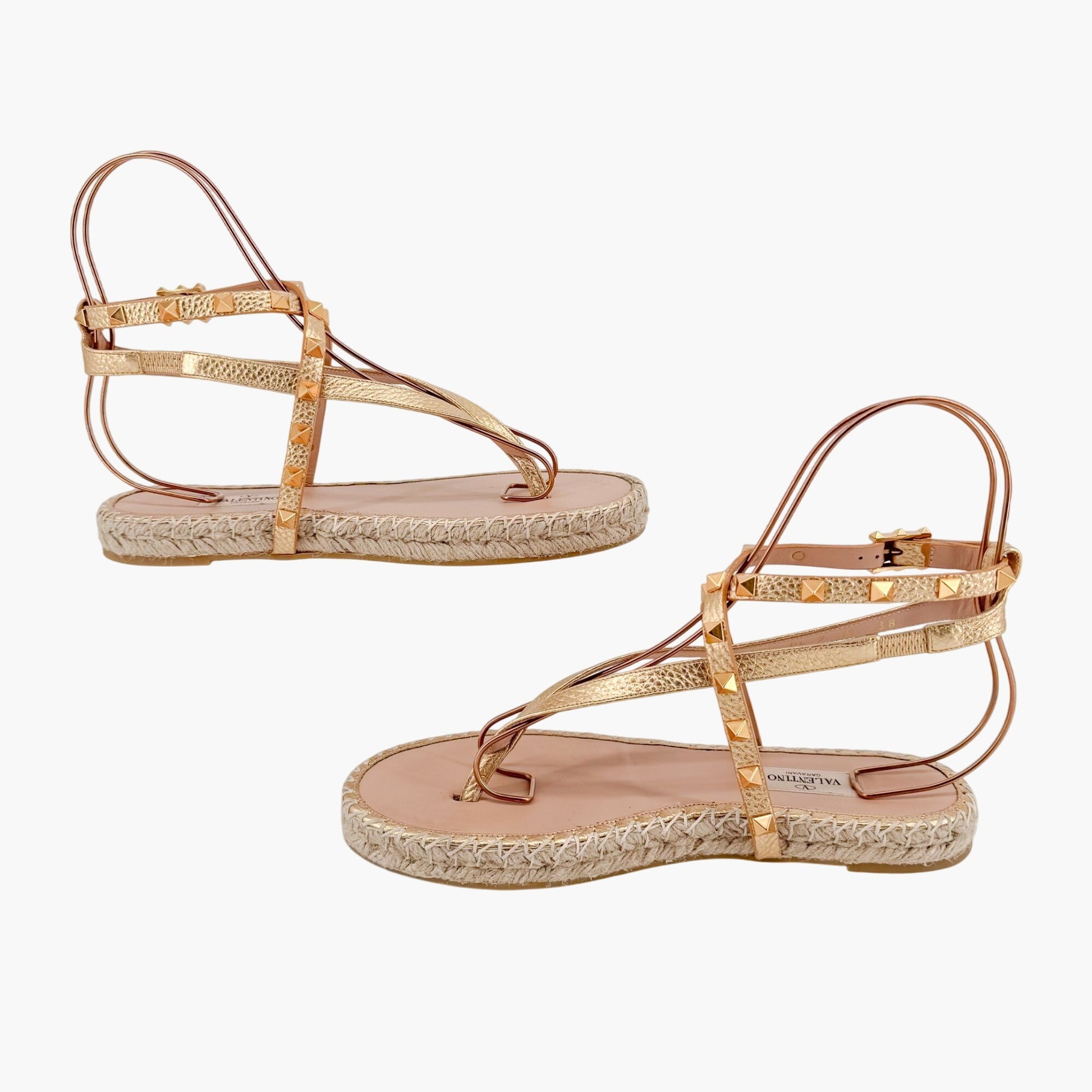 Valentino Garavani Rockstud Espadrille Thong Sandals in Metallic Gold Pebbled Leather Size 38